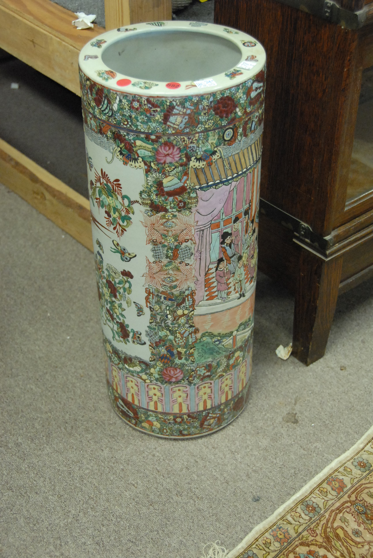 Two piece lot silk Oriental rug as is 2’6 x 3’5 and porcelain umbrella holder.
