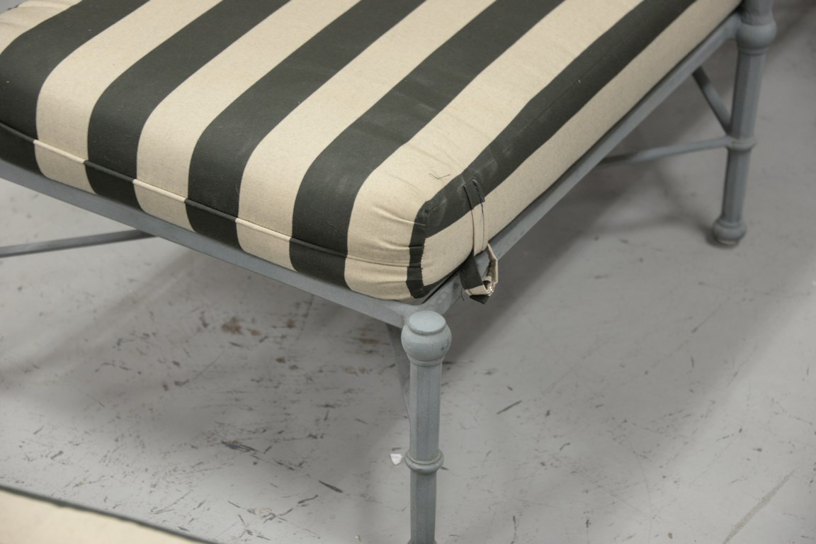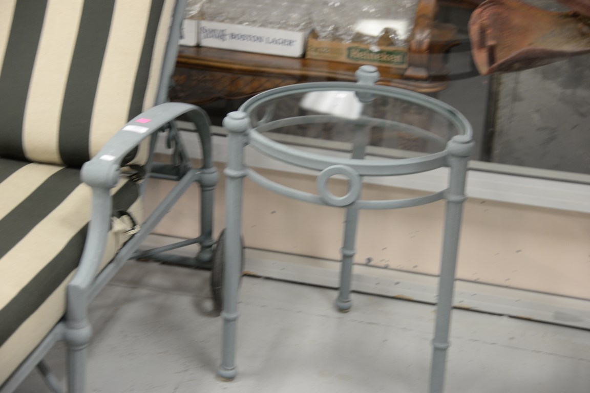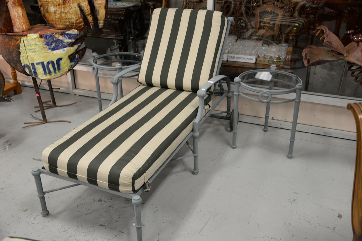 Lot 278: Woodard three piece lot including chaise with clean cushion and two glass top tables. chaise lg. 74 in.