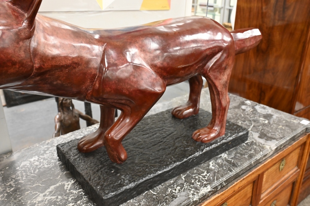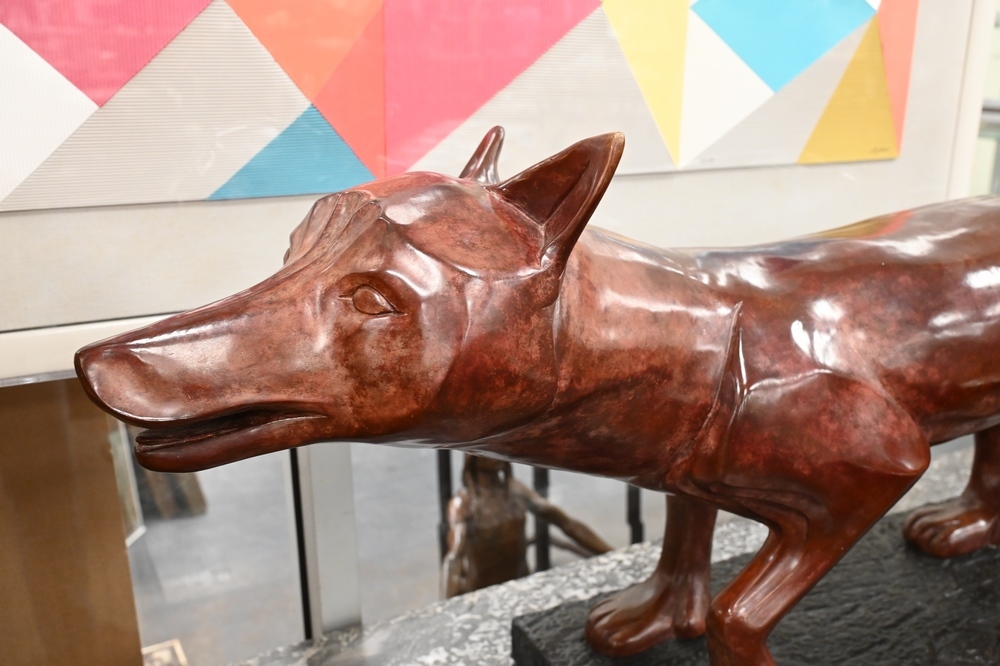 Lot 278B: Large Bronze Sculpture, fox in stalking pose with one foot up, Metropolitan Galleries copy, height 22 inches, length 48 inches, width 13 inches.