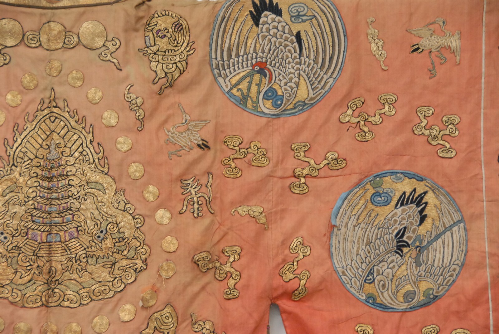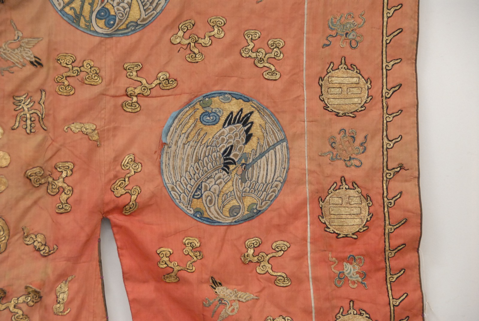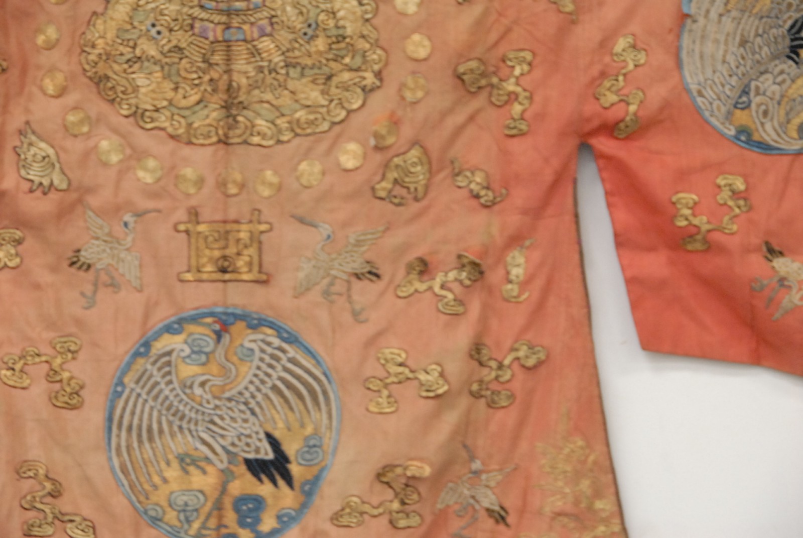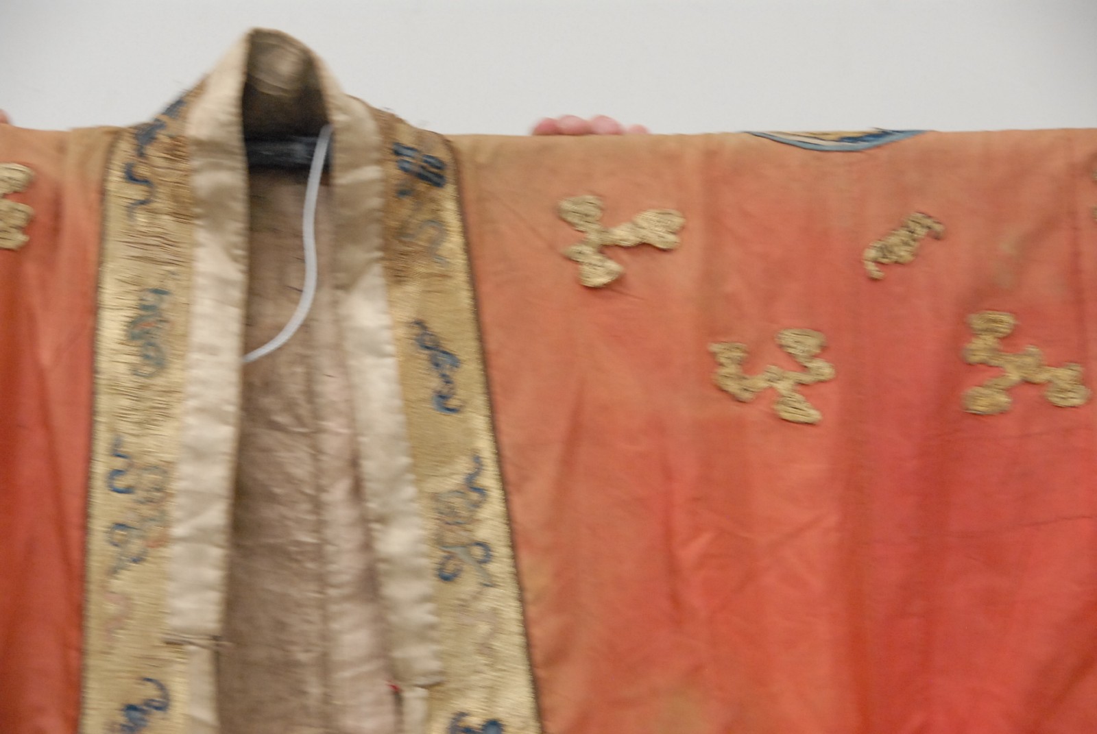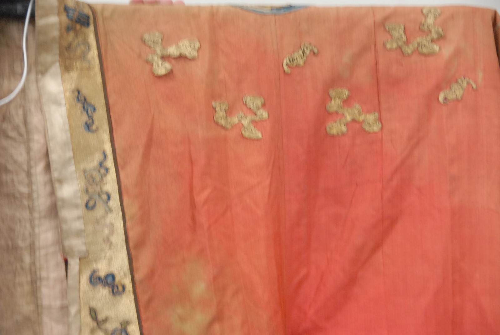 A pale red ground Daoist priest robe, the back having a central pagoda flanked by 2 dragons, surrounded by auspicious symbols roundels, flying cranes and 5 circle panels of flying cranes. 18th century – 19th century along with a child’s robe.