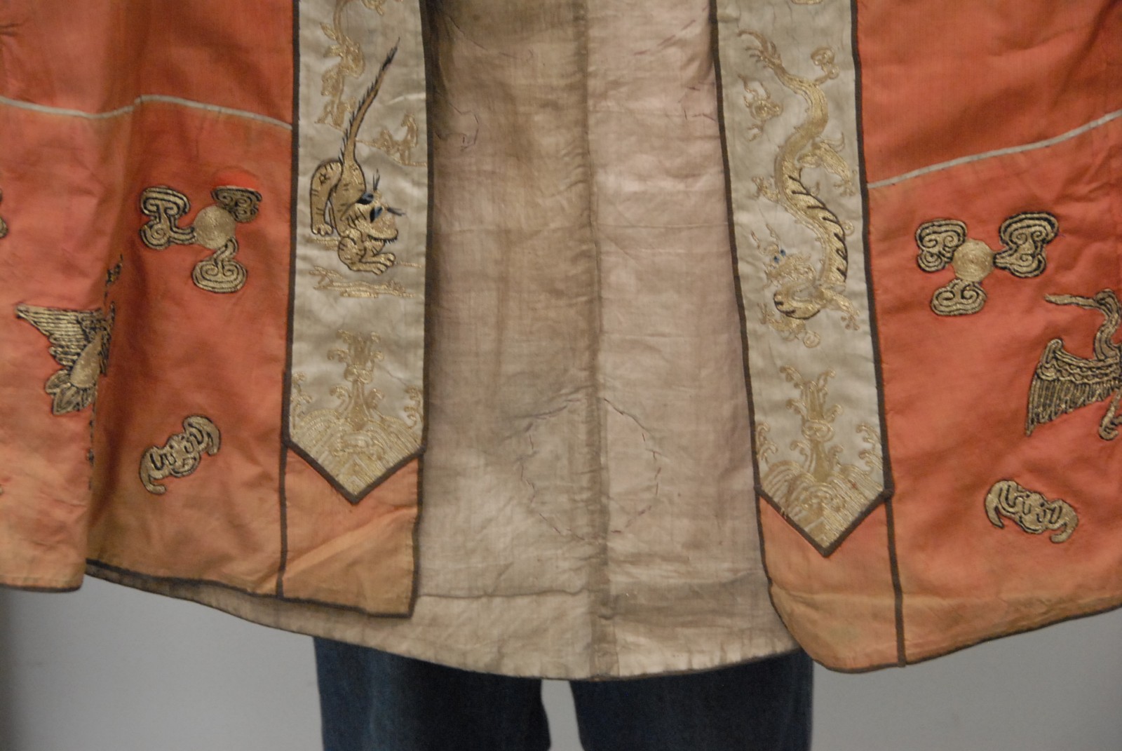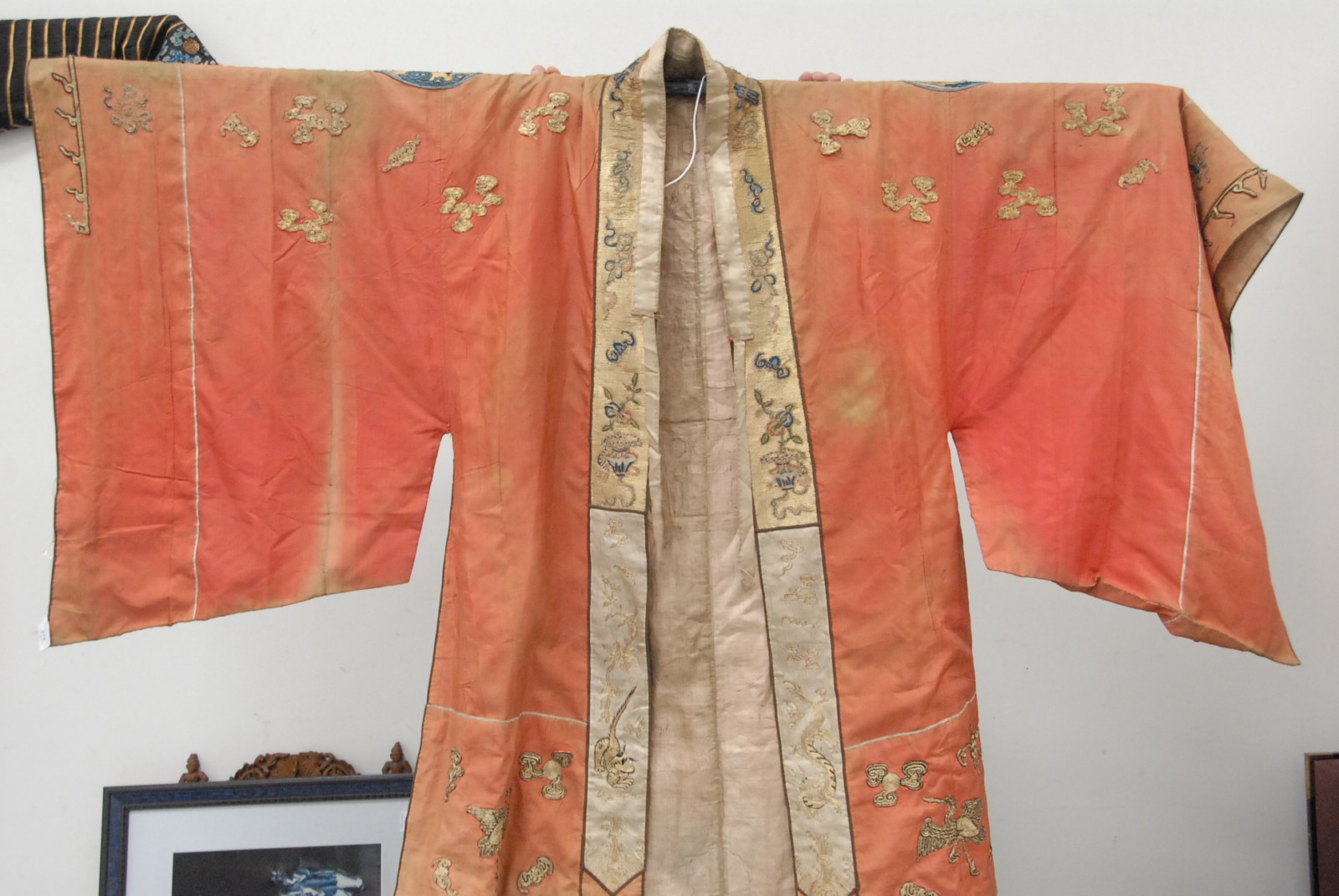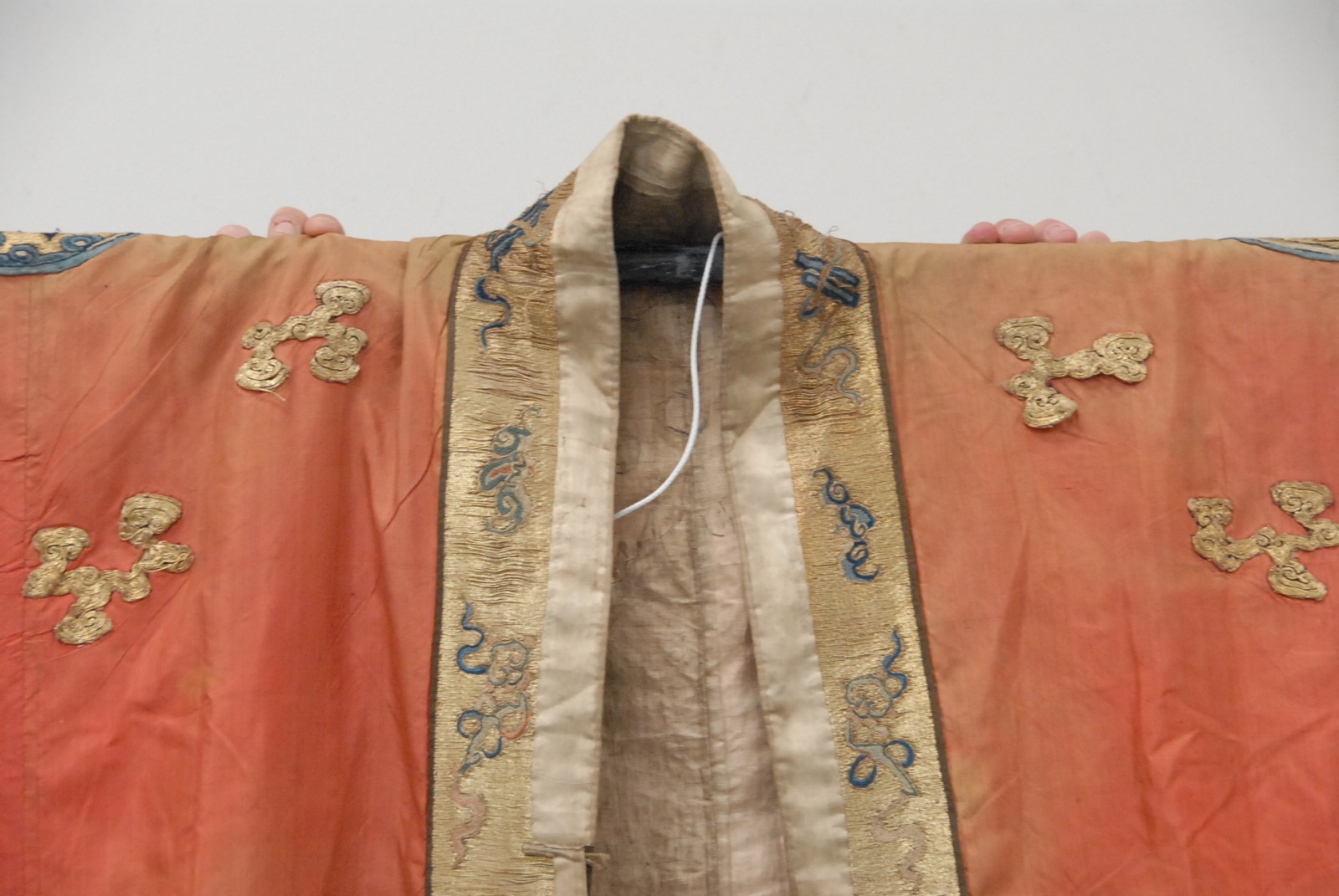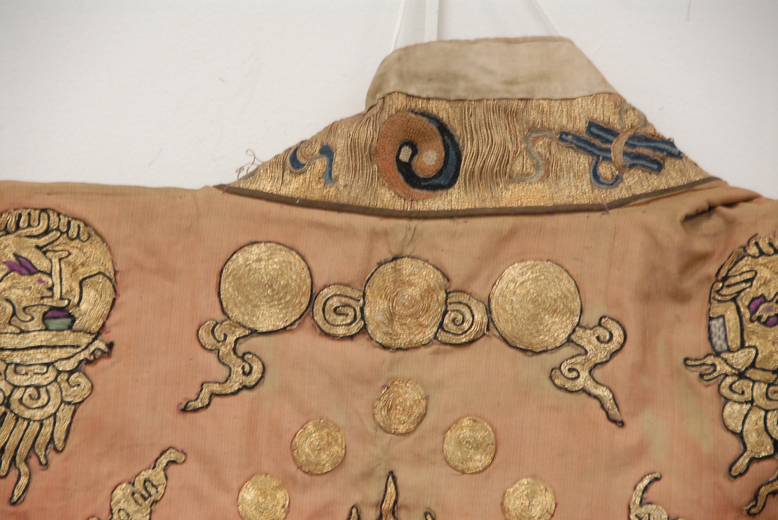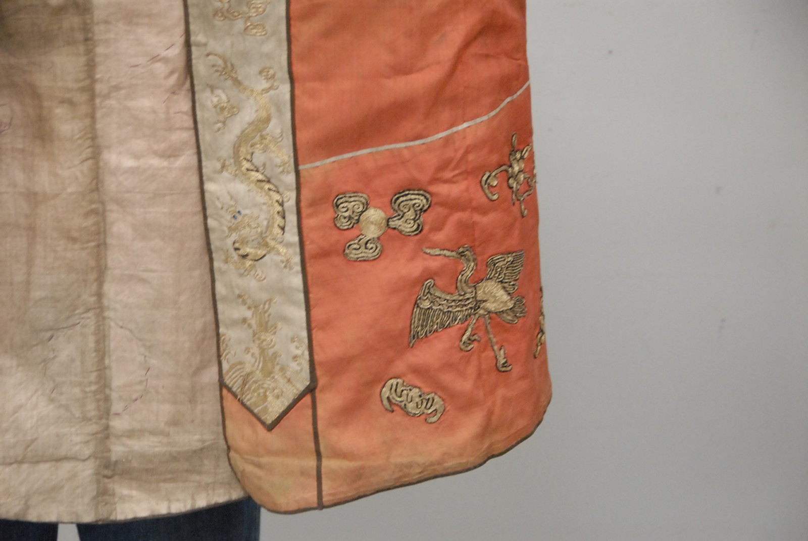 A pale red ground Daoist priest robe, the back having a central pagoda flanked by 2 dragons, surrounded by auspicious symbols roundels, flying cranes and 5 circle panels of flying cranes. 18th century – 19th century along with a child’s robe.