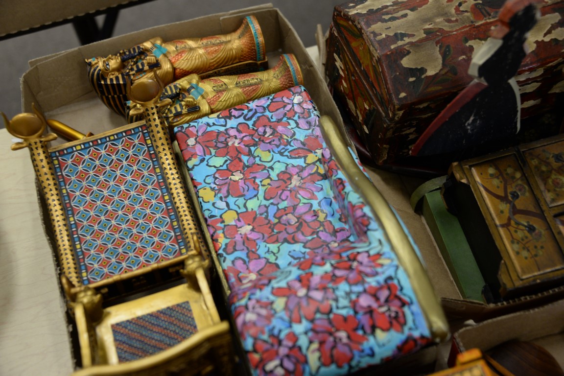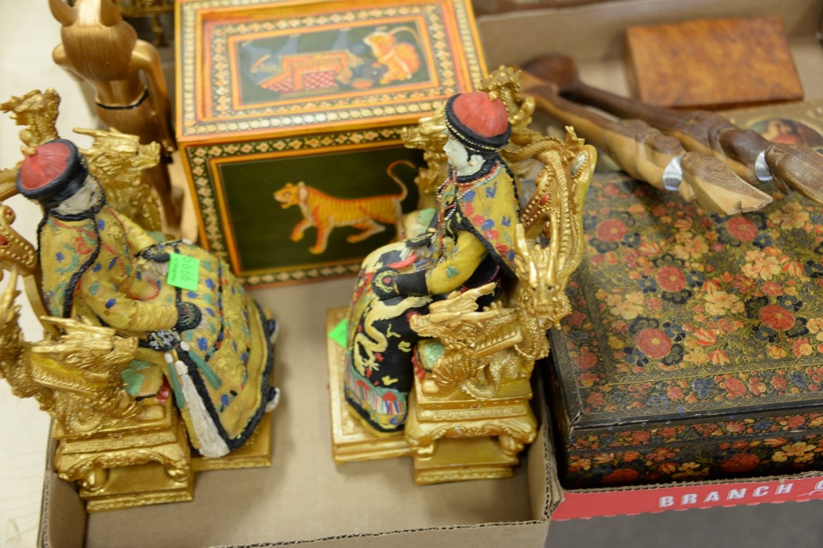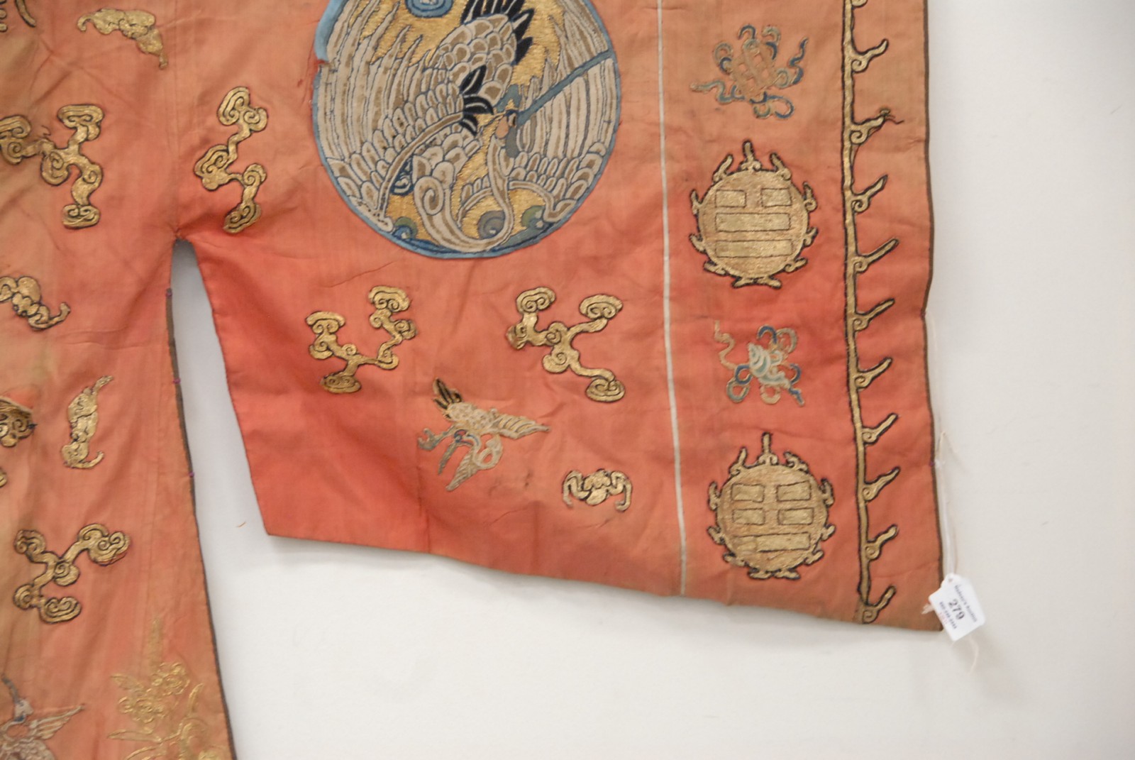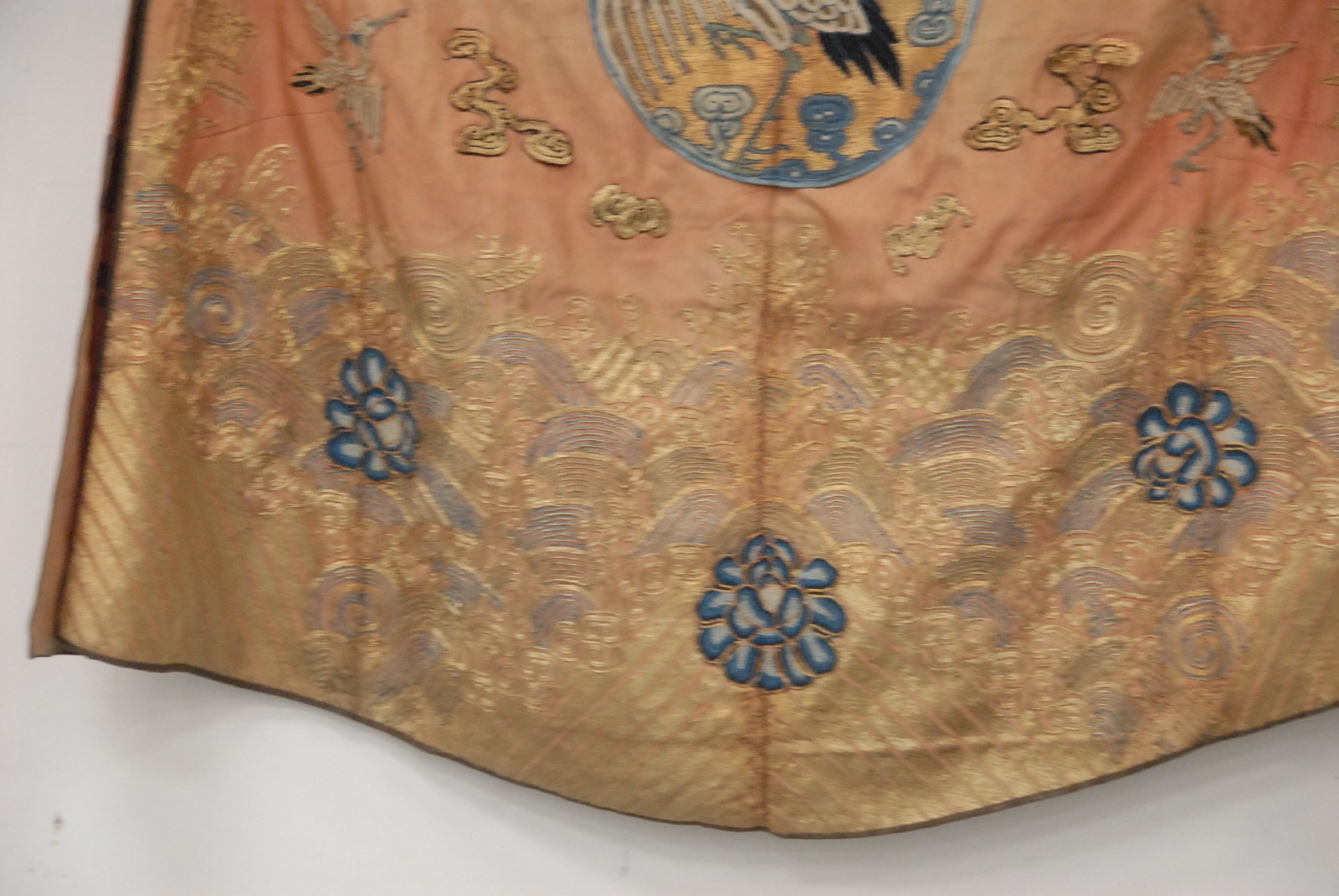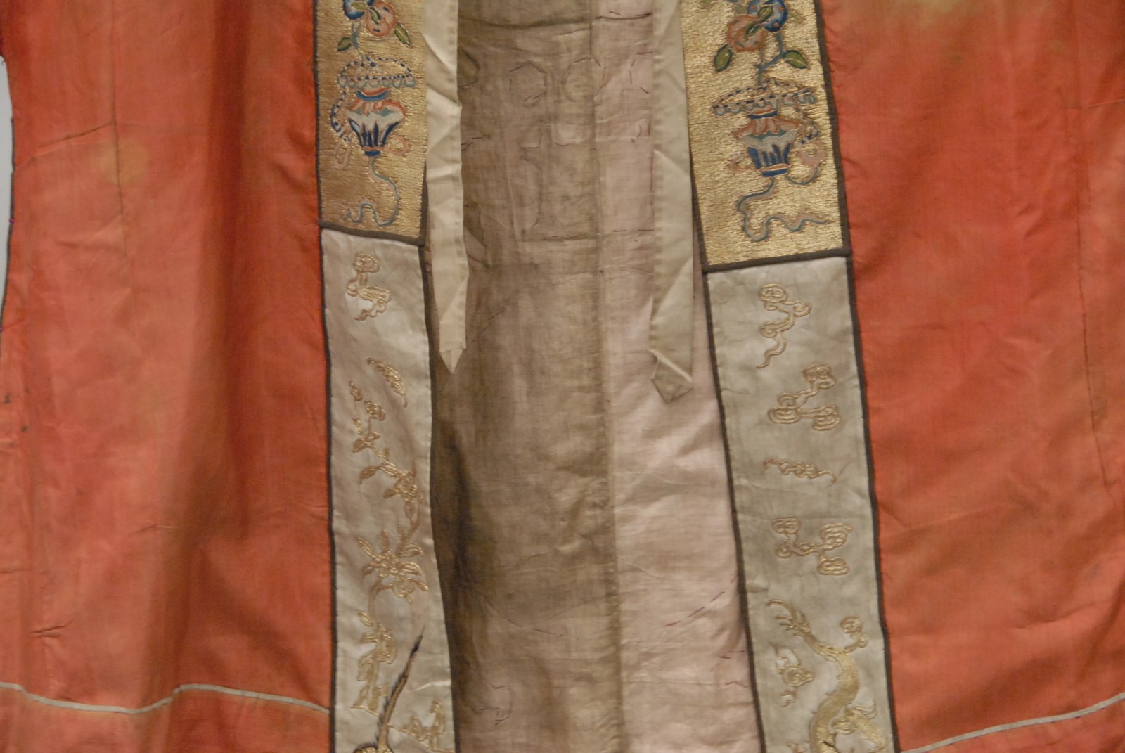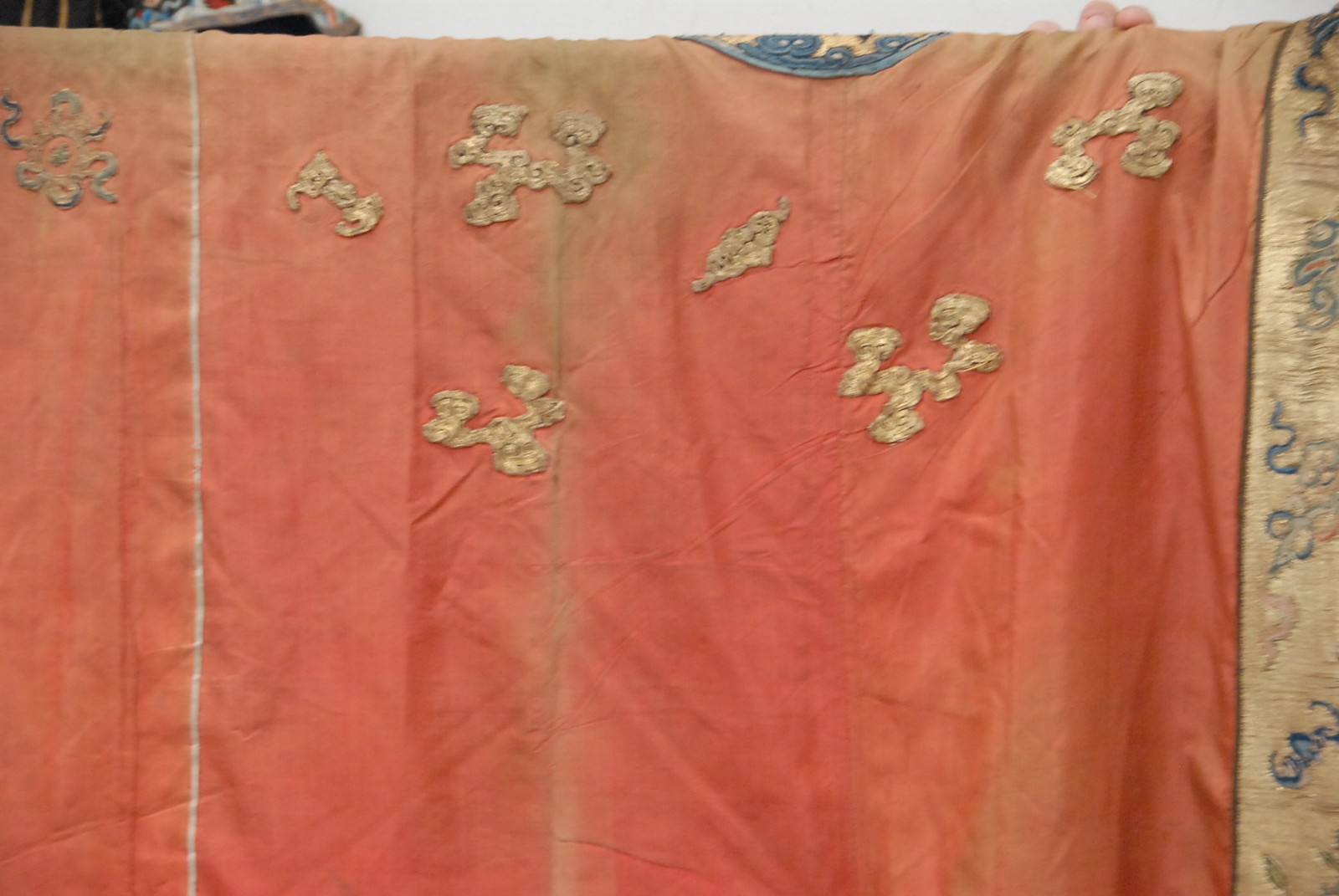A pale red ground Daoist priest robe, the back having a central pagoda flanked by 2 dragons, surrounded by auspicious symbols roundels, flying cranes and 5 circle panels of flying cranes. 18th century – 19th century along with a child’s robe.