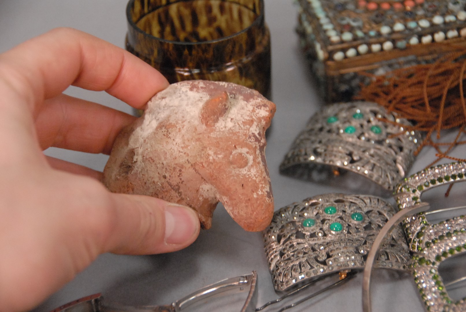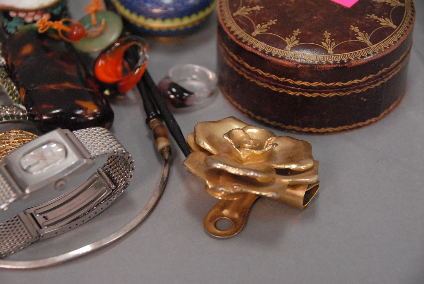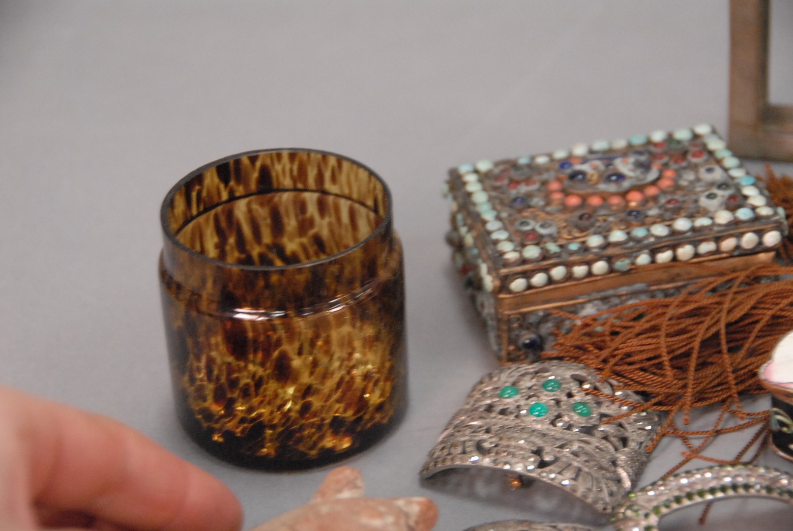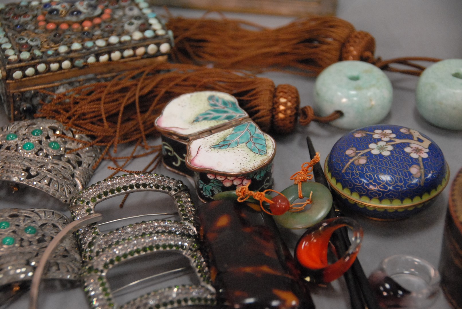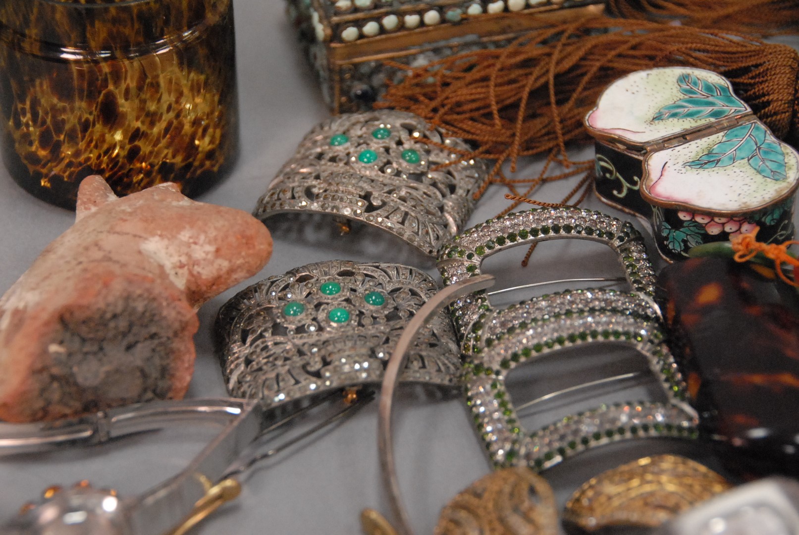 Box lot to include curios, three pairs of shoe buckles, jewelry, etc.