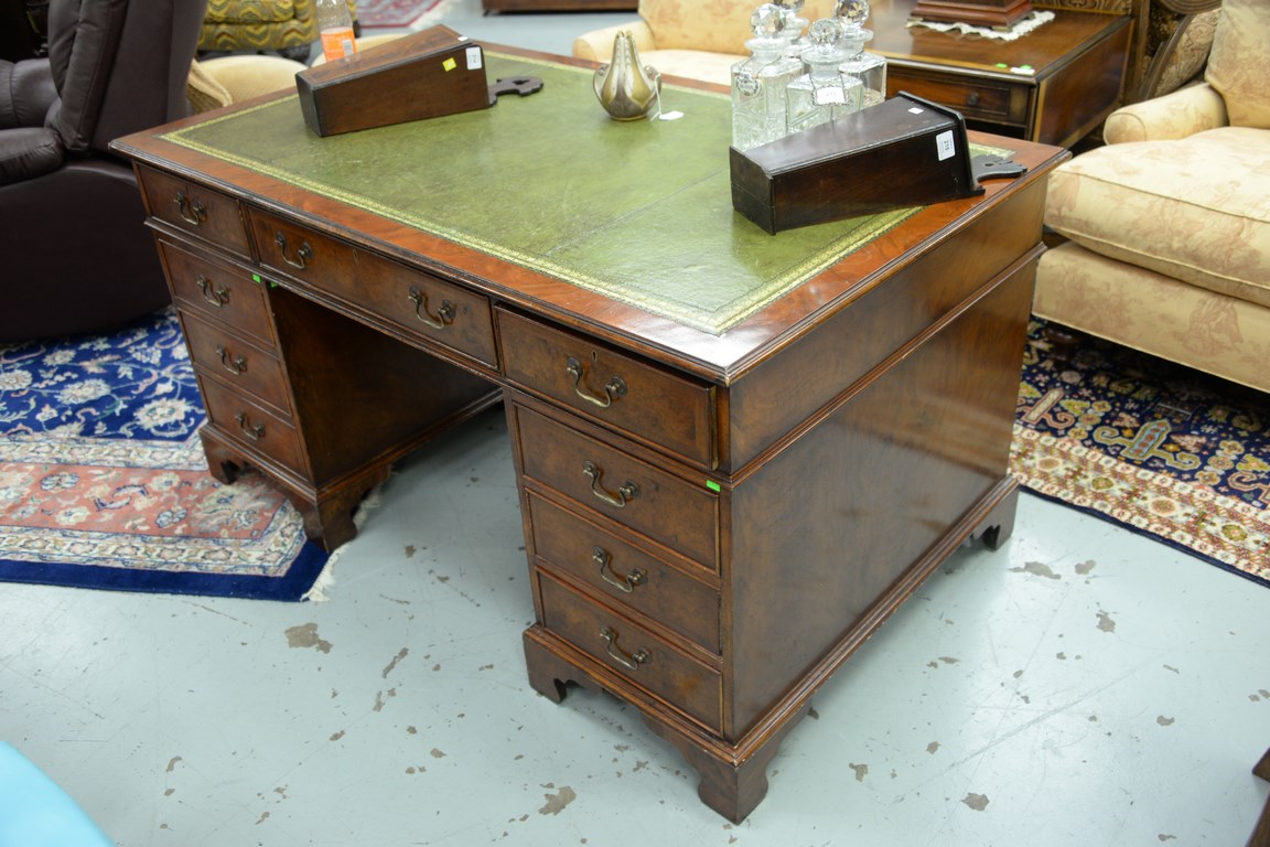 Burlwood George III style desk with green leather top in three parts, ht. 31 1/2in. top 36 x 60.