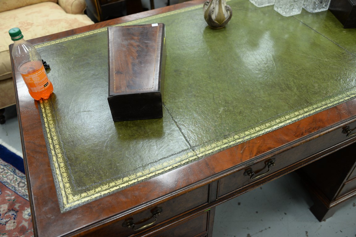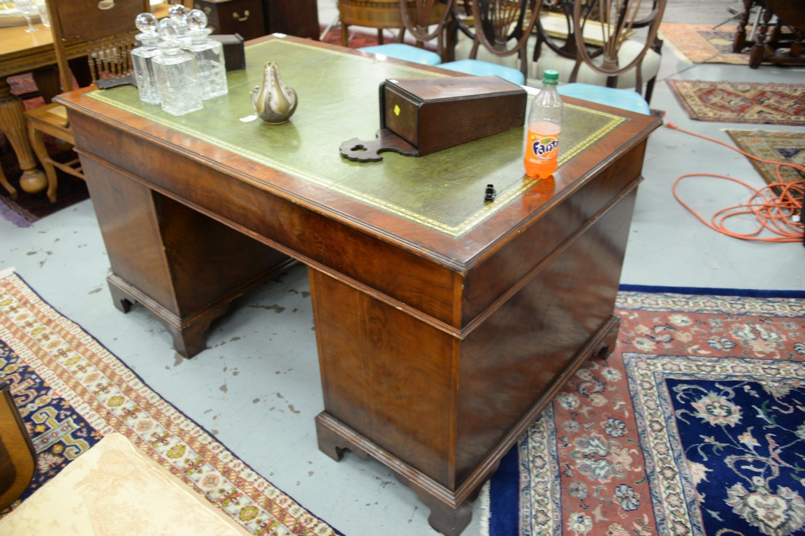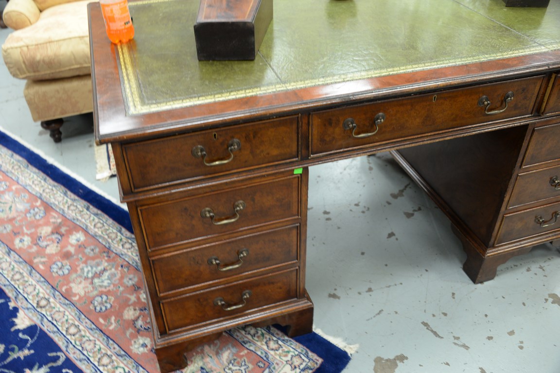 Lot 279: Burlwood George III style desk with green leather top in three parts, ht. 31 1/2in. top 36 x 60.