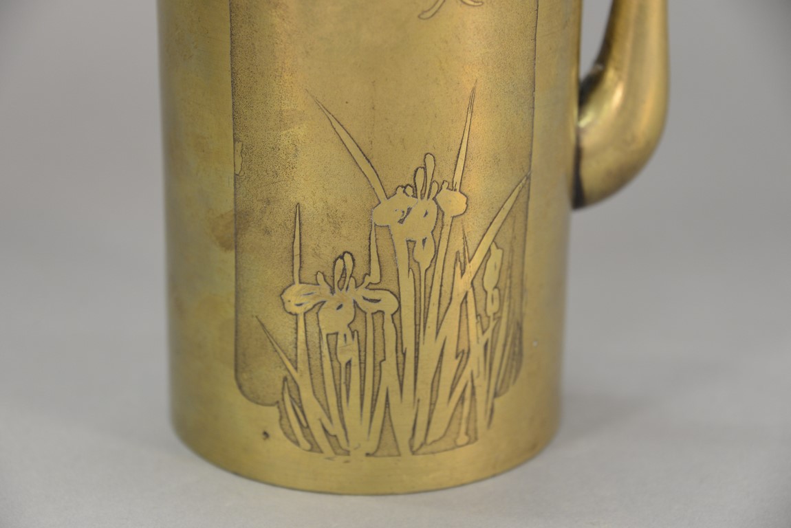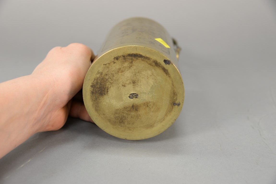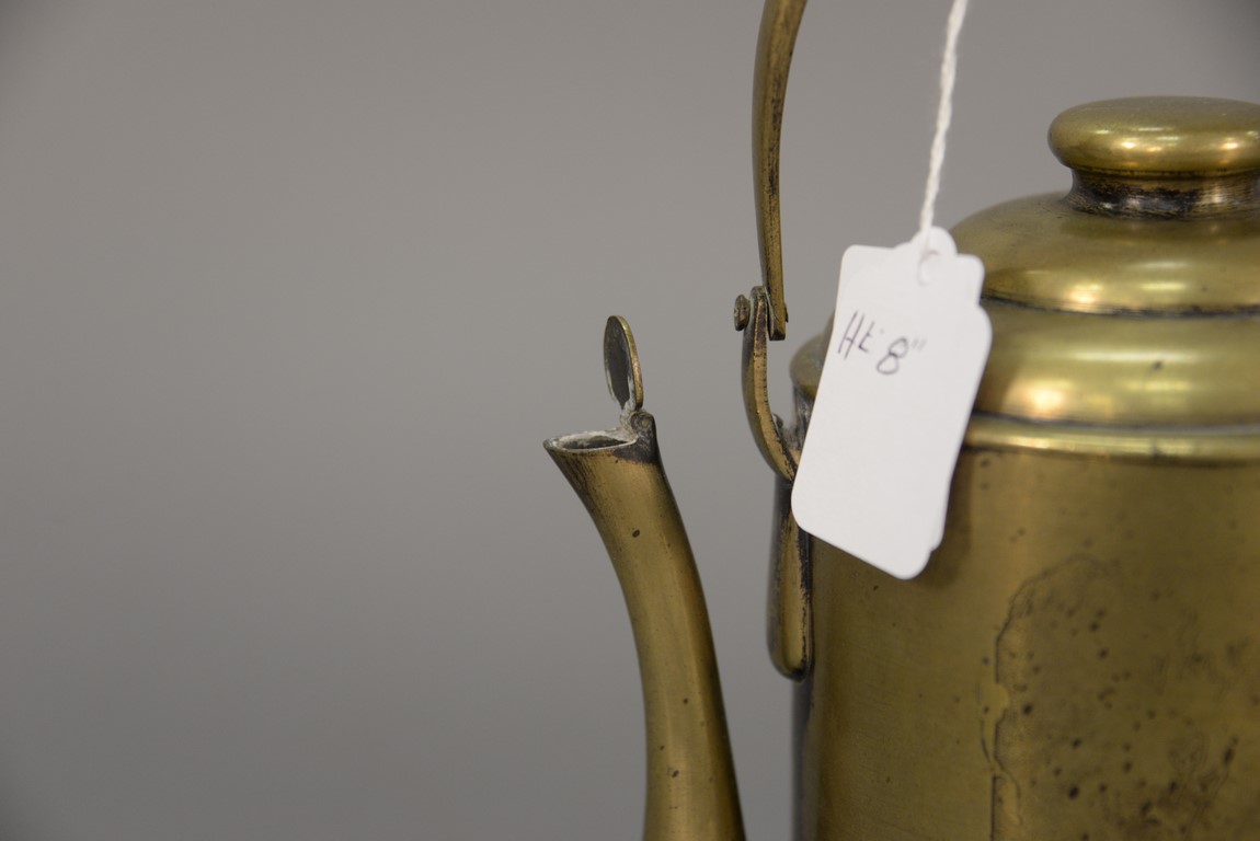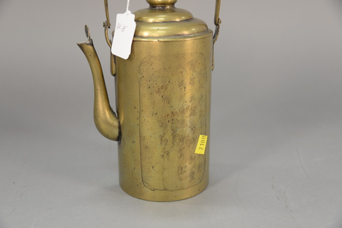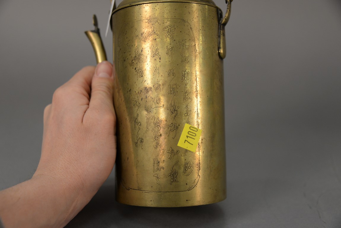 Lot 279: Chinese brass teapot having swing handle and round lid on cylindrical body embossed on one side with flowers, opposite side with Chinese characters, signed under lid, makers mark on bottom, probably 19th century or earlier. total ht. with hand