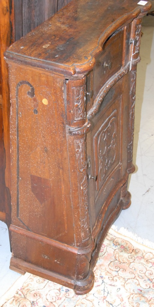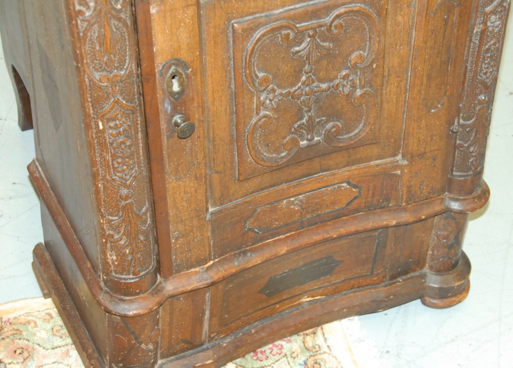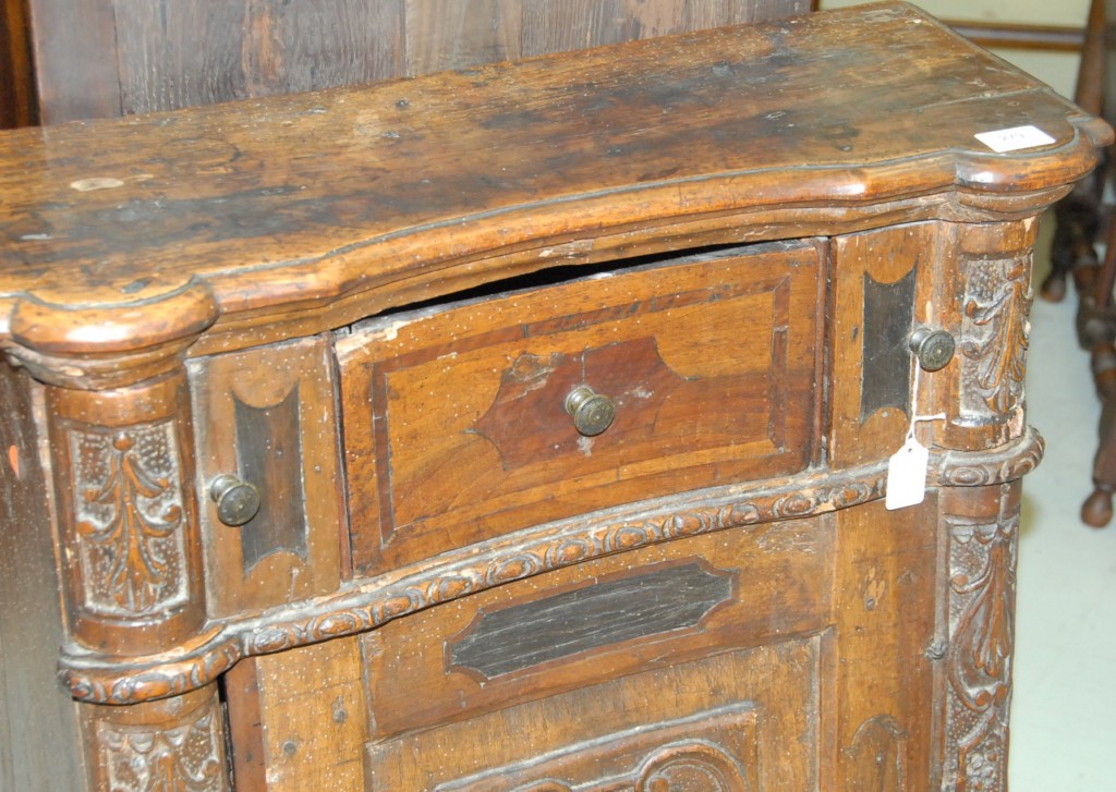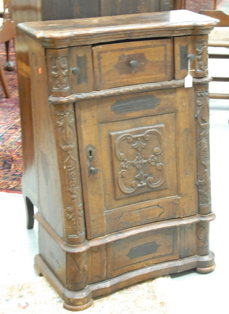 Continental side cabinet with three drawers over door, possibly 17th to 18th century, German or North Italy. height 37in. width 26in.