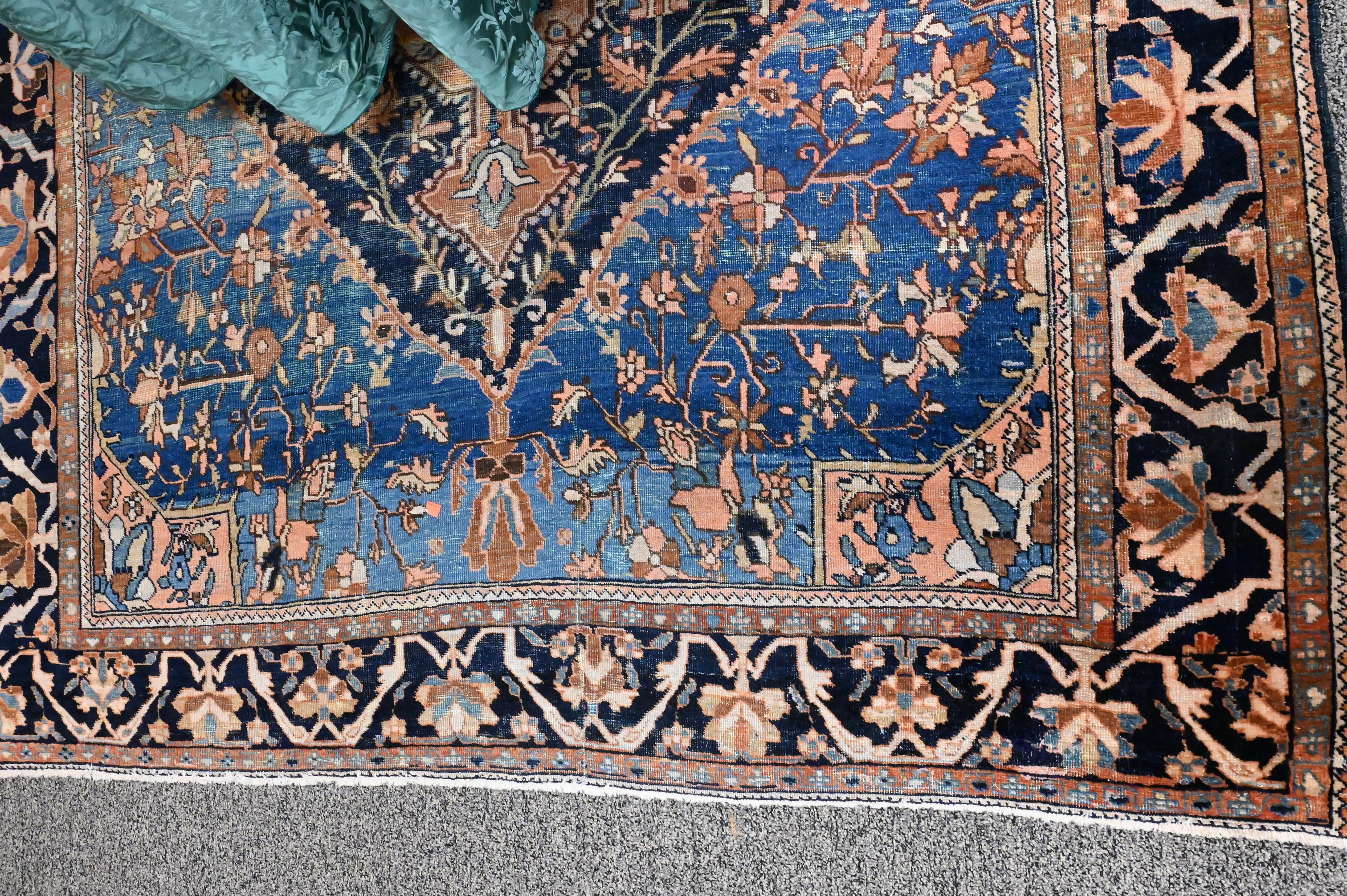 A Persian Farahan Sarouk carpet with floral sprays on a blue field, framed by floral borders in camel, ivory, and indigo.