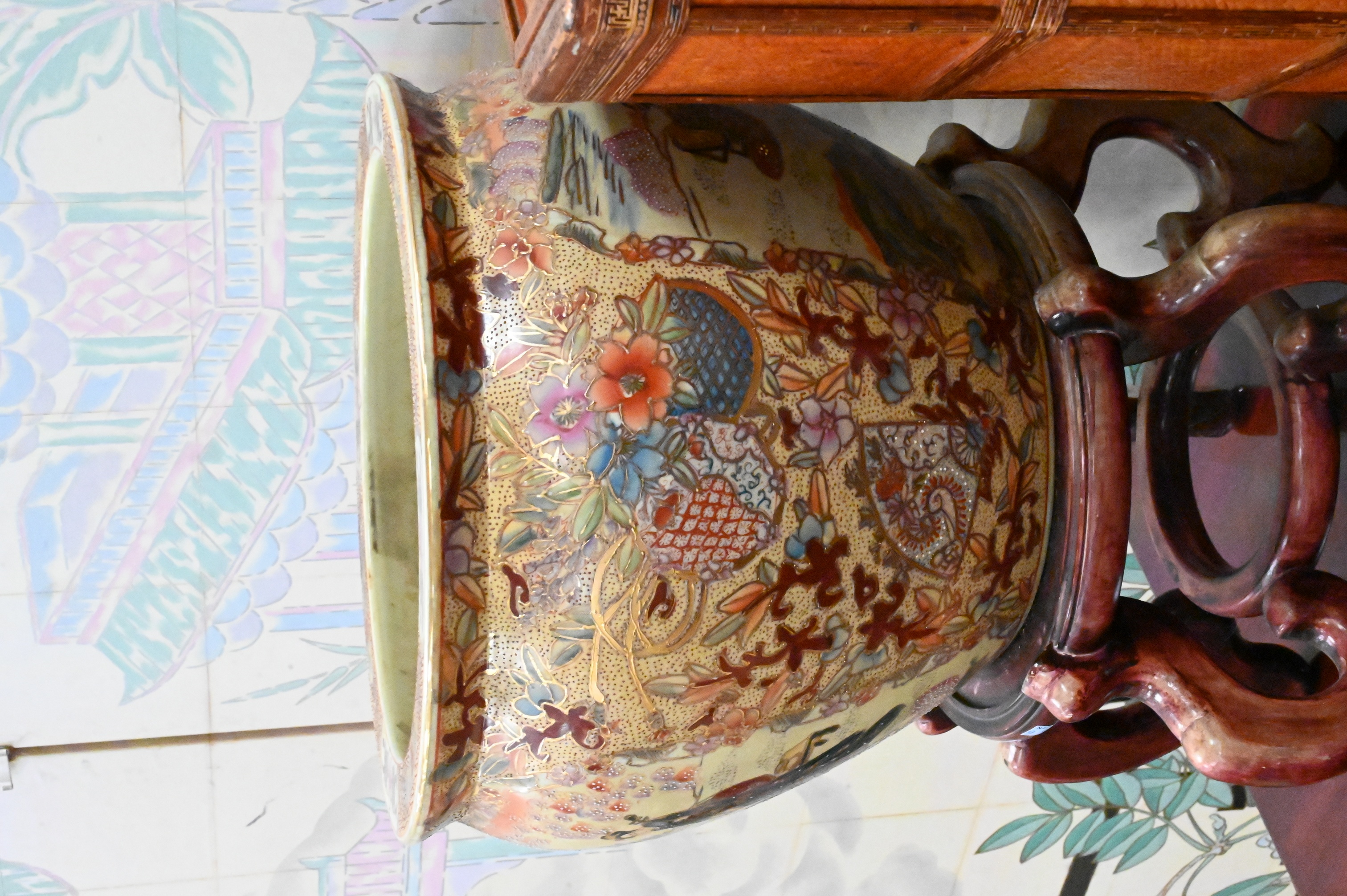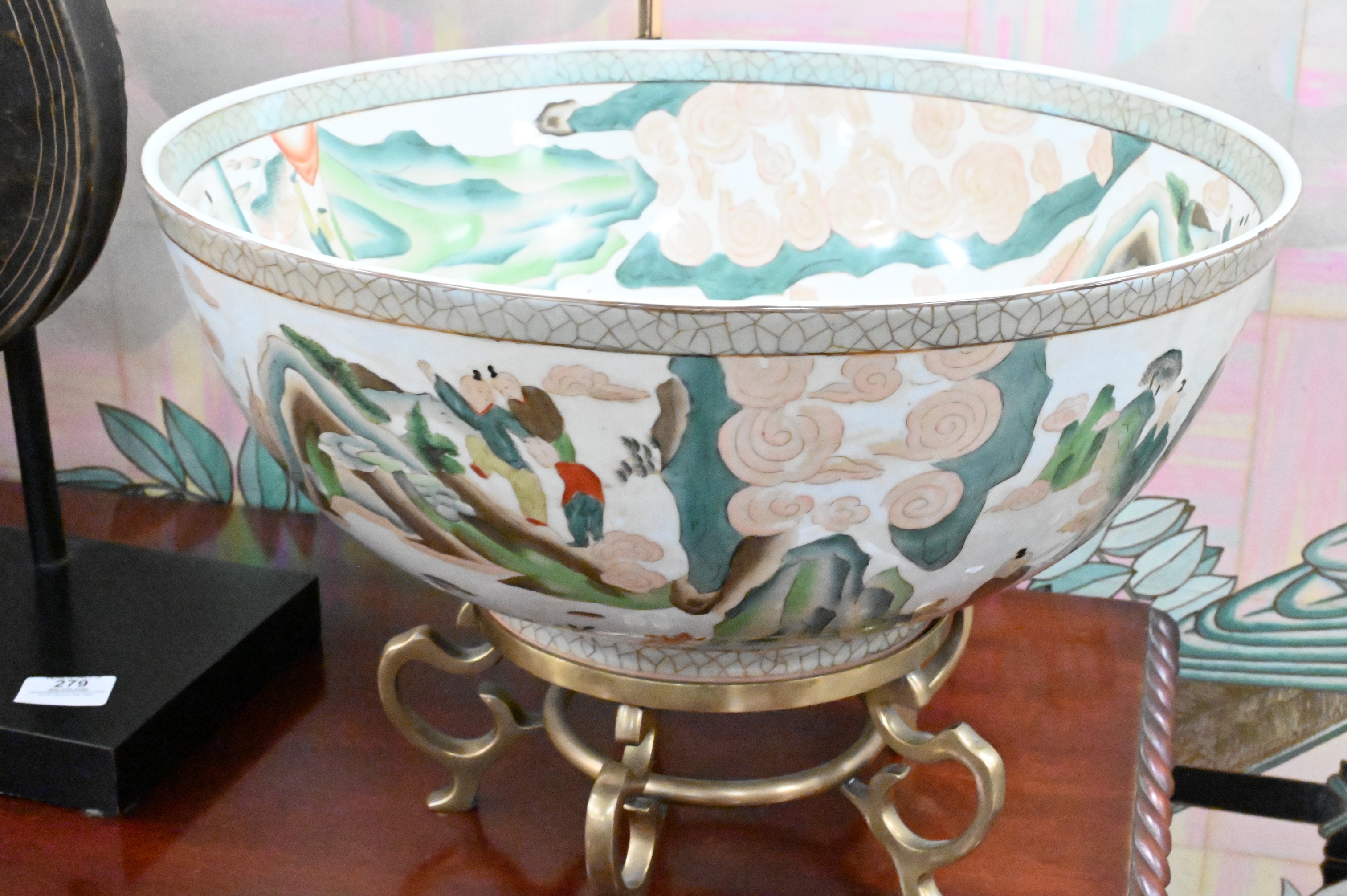 featuring crackle glaze painted rim over motif of boys playing in a mountain landscape with mythical creatures