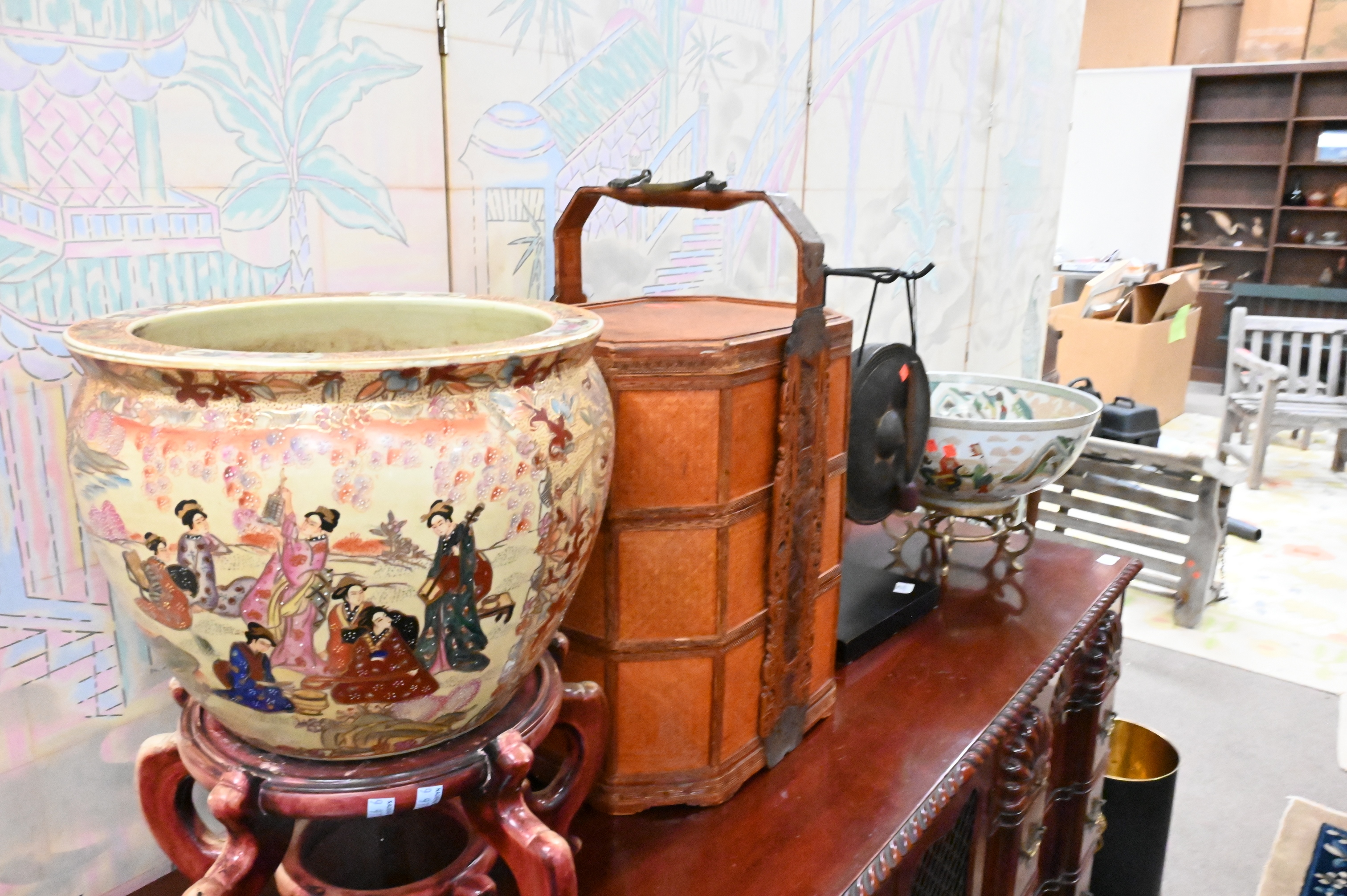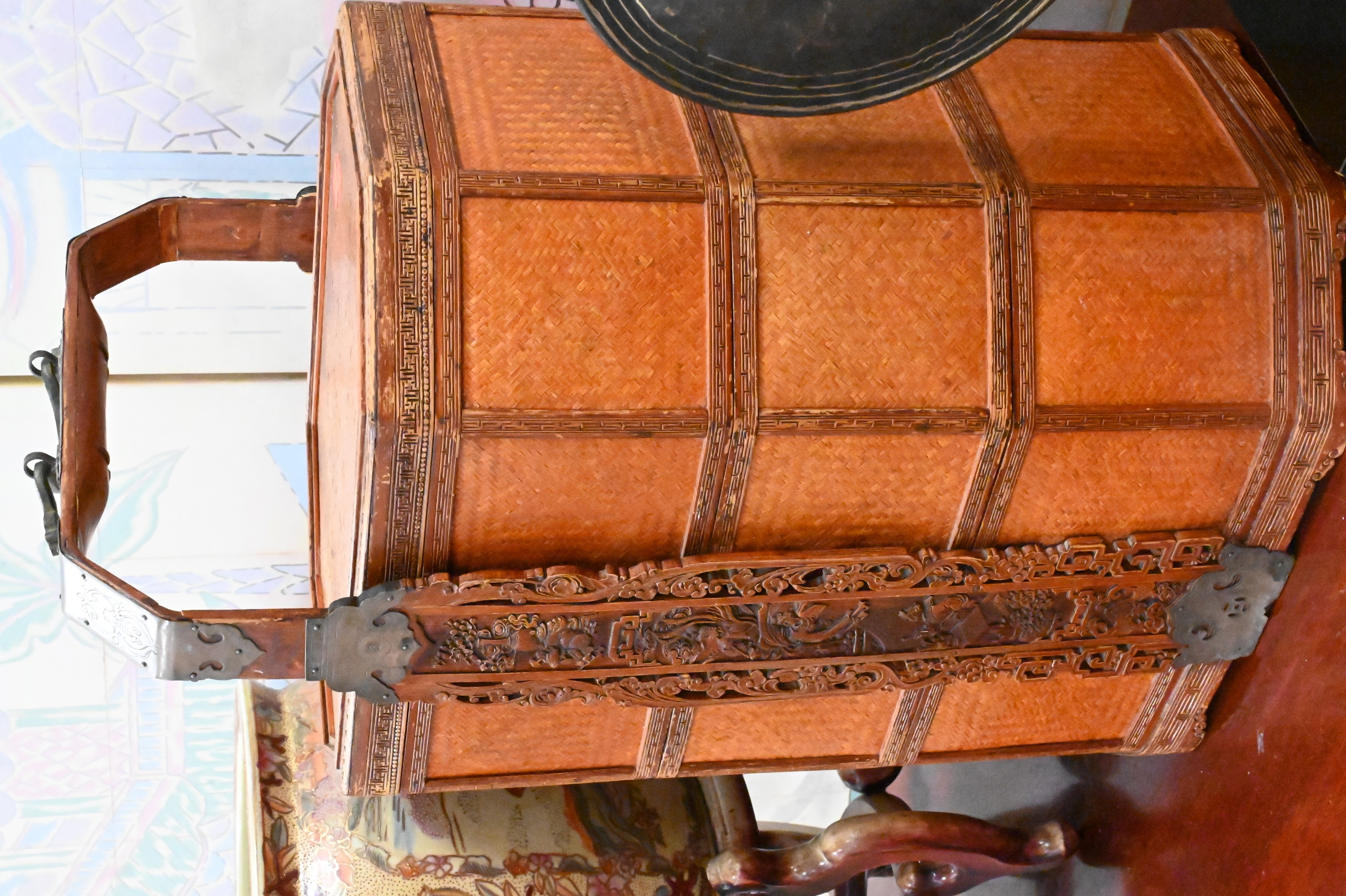 three woven boxes with openwork carved and metal mounted sides featuring geishas and scholars