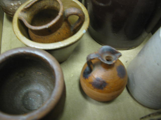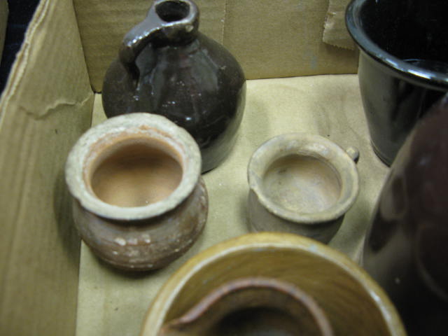 Group of miniature Redware jugs, cups, bowls, crocks along with a few stoneware pieces, etc