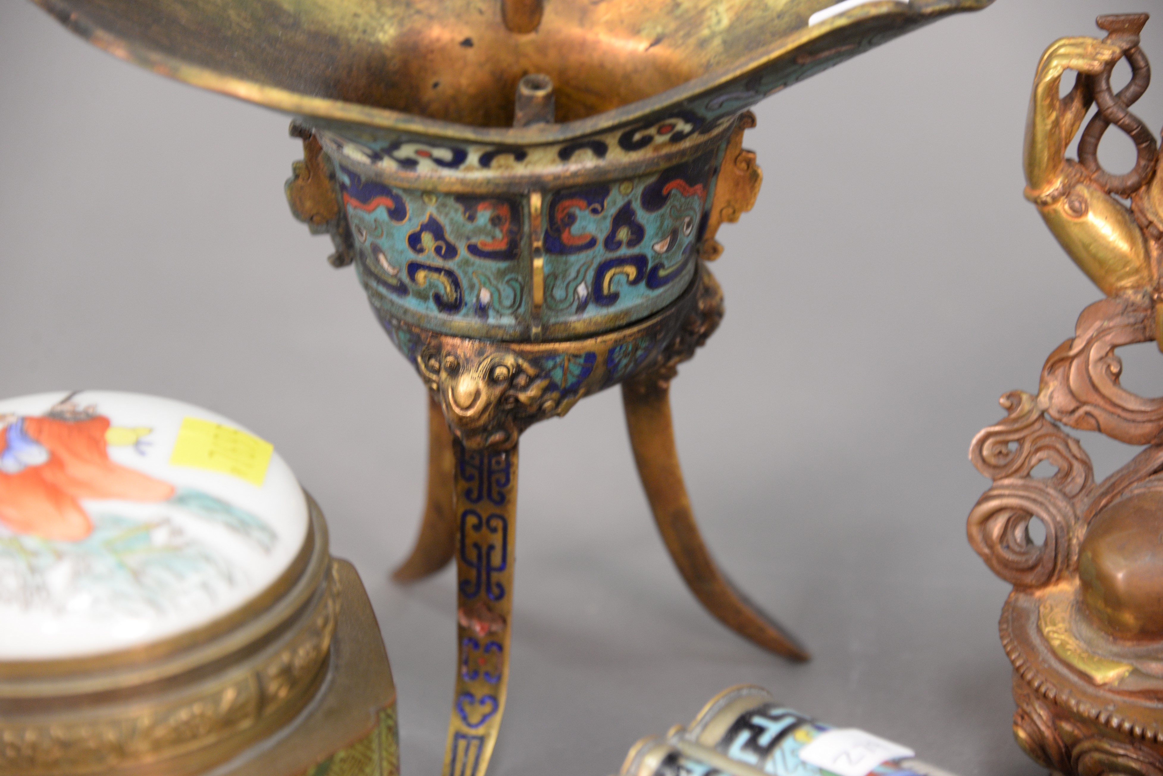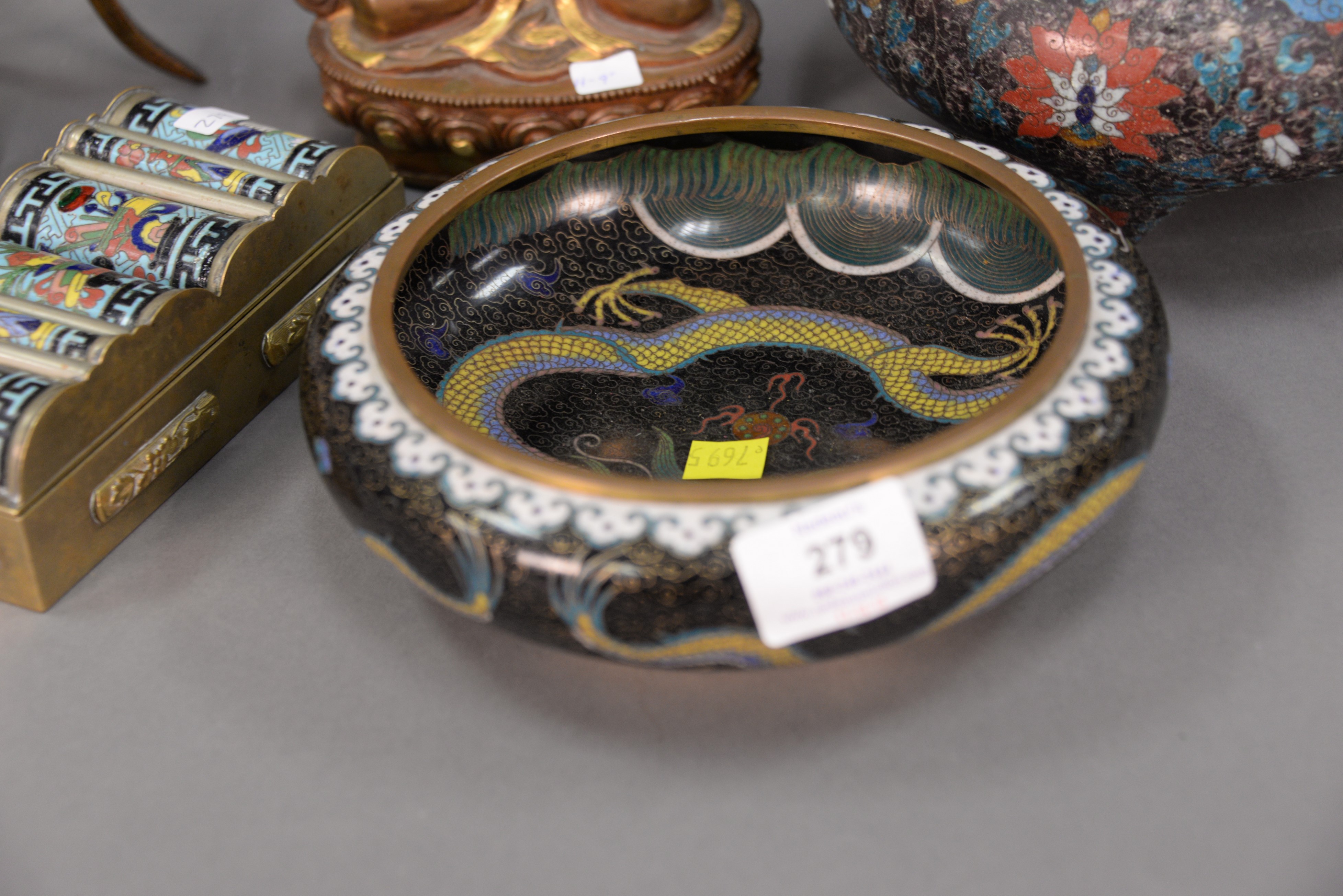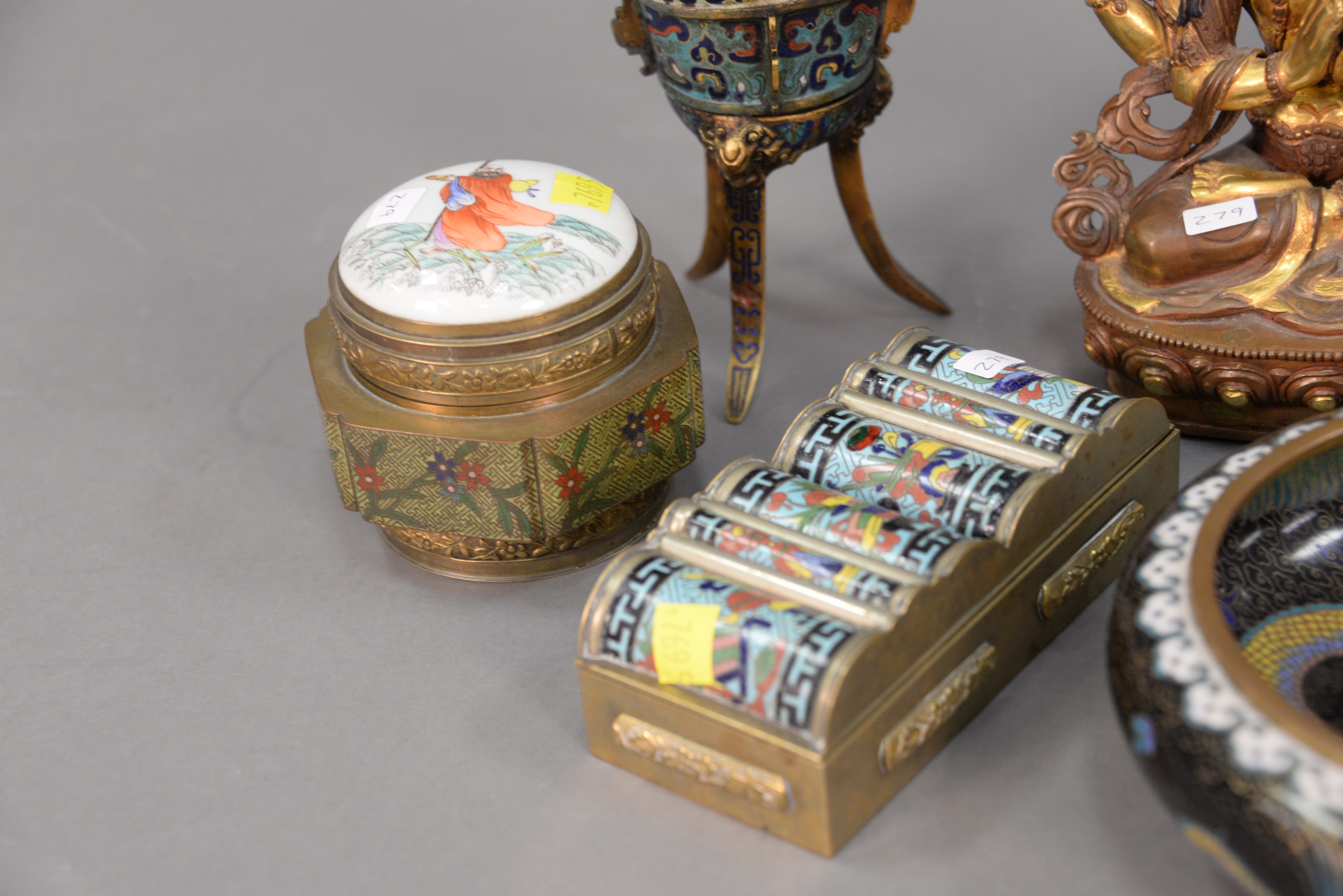 Lot 279: Group of six Chinese items to include two cloisonne bowls, two cloisonne bronze Goddesses, and a cloisonne footed wine cup. bowls: d…