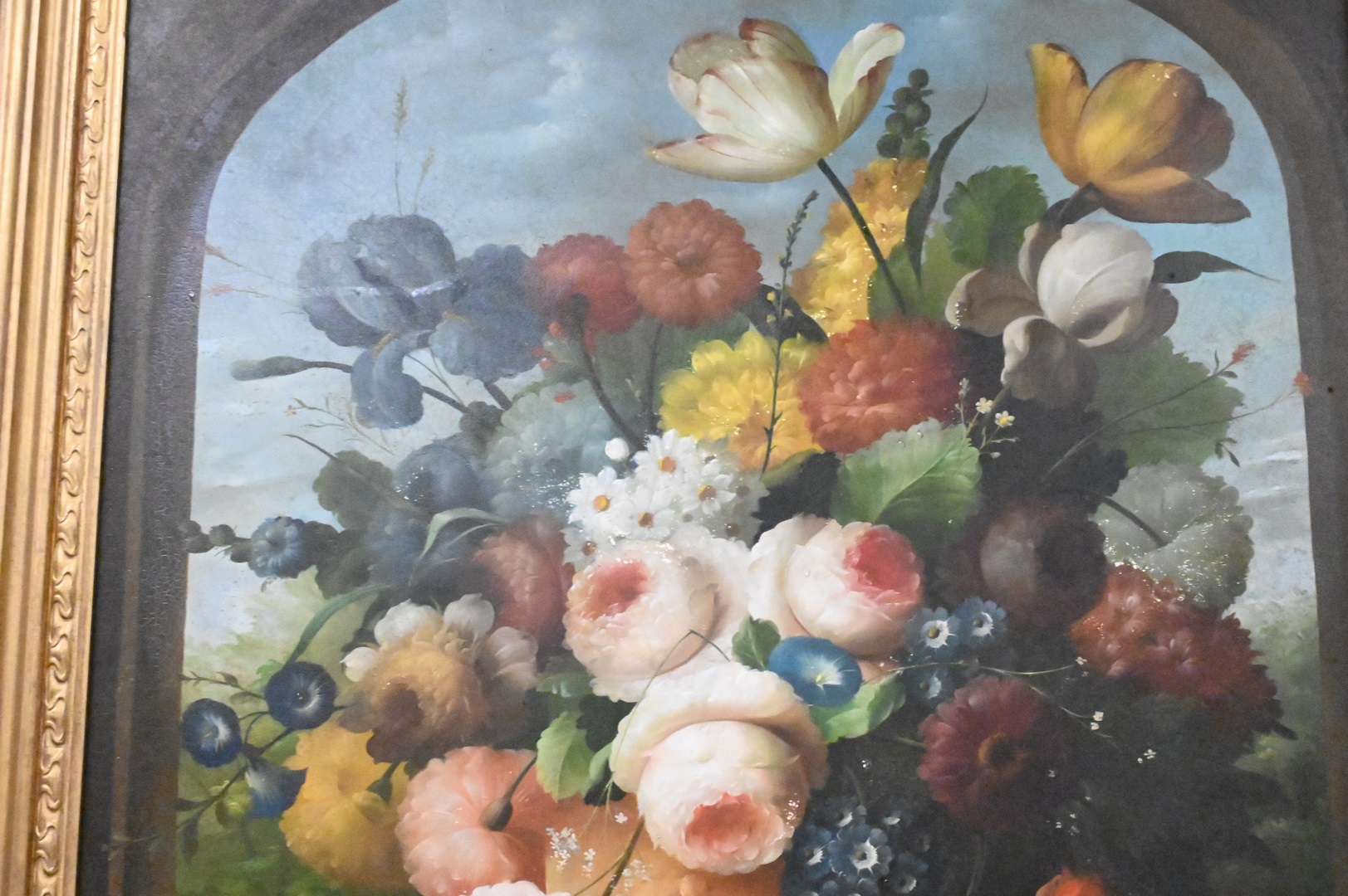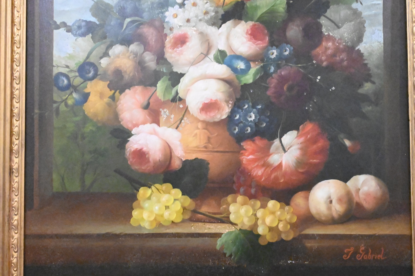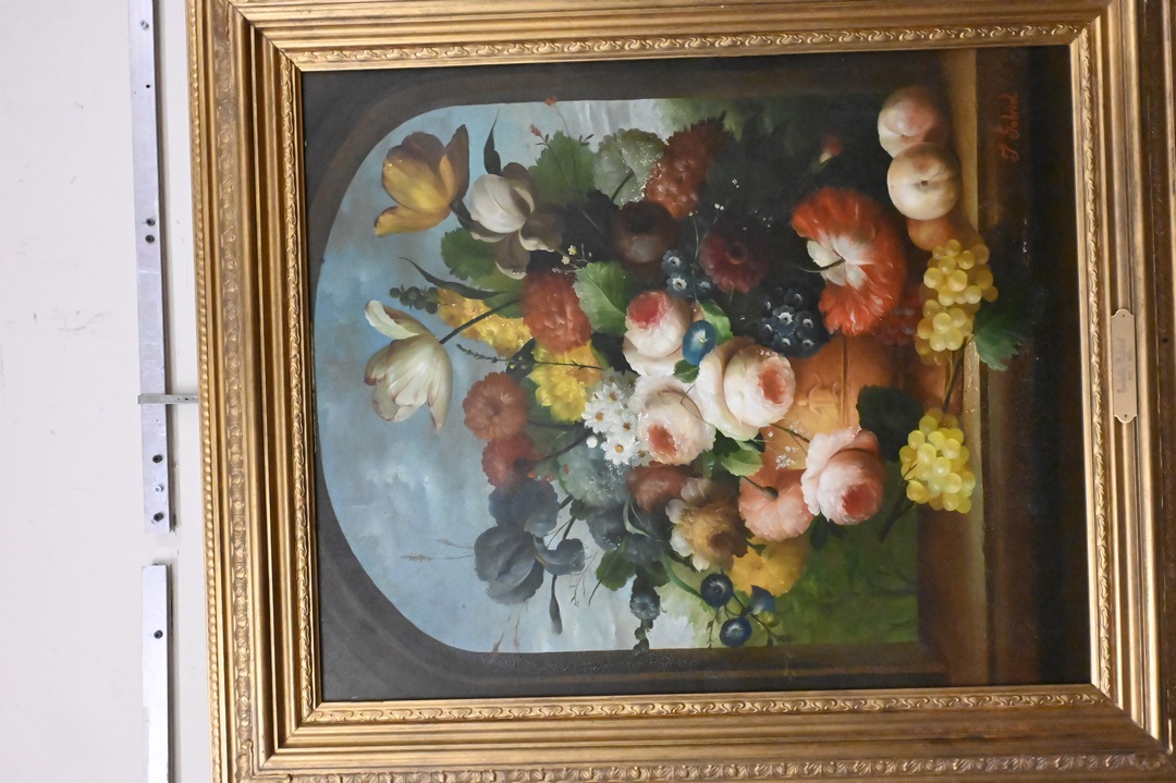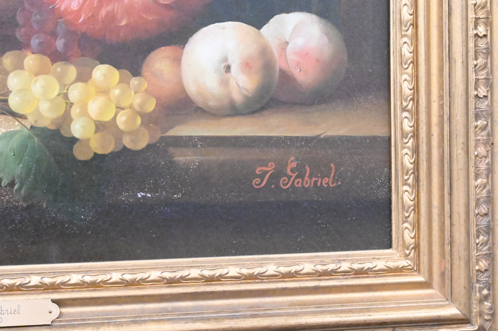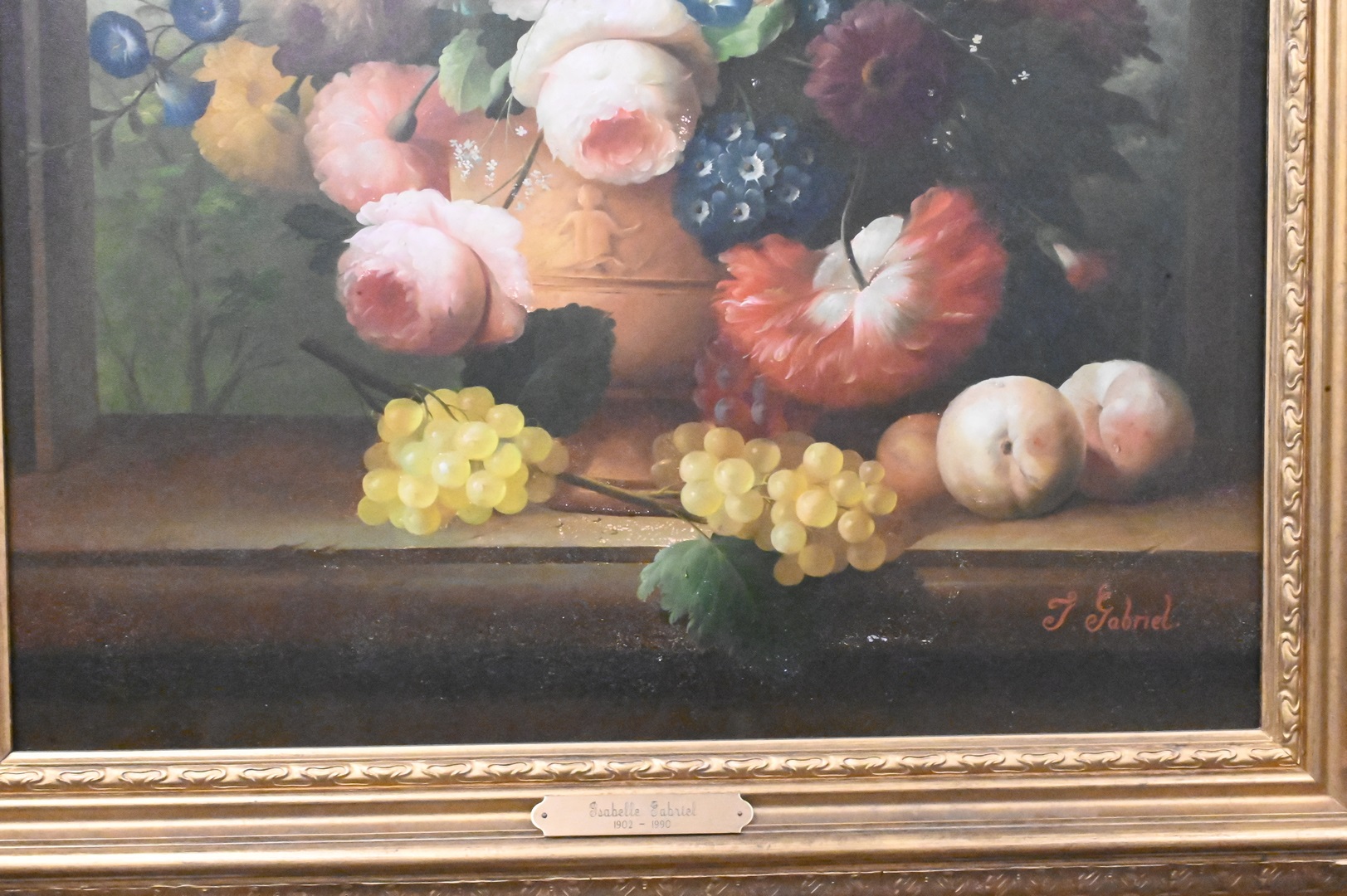 Isabelle Gabriel (France, 1902 – 1990), still life of fruit and grapes, oil on board, signed lower right “I. Gabriel”, minor flaking, 30″ x 25″.