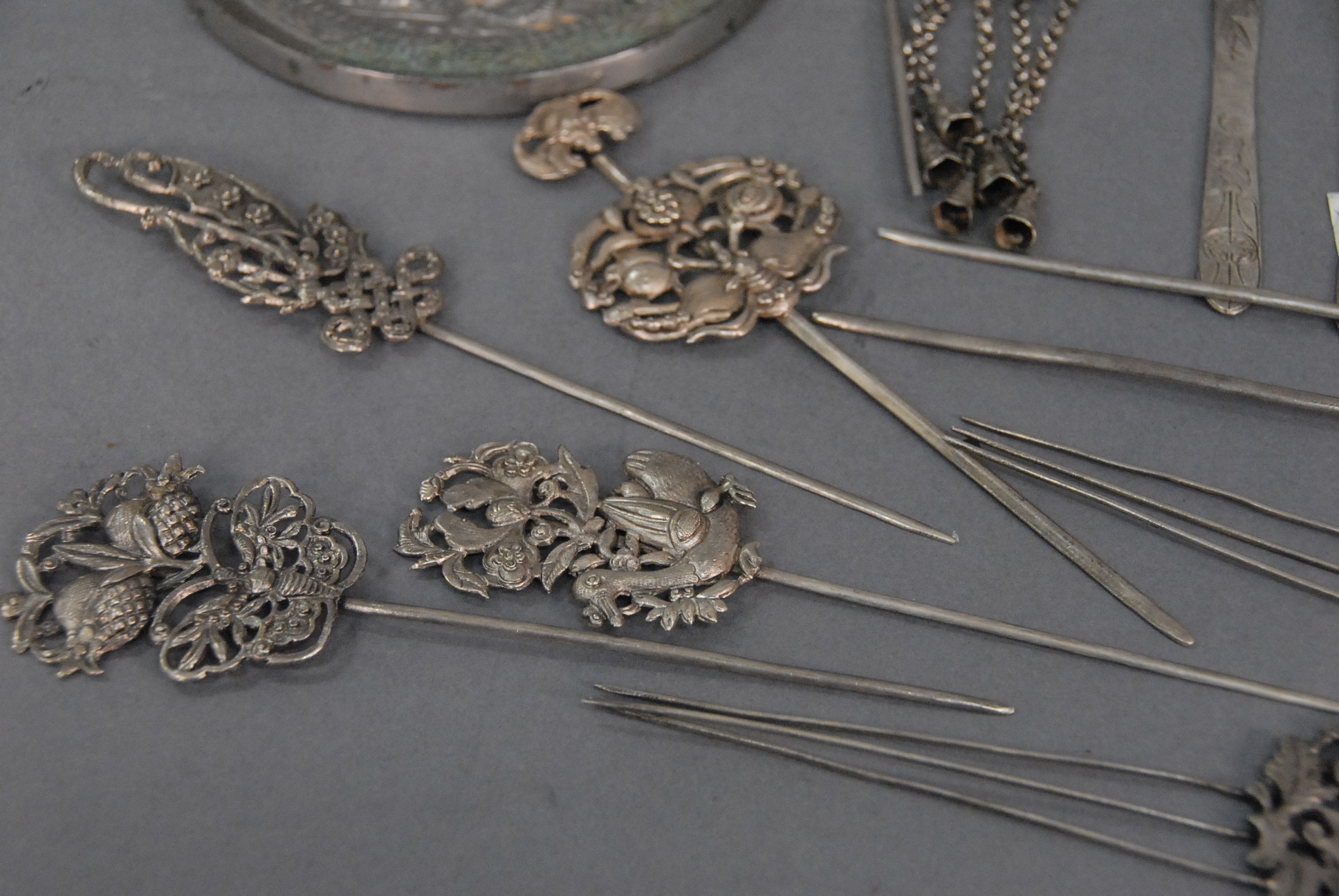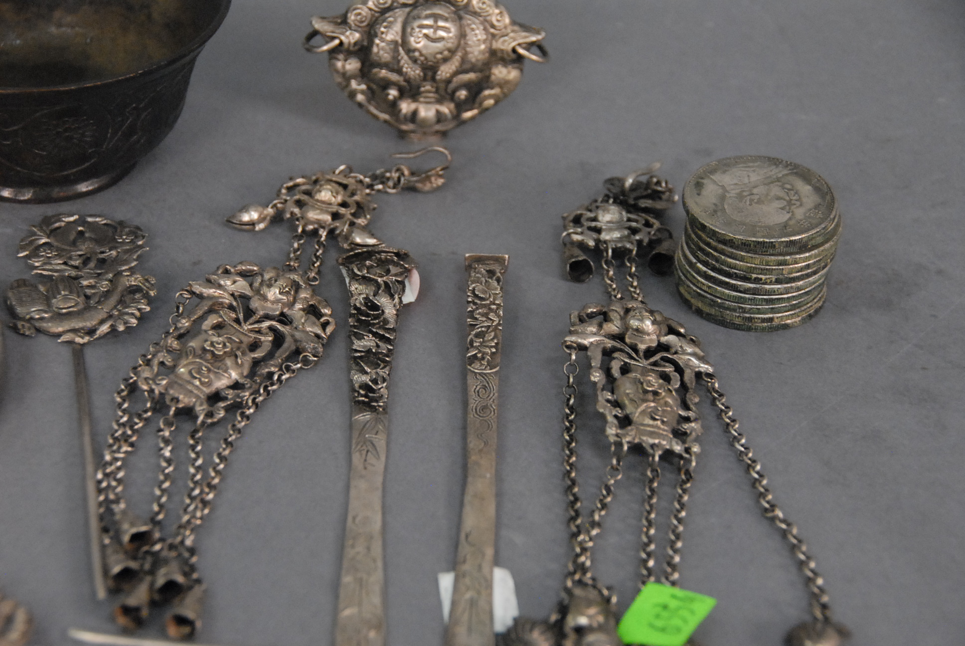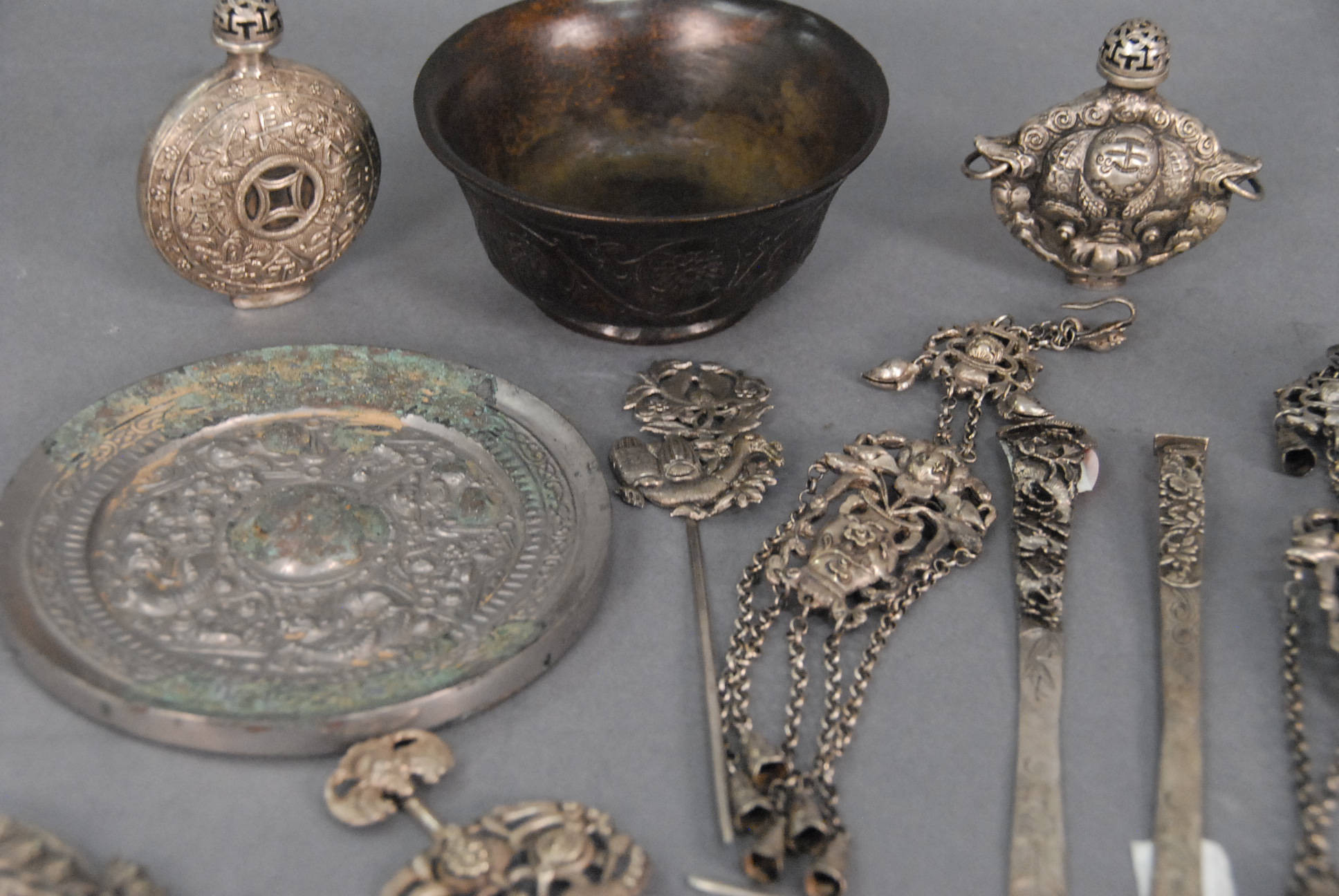Lot 279: Large group of Oriental items to include two silver snuff bottles, ten silver coins, thirteen silver hair pieces, bronze mirror dia….