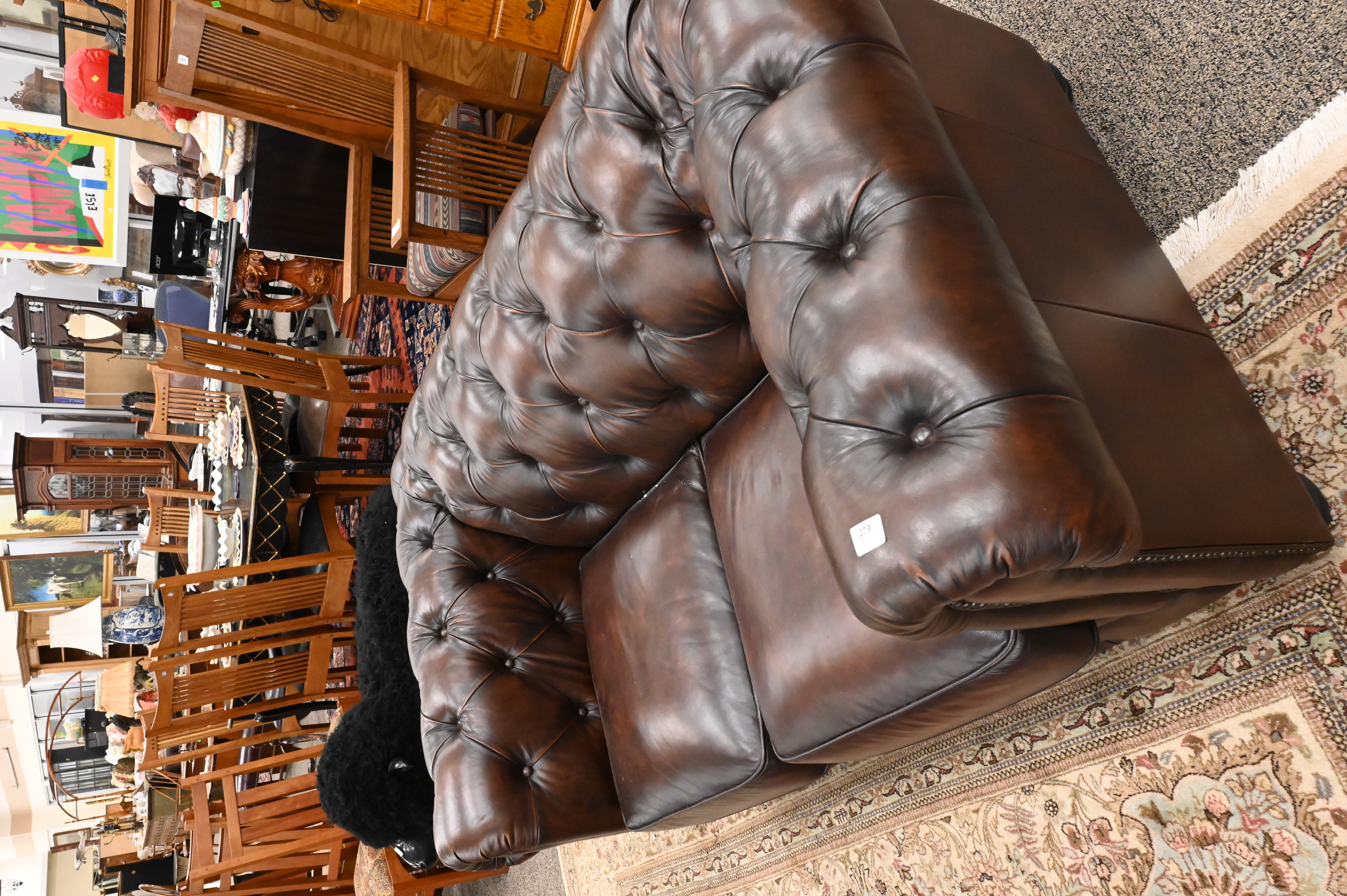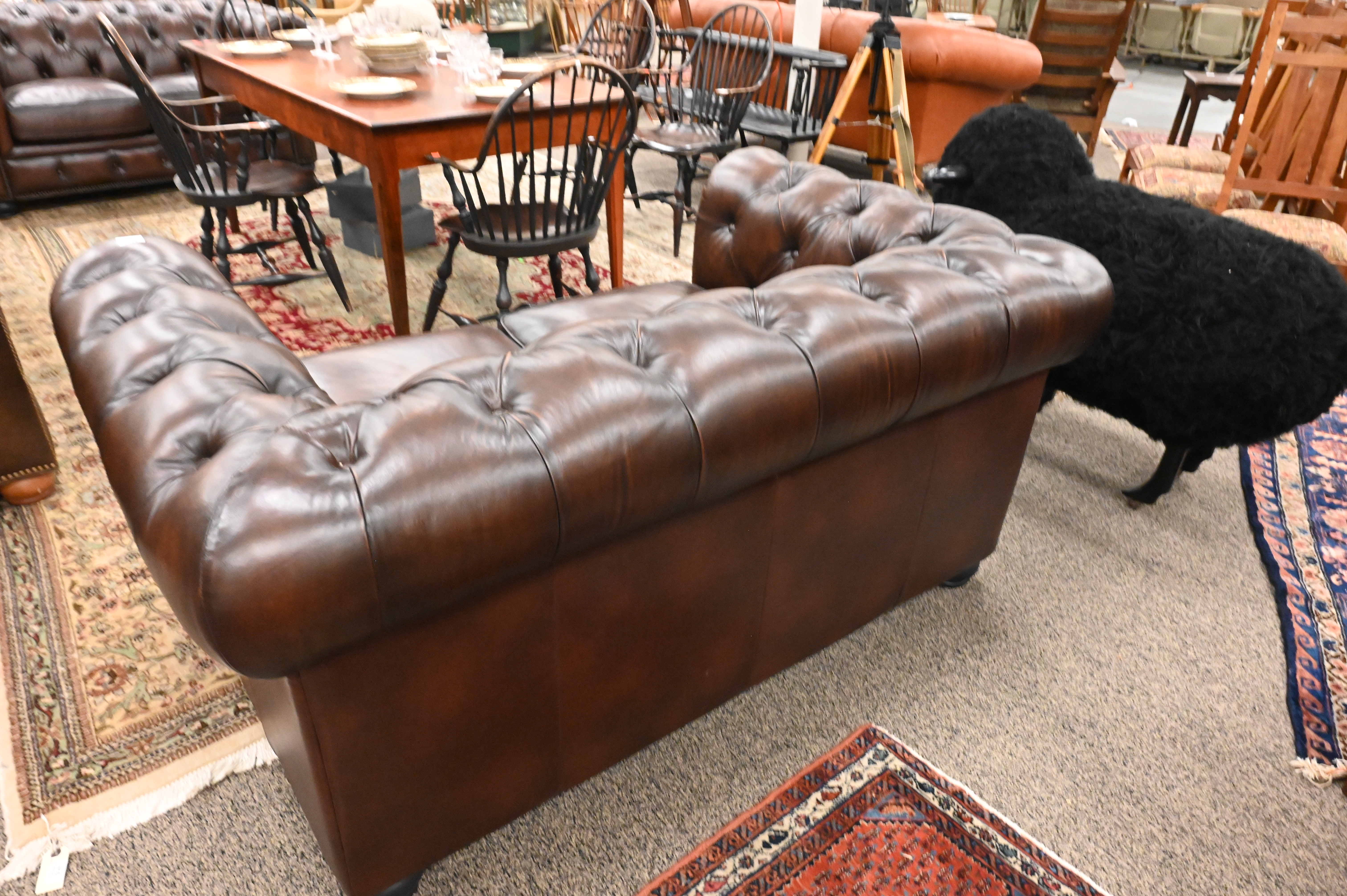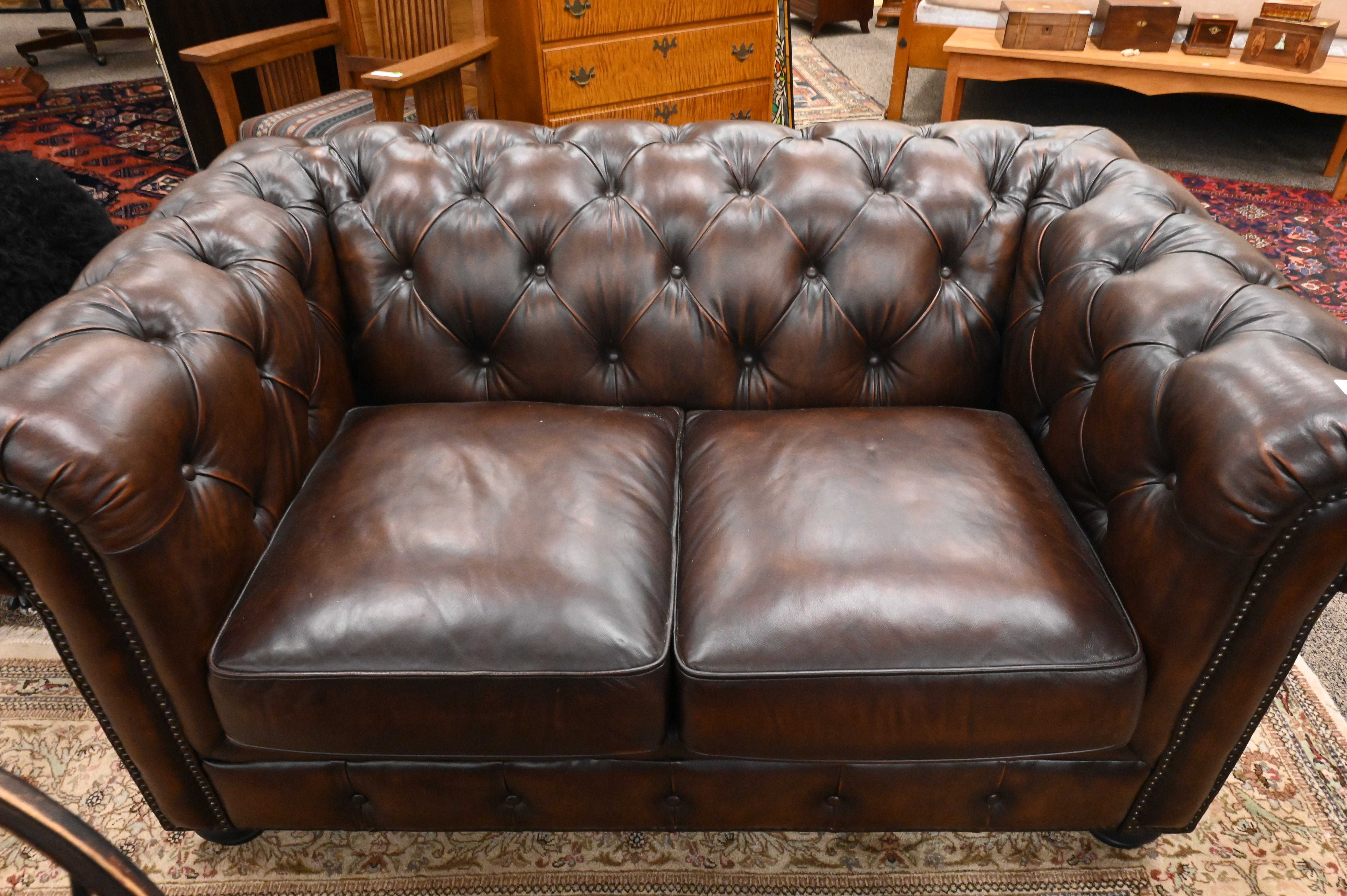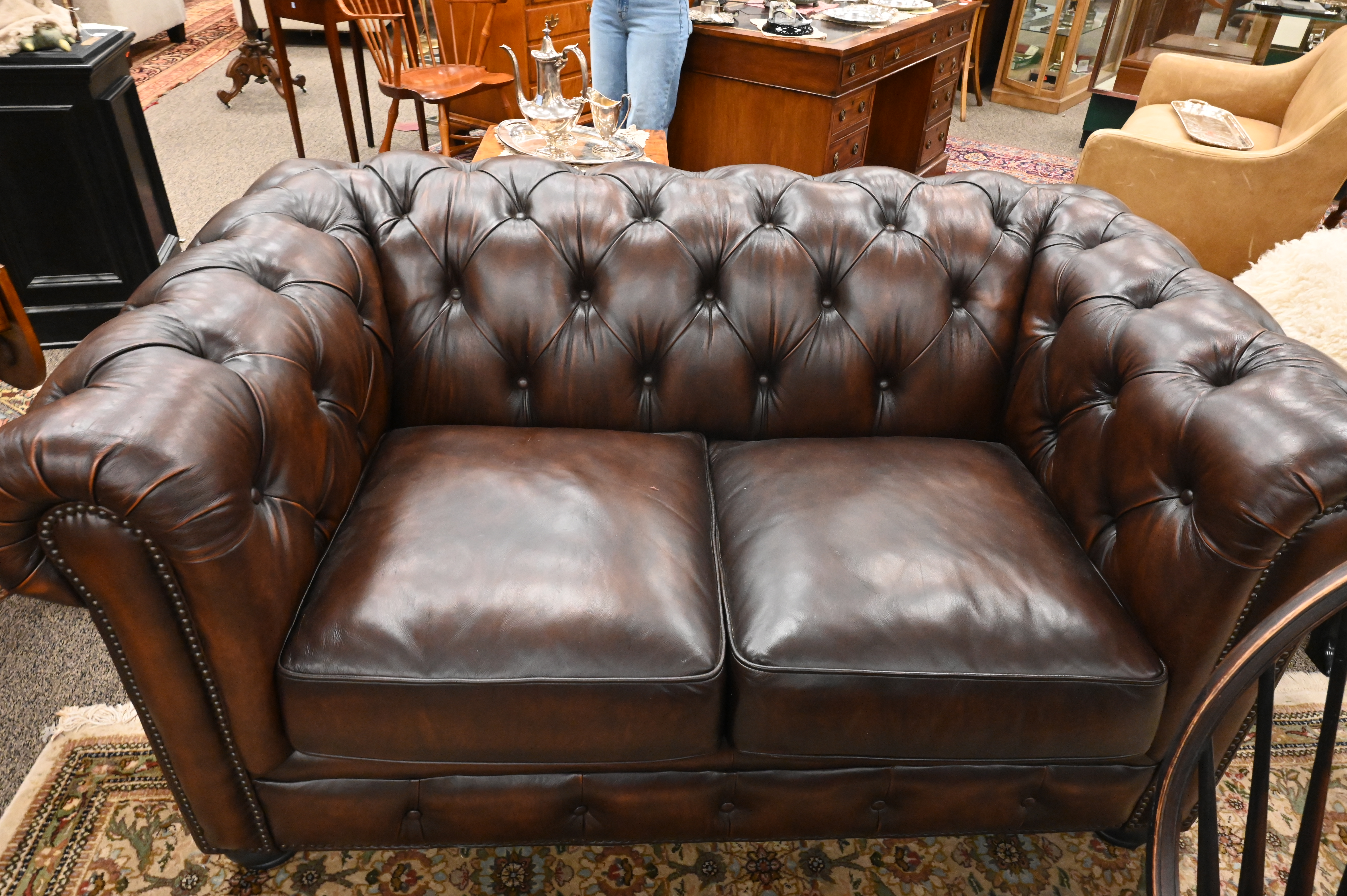Lot 279: Pair of Brown Leather Chesterfield Style Loveseats