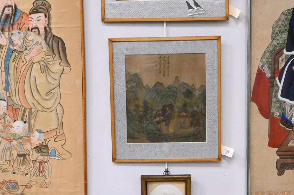 Lot 279: Pair of Chinese Paintings on Silk, mountainous landscapes with figures, 13 3/4″ x 12 1/2″. Provenance: Estate of Wallace Bradway, New Haven, CT.