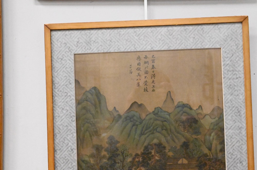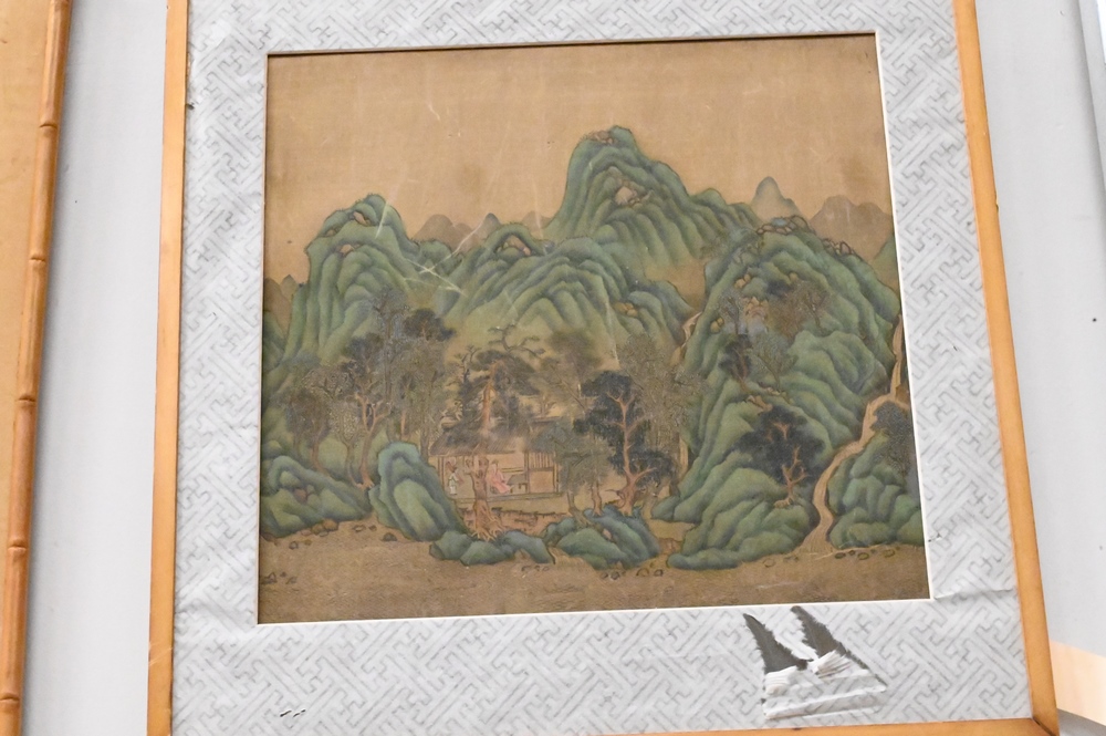 Pair of Chinese Paintings on Silk, mountainous landscapes with figures, 13 3/4″ x 12 1/2″. Provenance: Estate of Wallace Bradway, New Haven, CT.