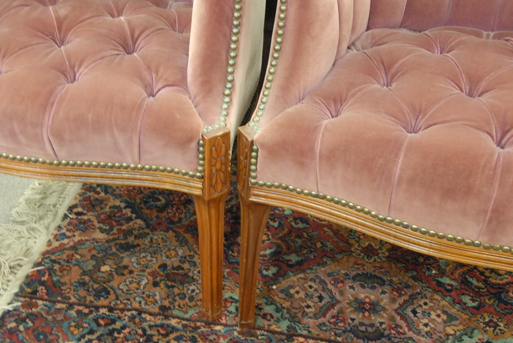 Pair of mauve covered barrel back tufted armchairs.