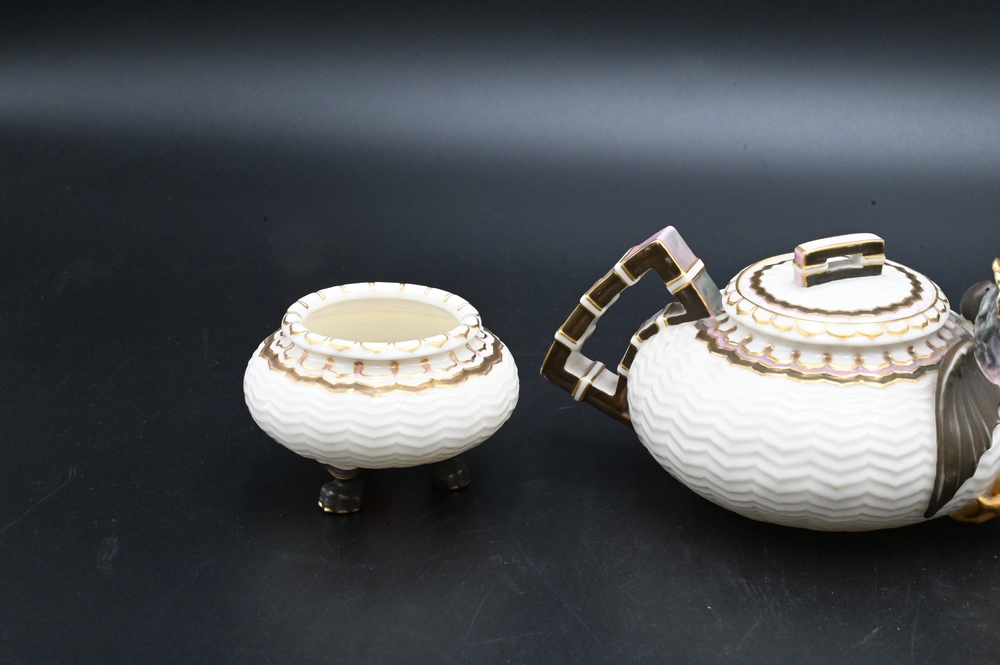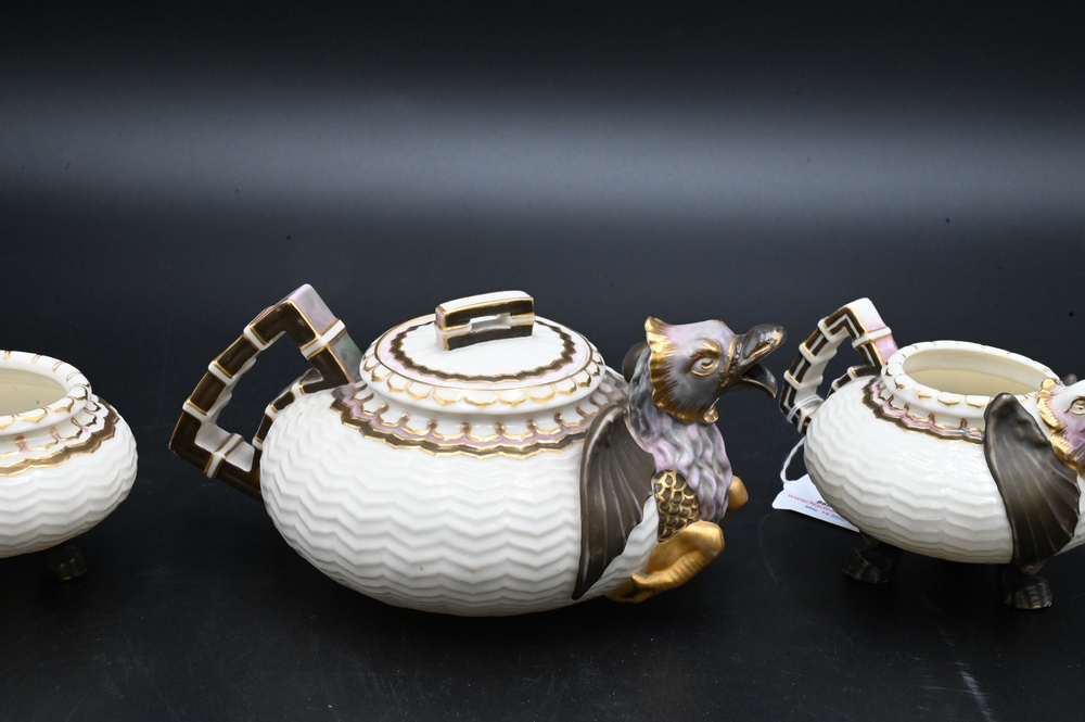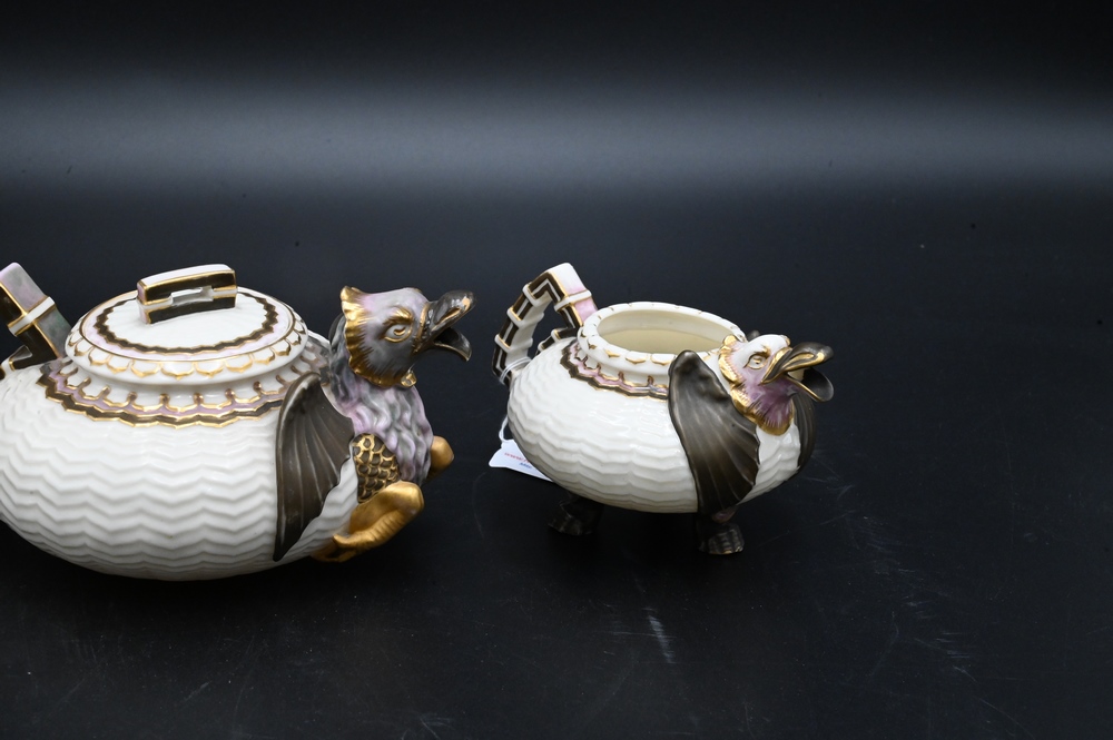 Three Piece Belleek Dragon Tea Set, to include a small teapot, creamer and sugar, all painted, height 2 1/2 inches. Provenance: Collections of Norma Reilly, New Jersey.