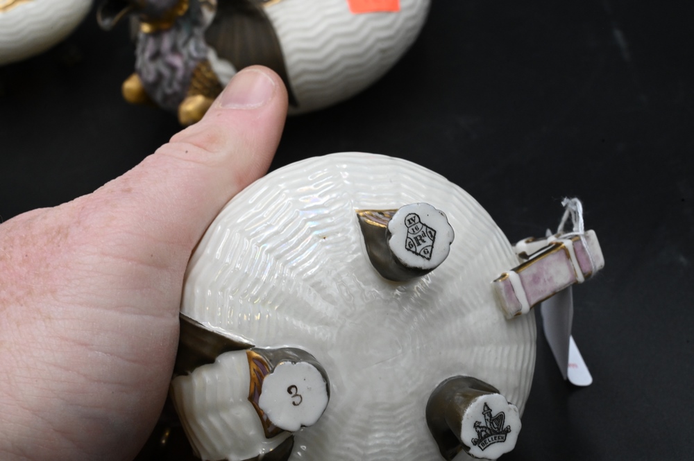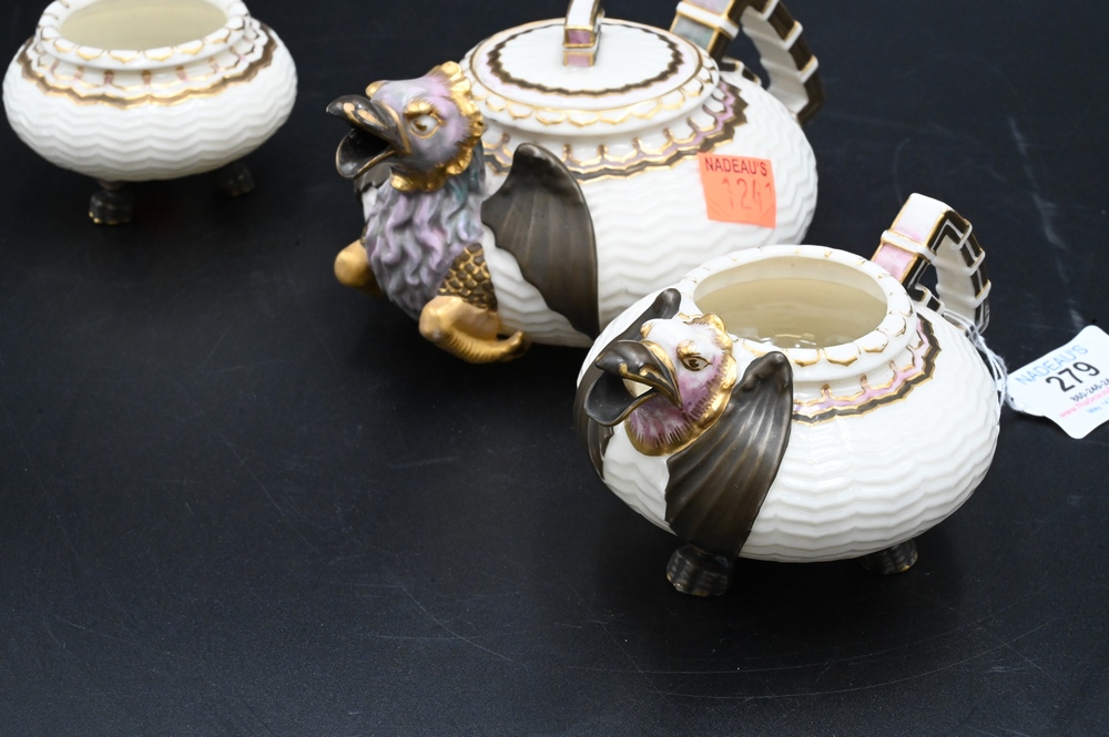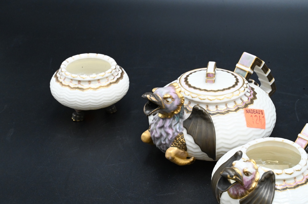 Lot 279: Three Piece Belleek Dragon Tea Set, to include a small teapot, creamer and sugar, all painted, height 2 1/2 inches. Provenance: Collections of Norma Reilly, New Jersey.