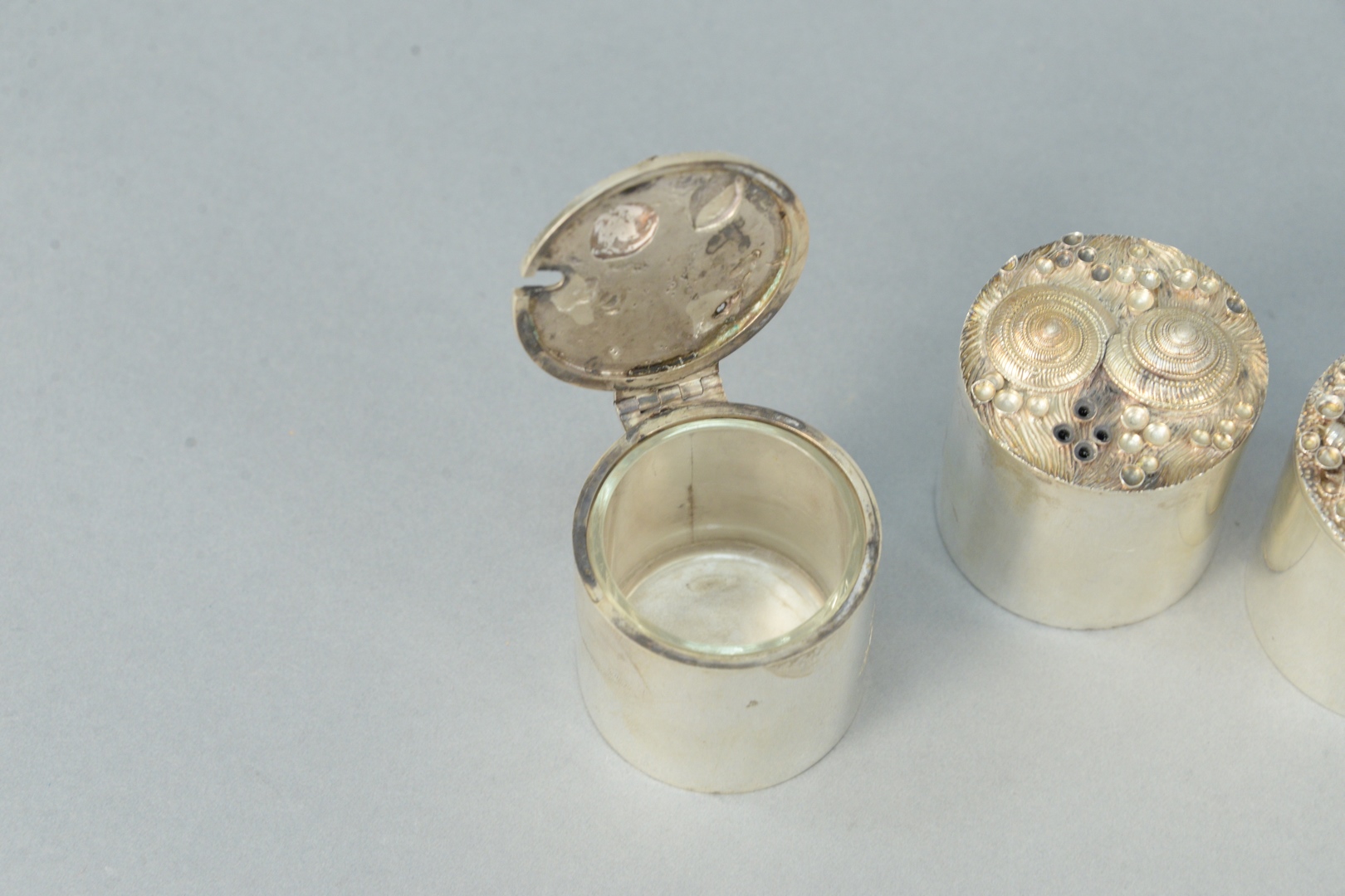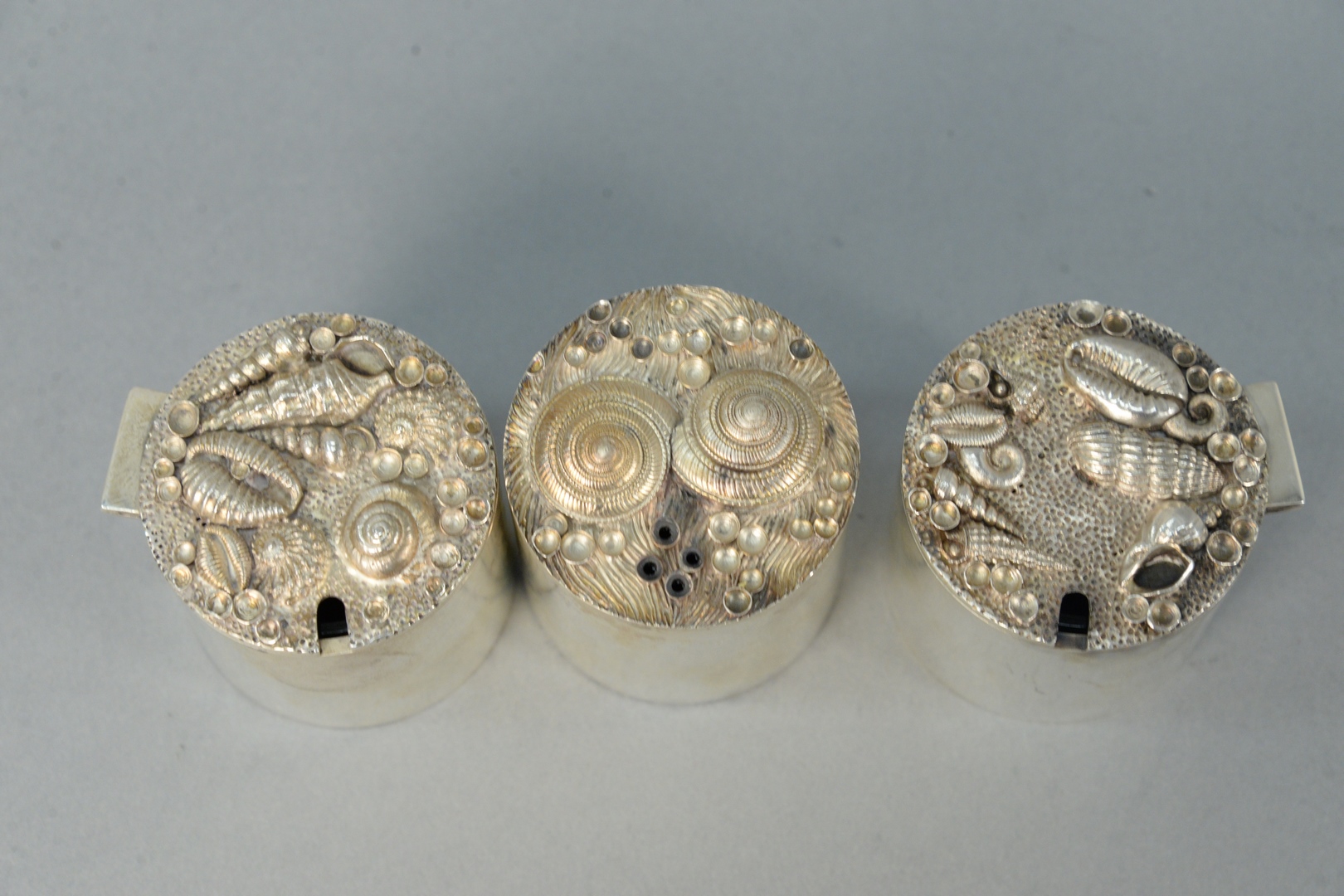 Lot 279: Three Piece Jocelyn Burton Sterling Silver Group pair of crystal lined condiment pots, one pepper shaker, each with seashell motif…