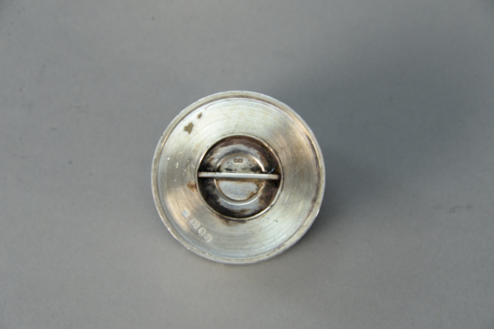 Three Piece Jocelyn Burton Sterling Silver Group pair of crystal lined condiment pots, one pepper shaker, each with seashell motif 1 crystal liner cracked height 2 inches, diameter 2 inches 14.7 troy ounces. Provenance: The consignor’s late husband, Philip Refson, owned the Charles de Temple jewelry shop on Jermyn St, London in the late 1970’s through early 90’s. Charles de Temple and Jocelyn Burton were friends, and he carried many of Jocelyn’s silver pieces in his store. Mr. Refson became a private client and personal friend of Jocelyn’s during this time and often commissioned pieces directly from Jocelyn. The chargers and the bull place card holders Philip was a Taurus are examples of commissioned pieces.