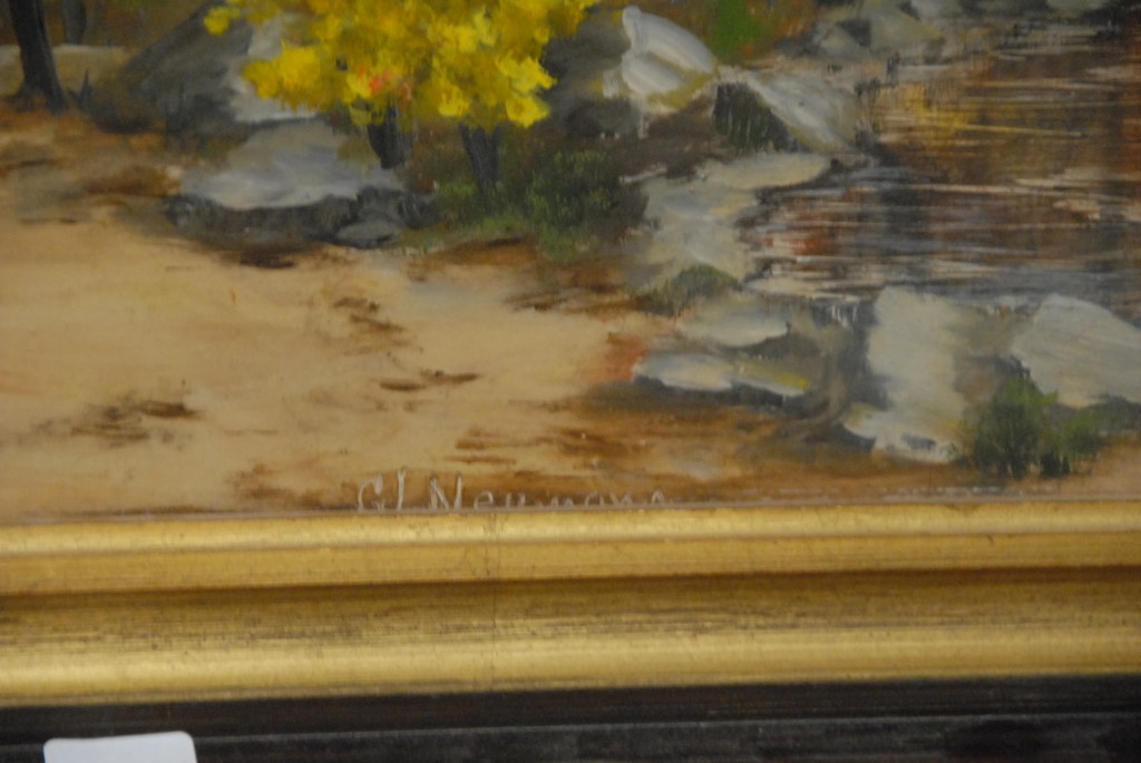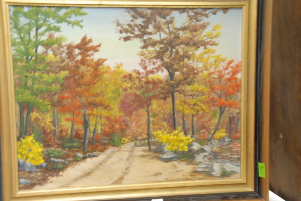 Lot 279: Three piece lot David Hockney poster, print of corn, and oil on board of country road signed lower right G. L. Neumann, 16 x 20.