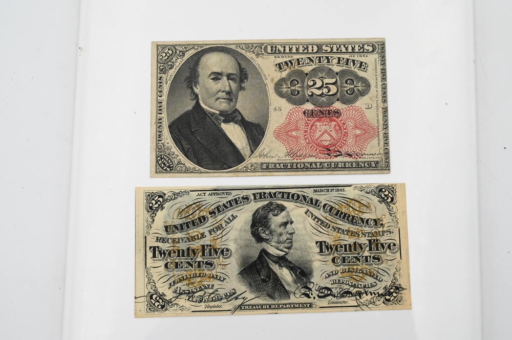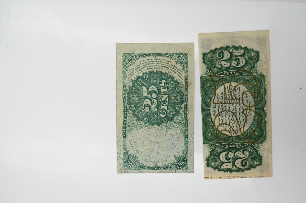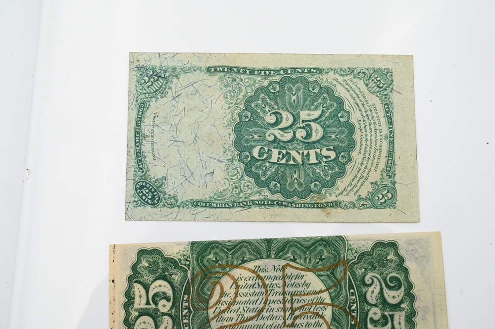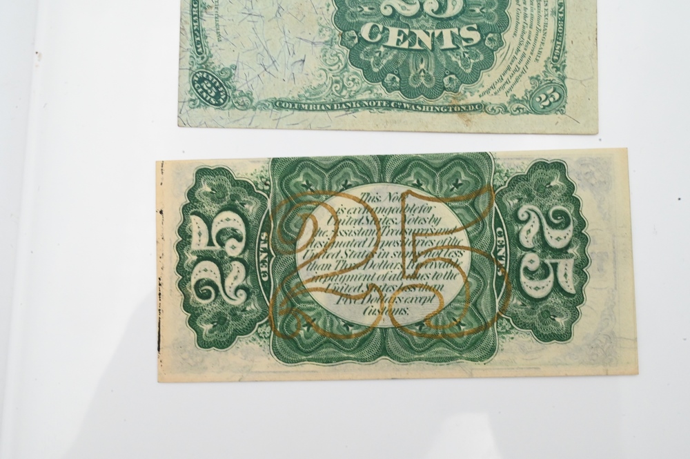Two 25 Cent Fractional Currency, to include paper bank notes, fifth issue Robert Walker and 1863.