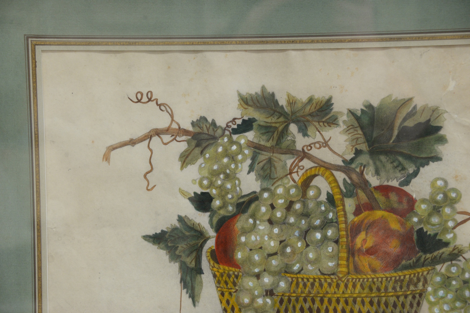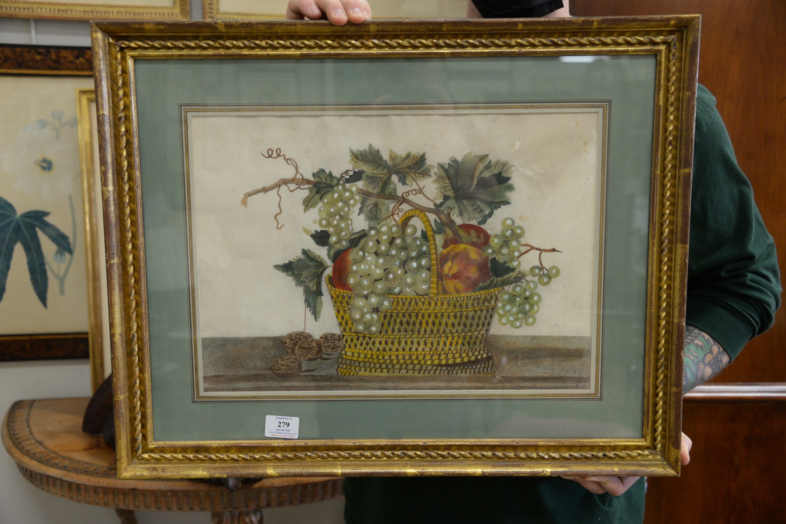 Lot 279: Watercolor Still Life, basket with fruit, unsigned, matted in gilt frame, sight size 12 x 17, in Victorian gilt frame, 19th Century.