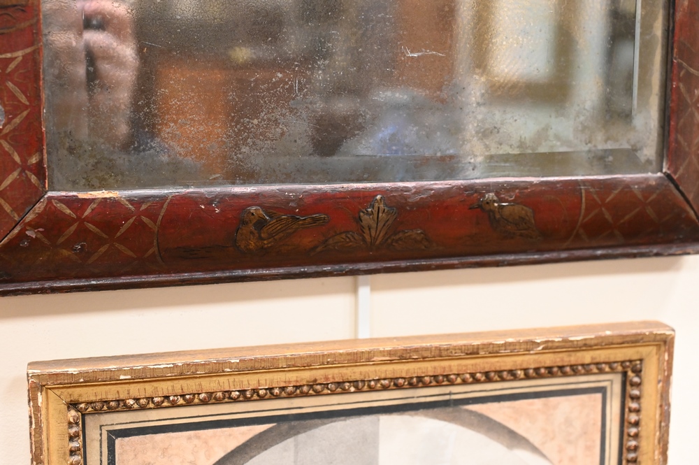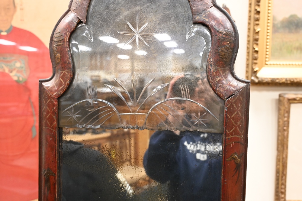 Rare William III Carved Chinoiserie Decorated Pier Mirror, in three parts, divided upright arched mirror plate, paint and wood damage at top, engraved at center with star and basket of flowers over scalloped edge in conforming frame, red japanned border, having raised figures of people and birds, height 42 inches. Provenance: Lillian Blankley Cogan, 1988. Estate of Wallace Bradway, New Haven, CT.