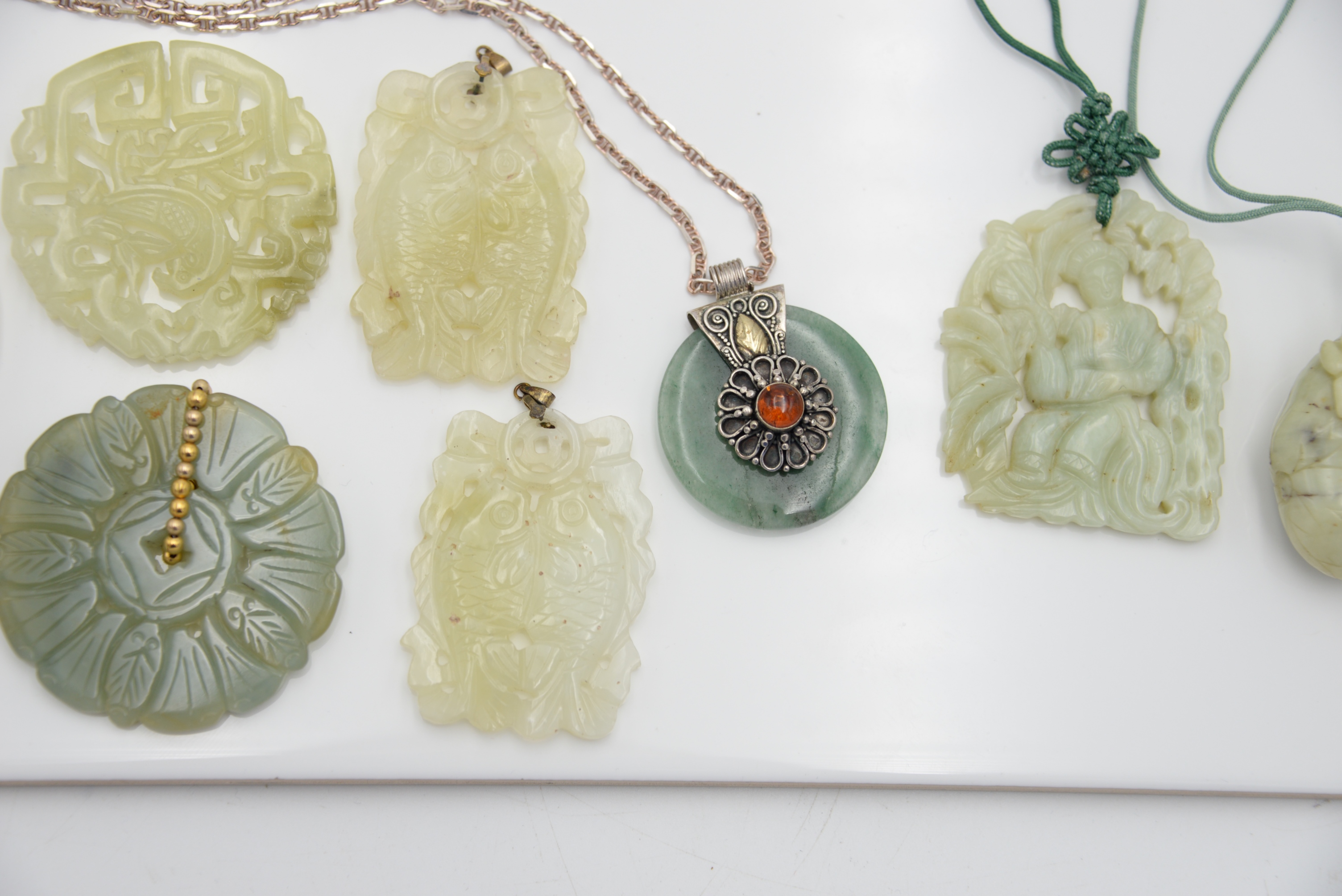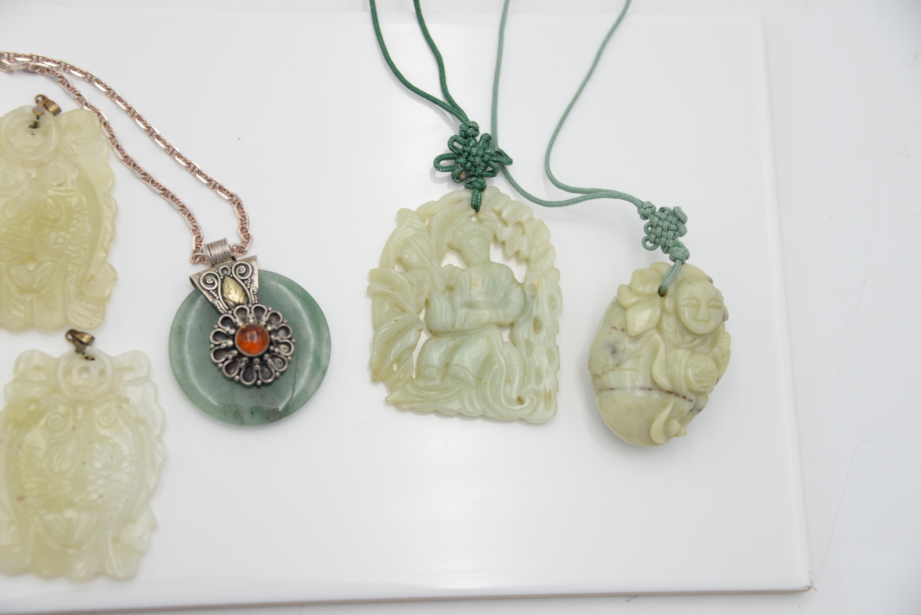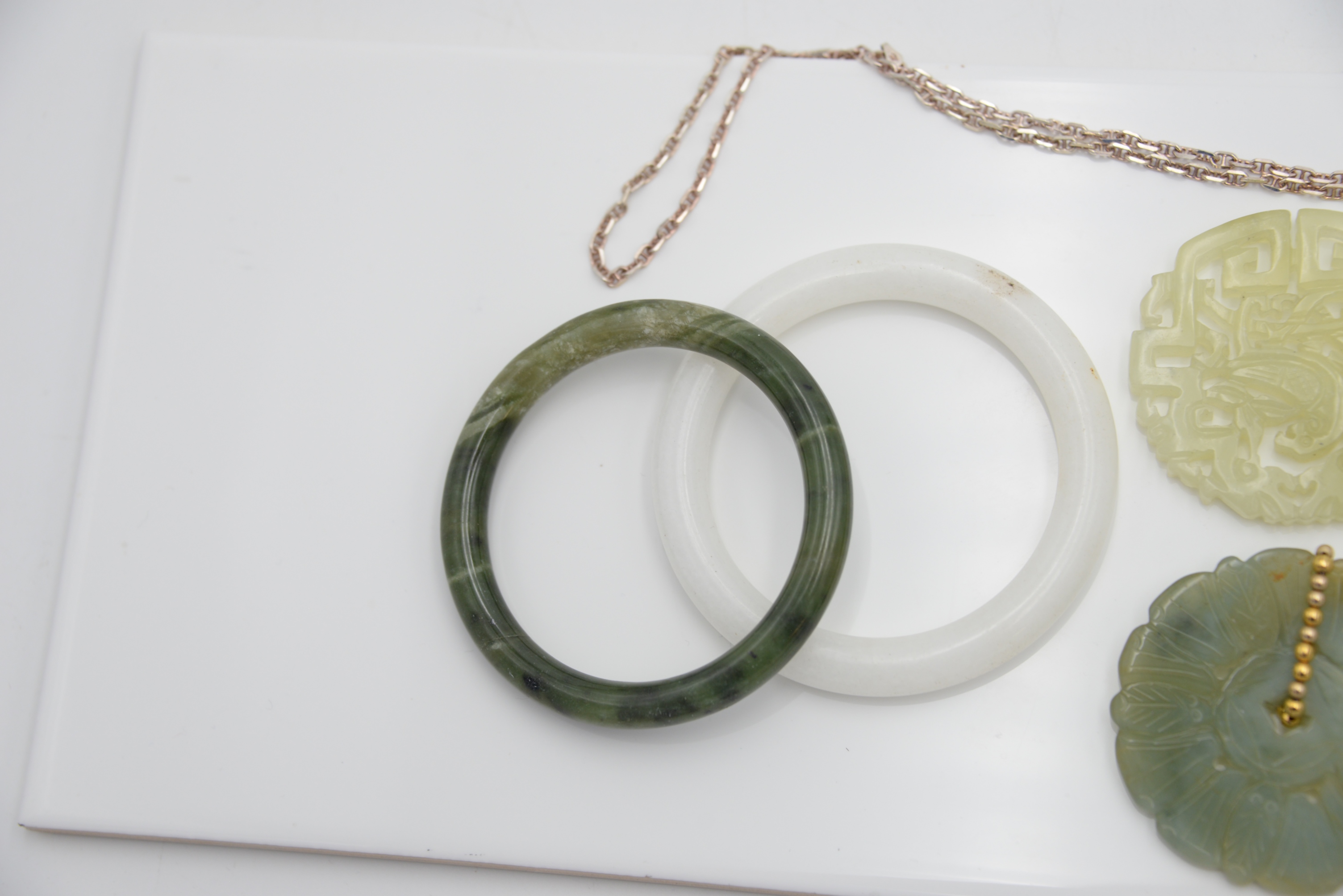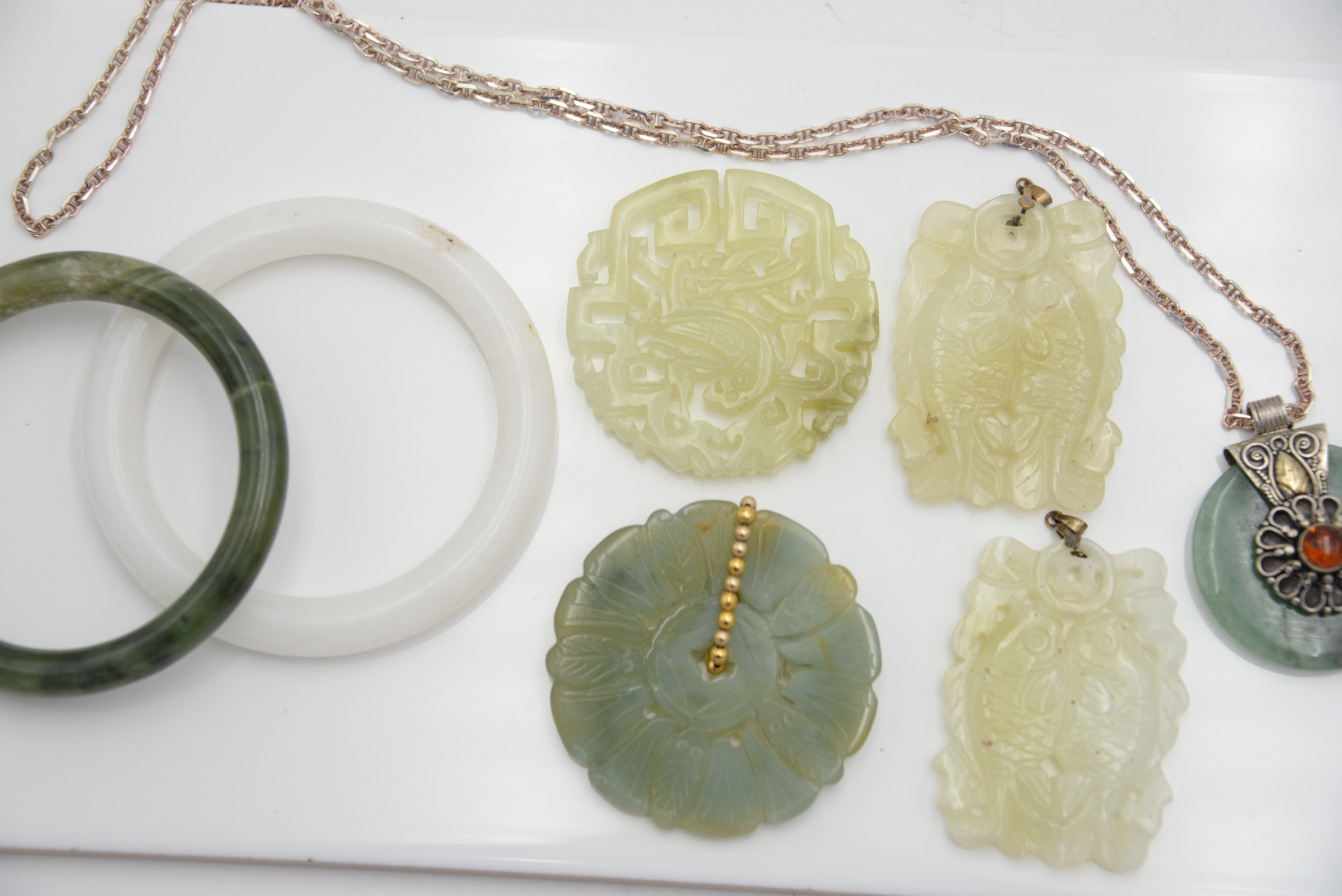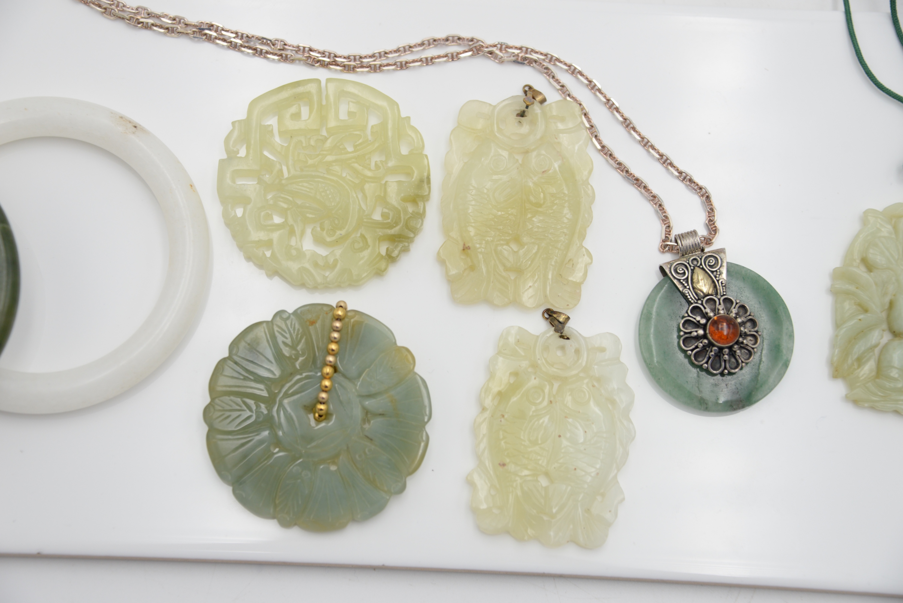 Nine Piece Jade Lot, to include two bracelets and seven carved medallions.