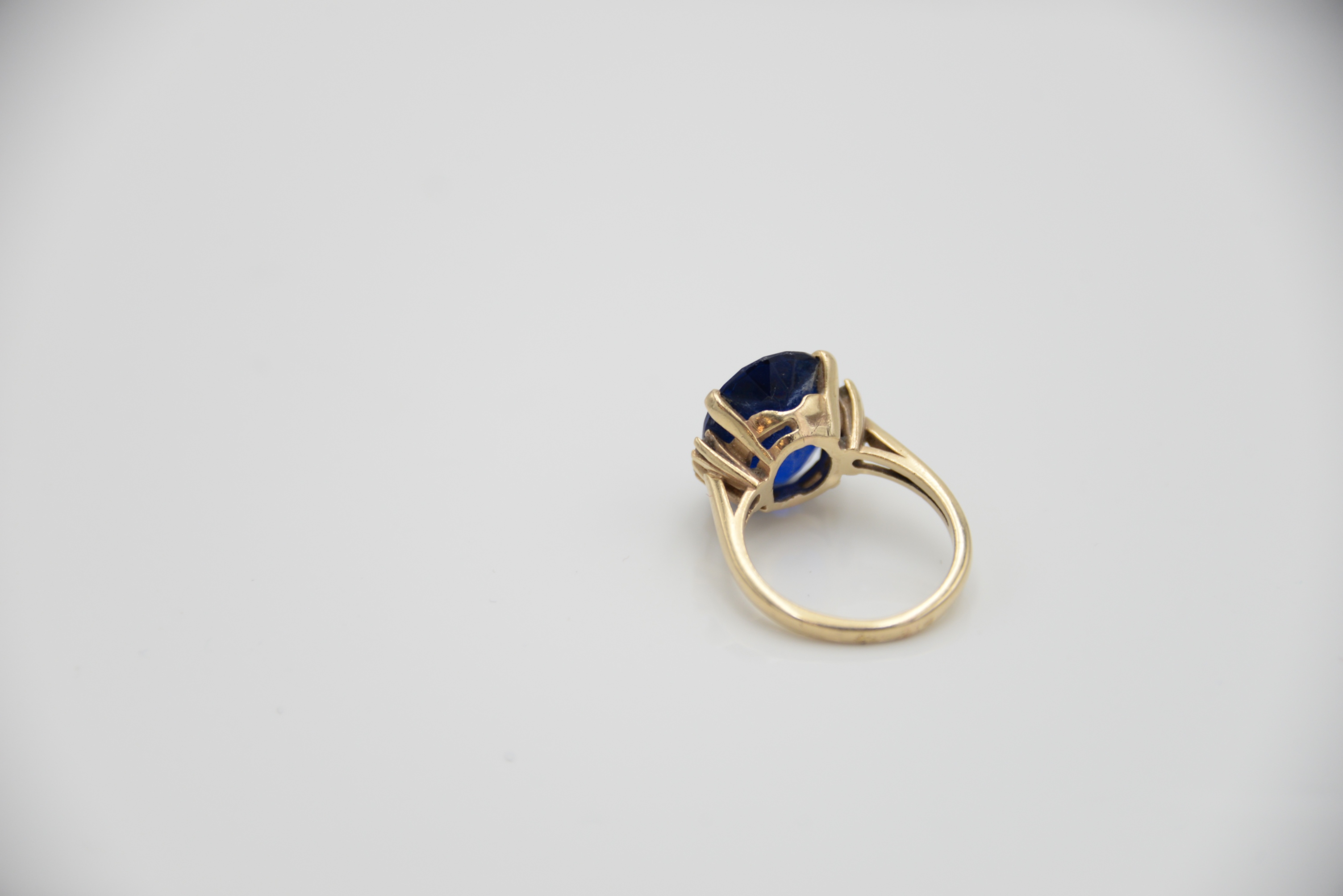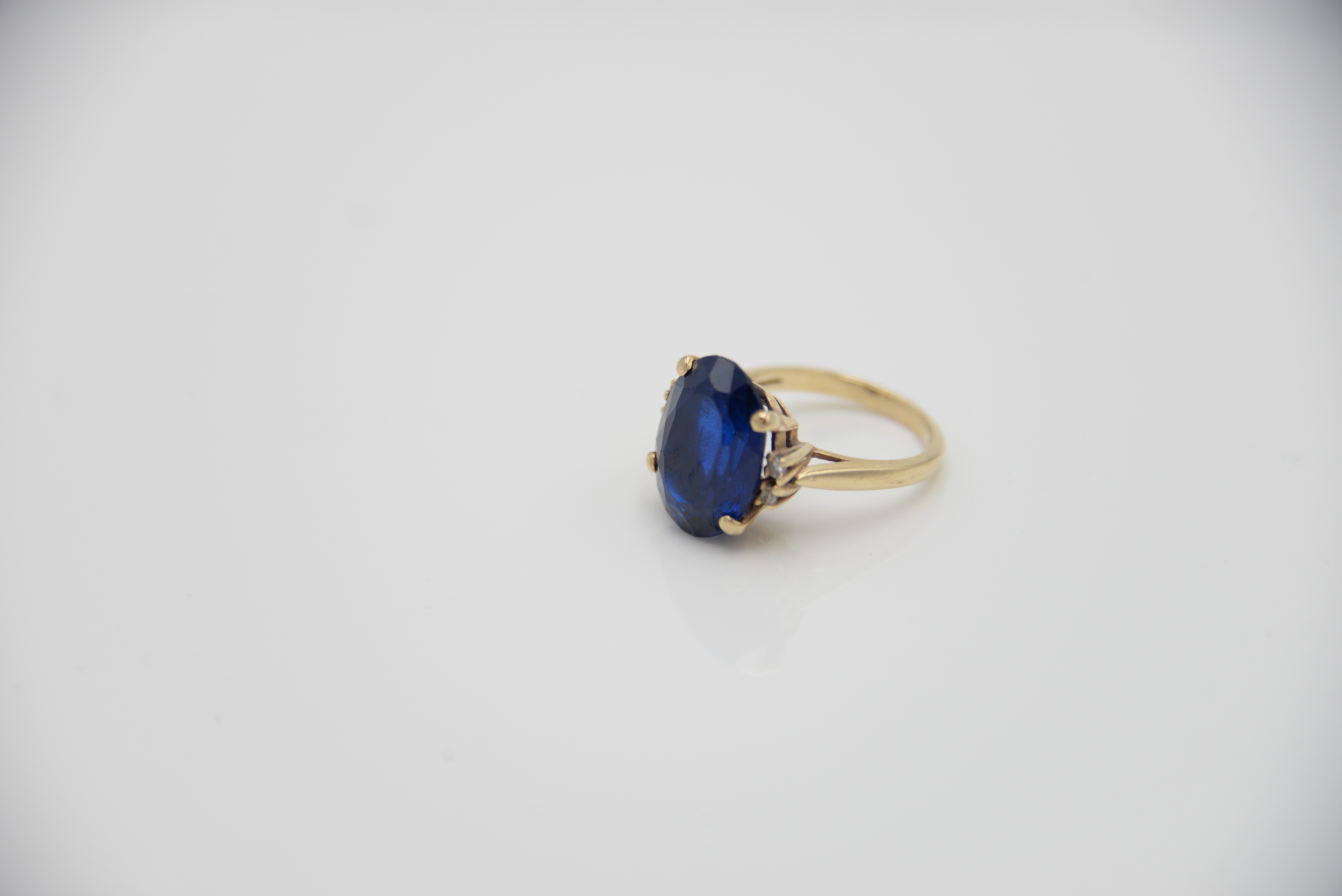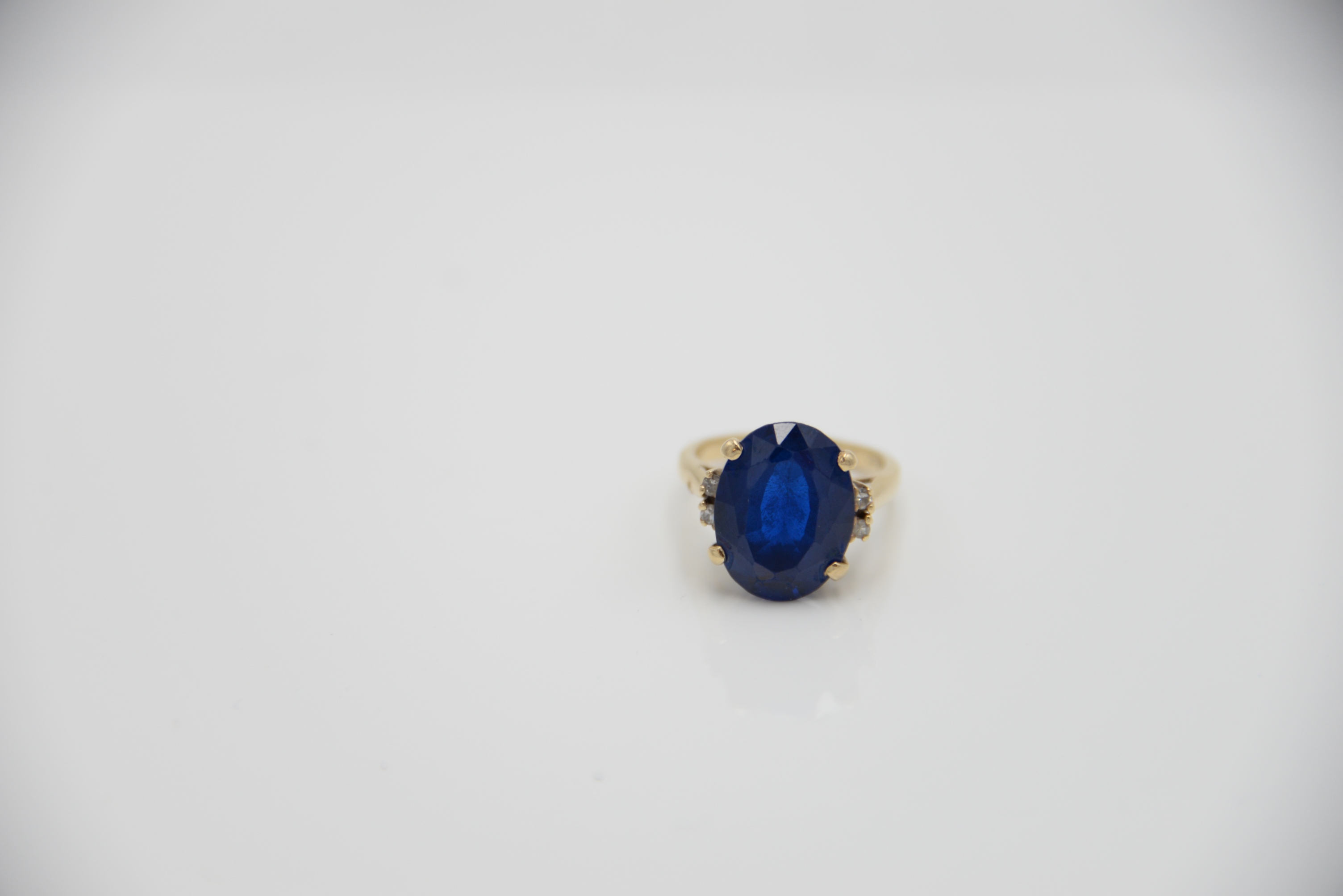 14 Karat Yellow Gold Ring set with oval blue stone flanked by small diamonds size 6 1/4.