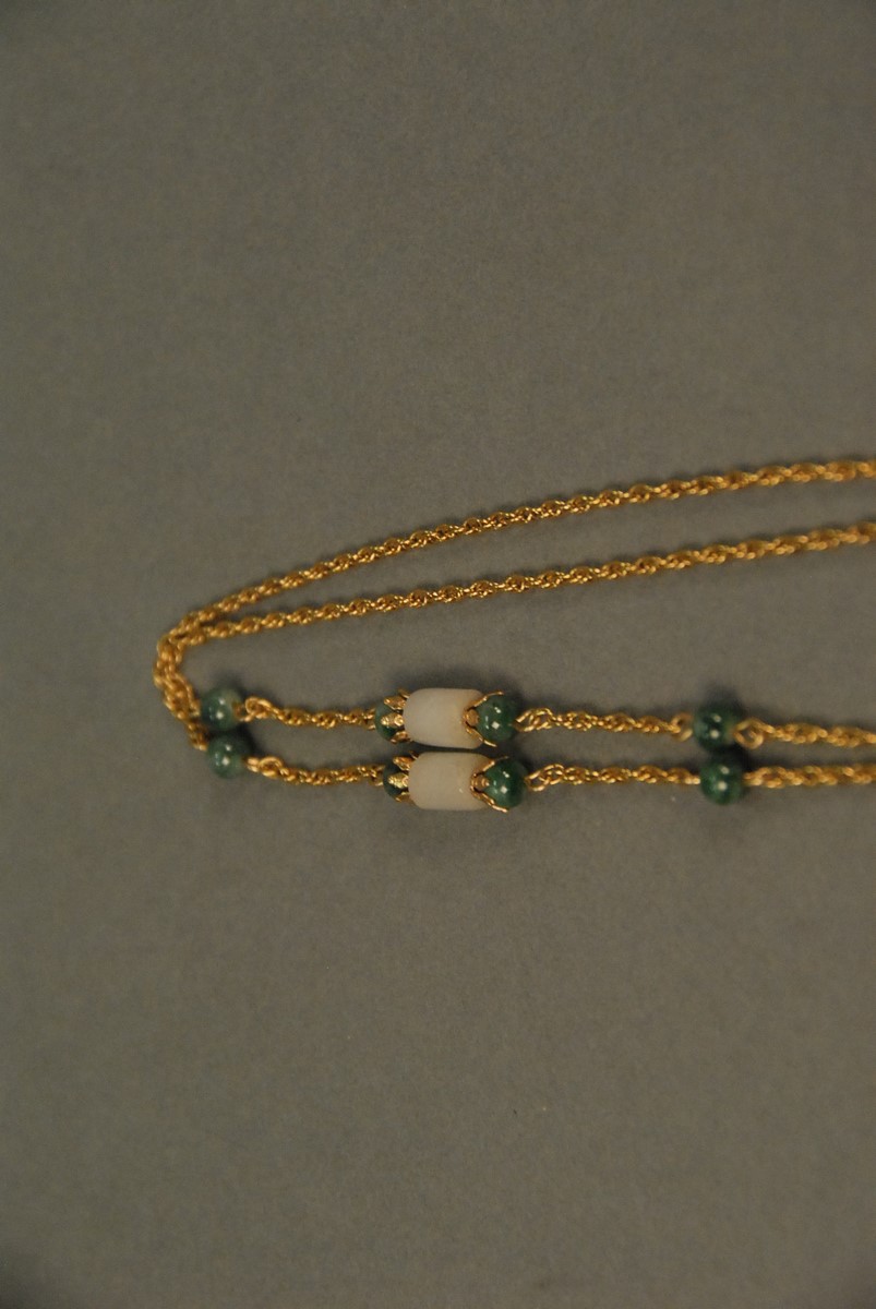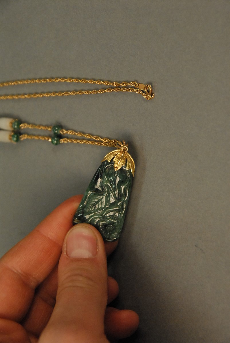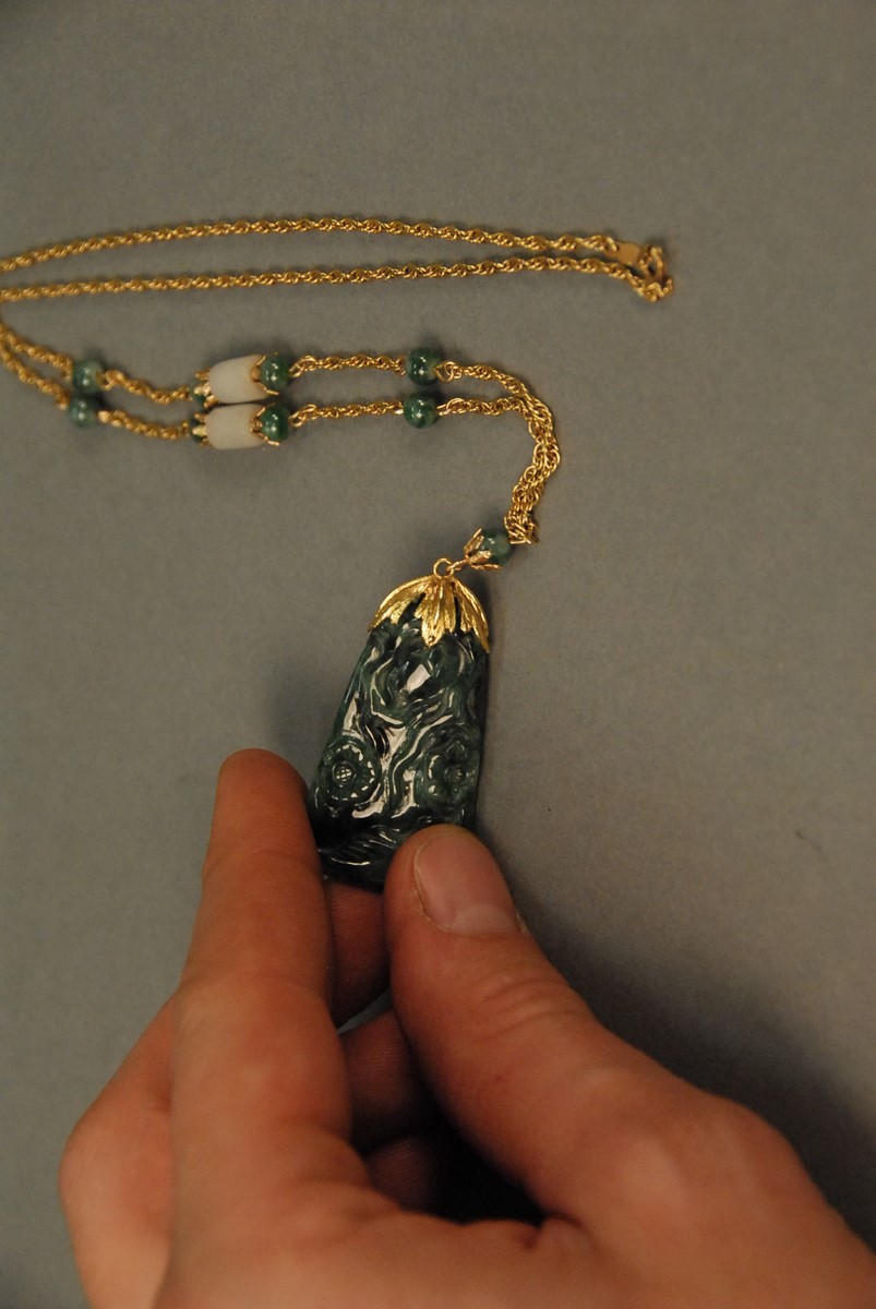14K gold chain mounted with carved spinach green jade pendant, chain set with small jade beads. lg. 22 in. Provenance: Property from a Private Collection Sold for the Benefit of the Virginia Historical Society.