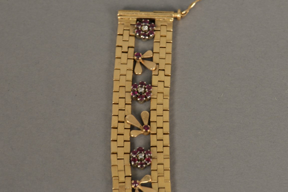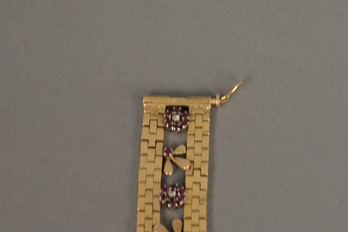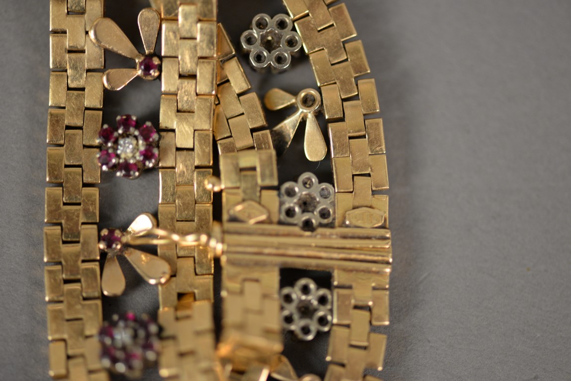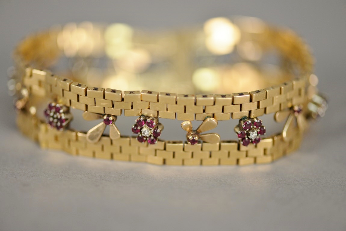 Lot 28: 18K gold bracelet set with nine red stone and diamond flowers. one small diamond missing and 3 flowers detached on one end 58.4…
