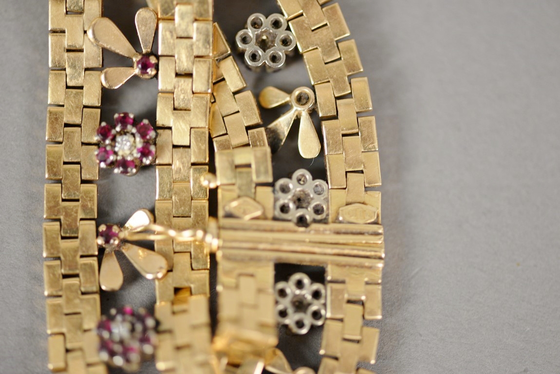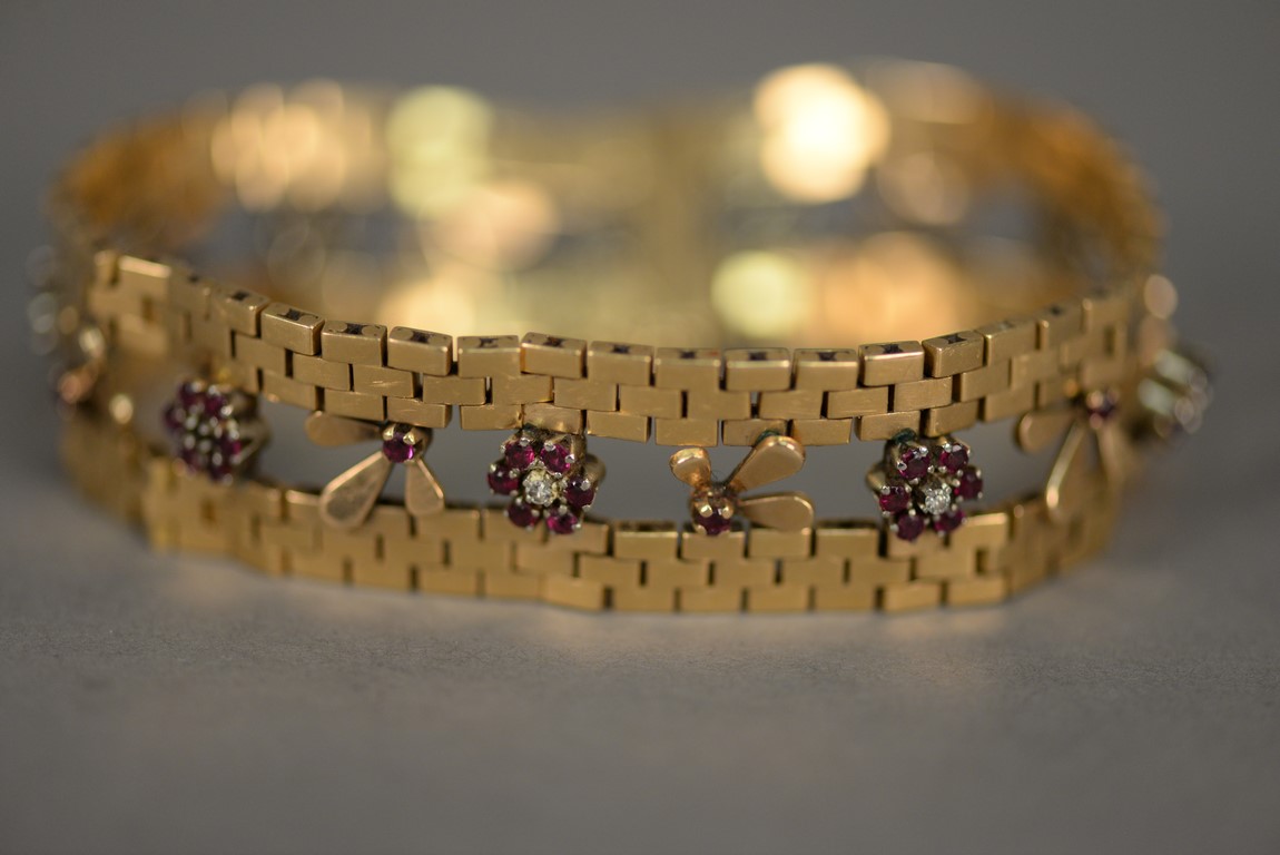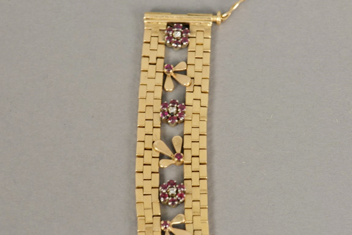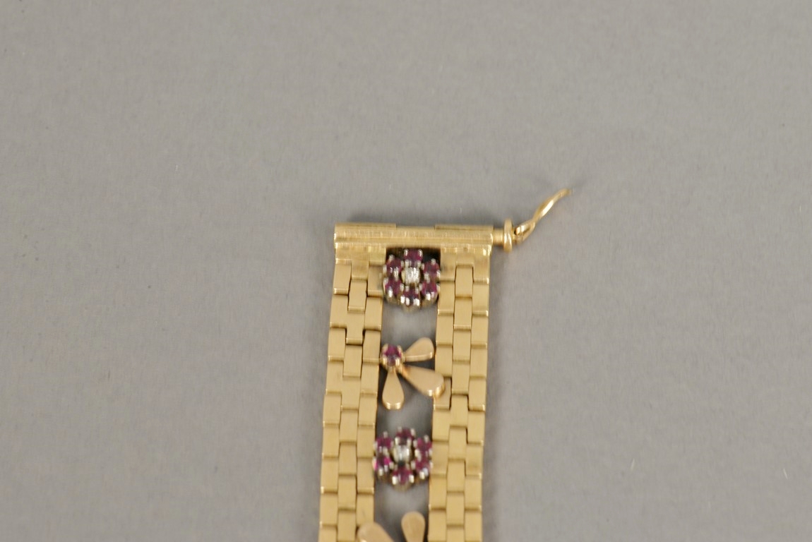Lot 28: 18K gold bracelet set with nine red stone and diamond flowers. one small diamond missing and 3 flowers detached on one end 58.4…