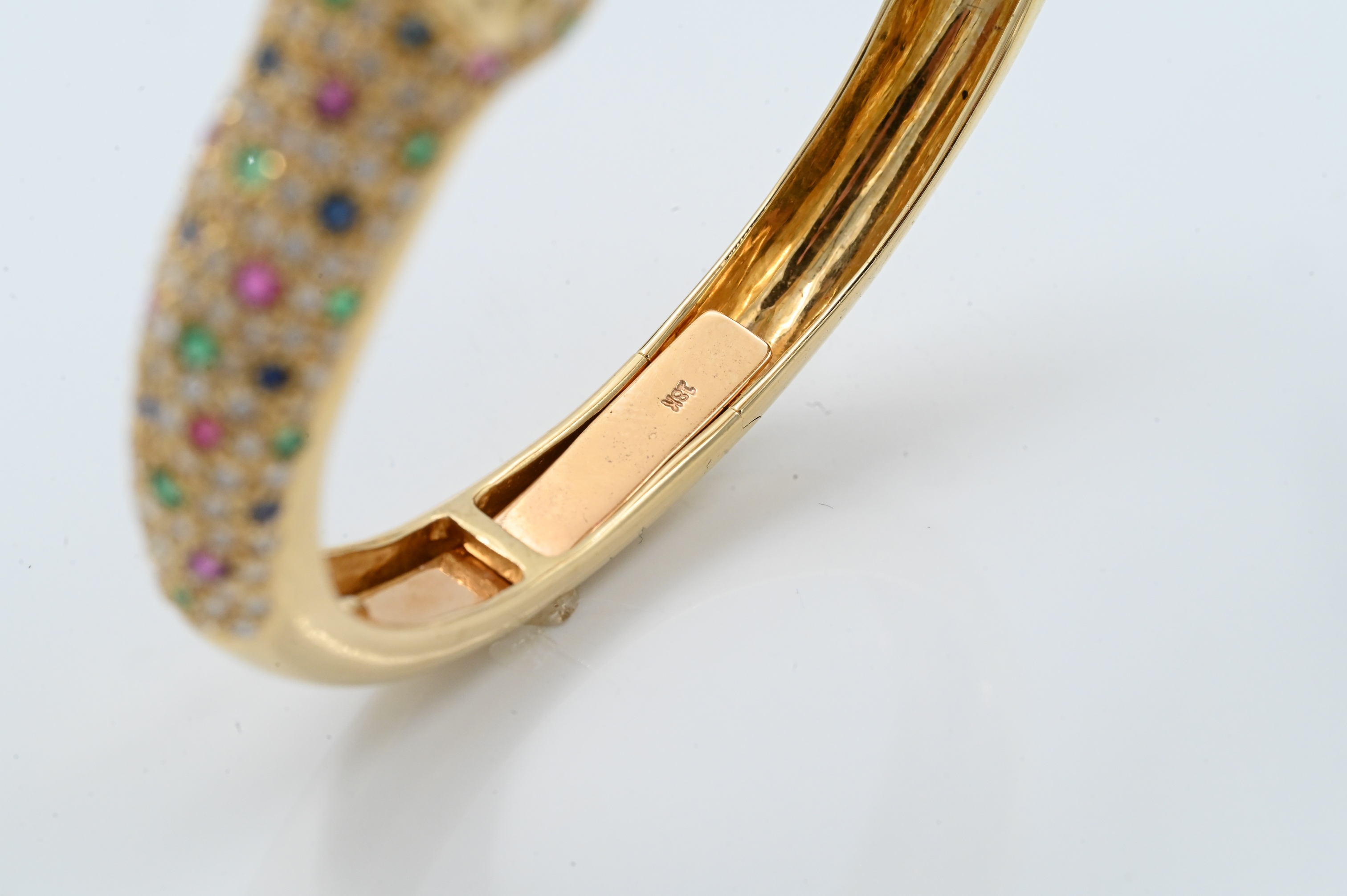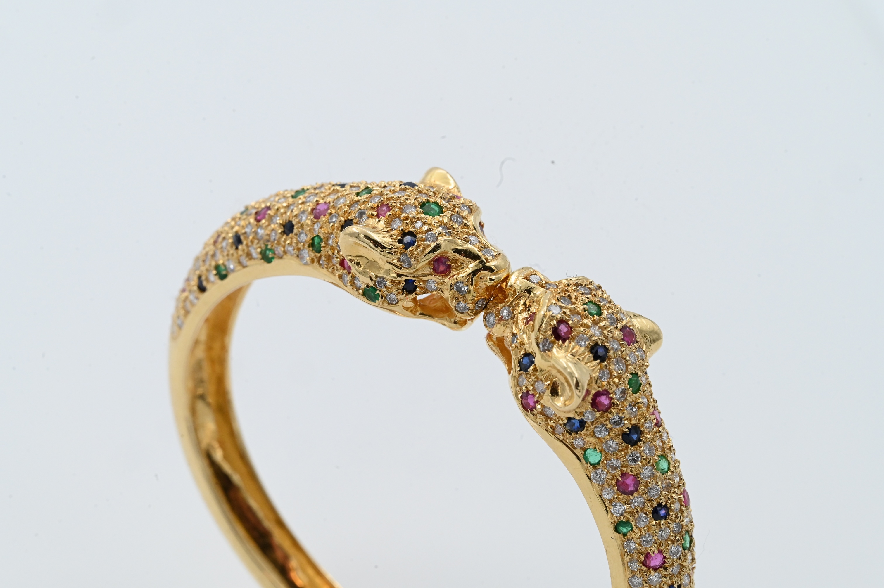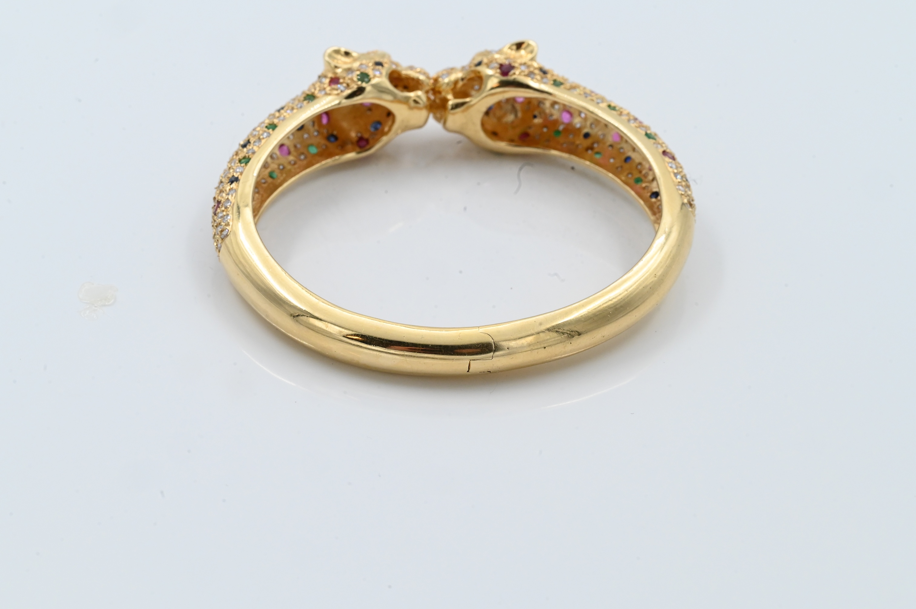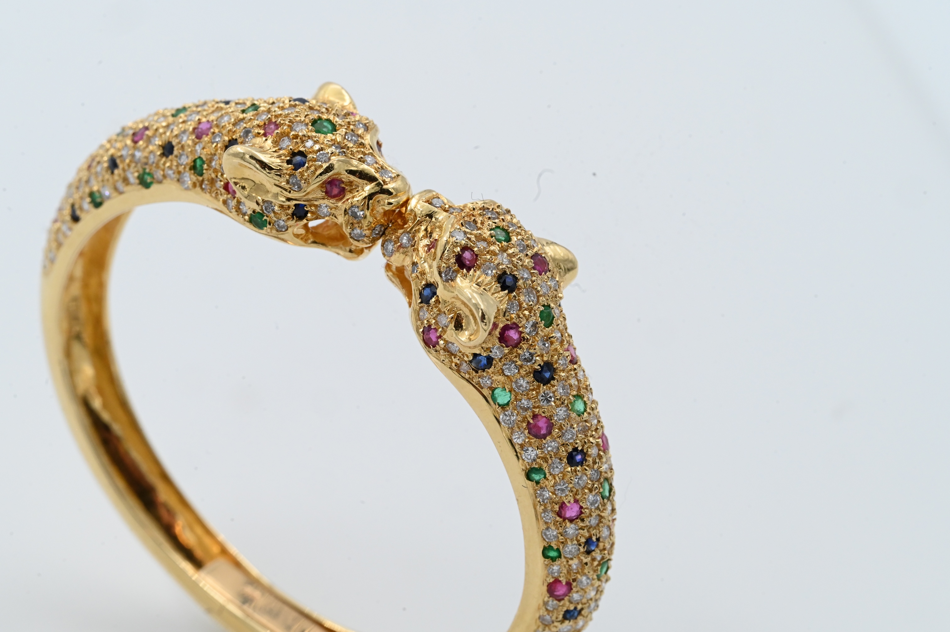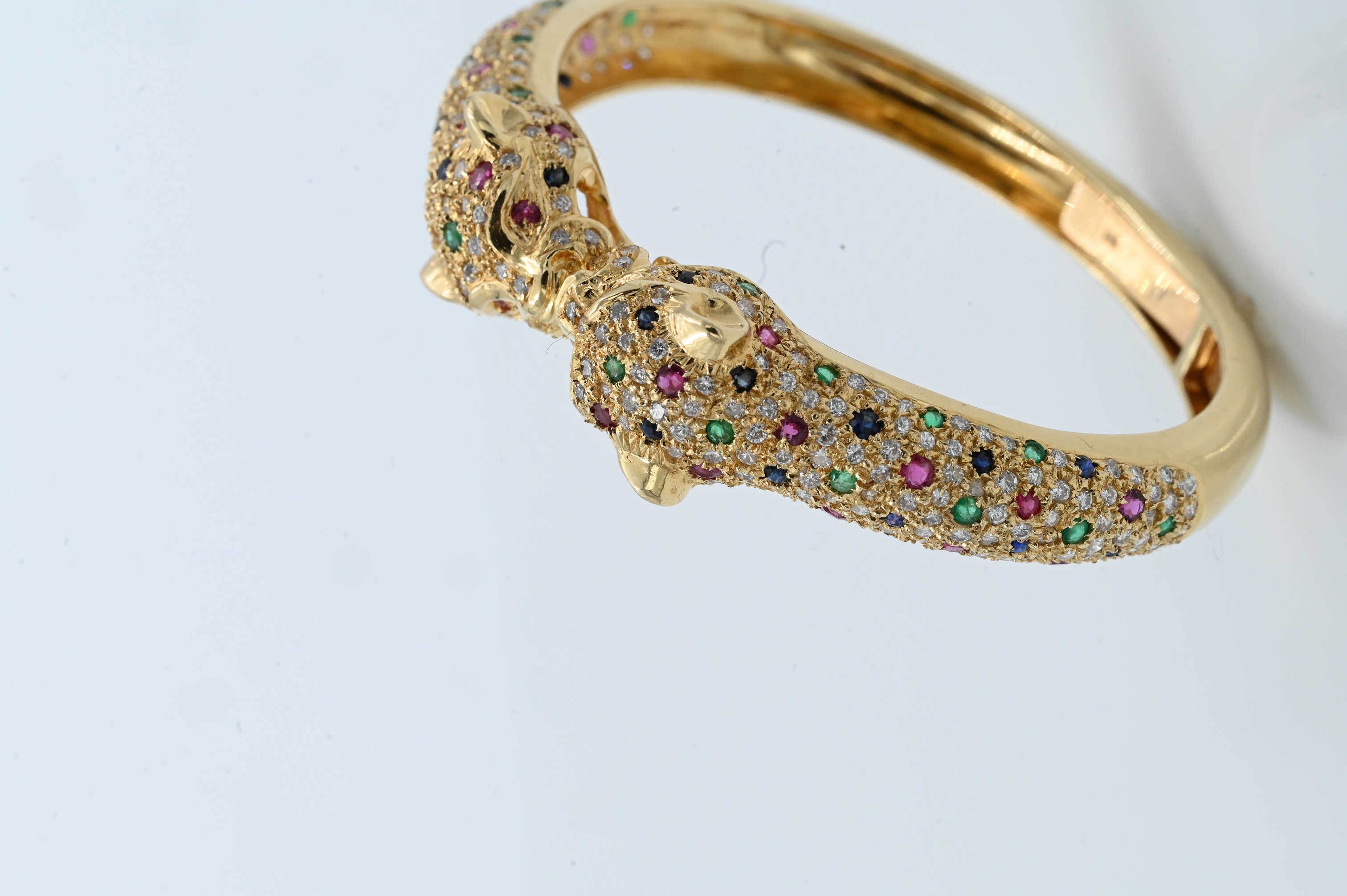 having two leopard heads encrusted with diamonds, emeralds, and sapphires