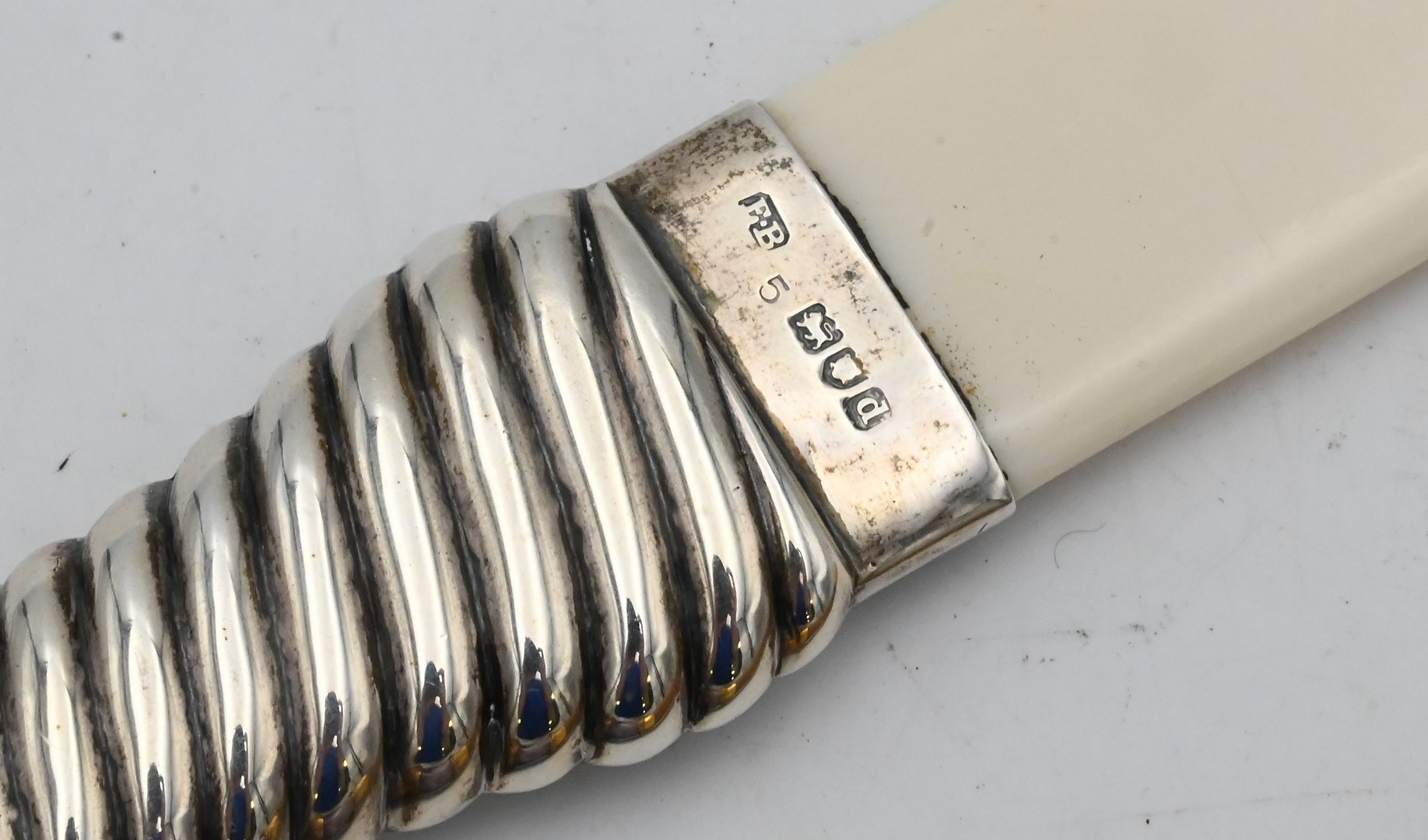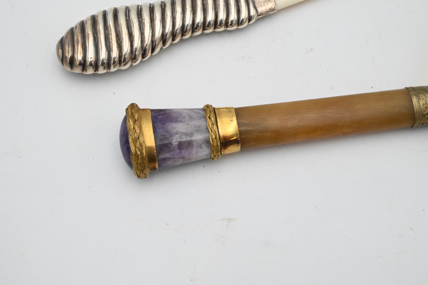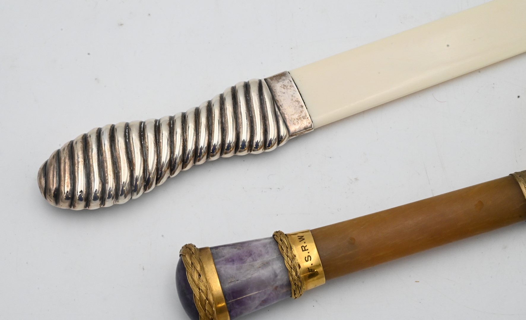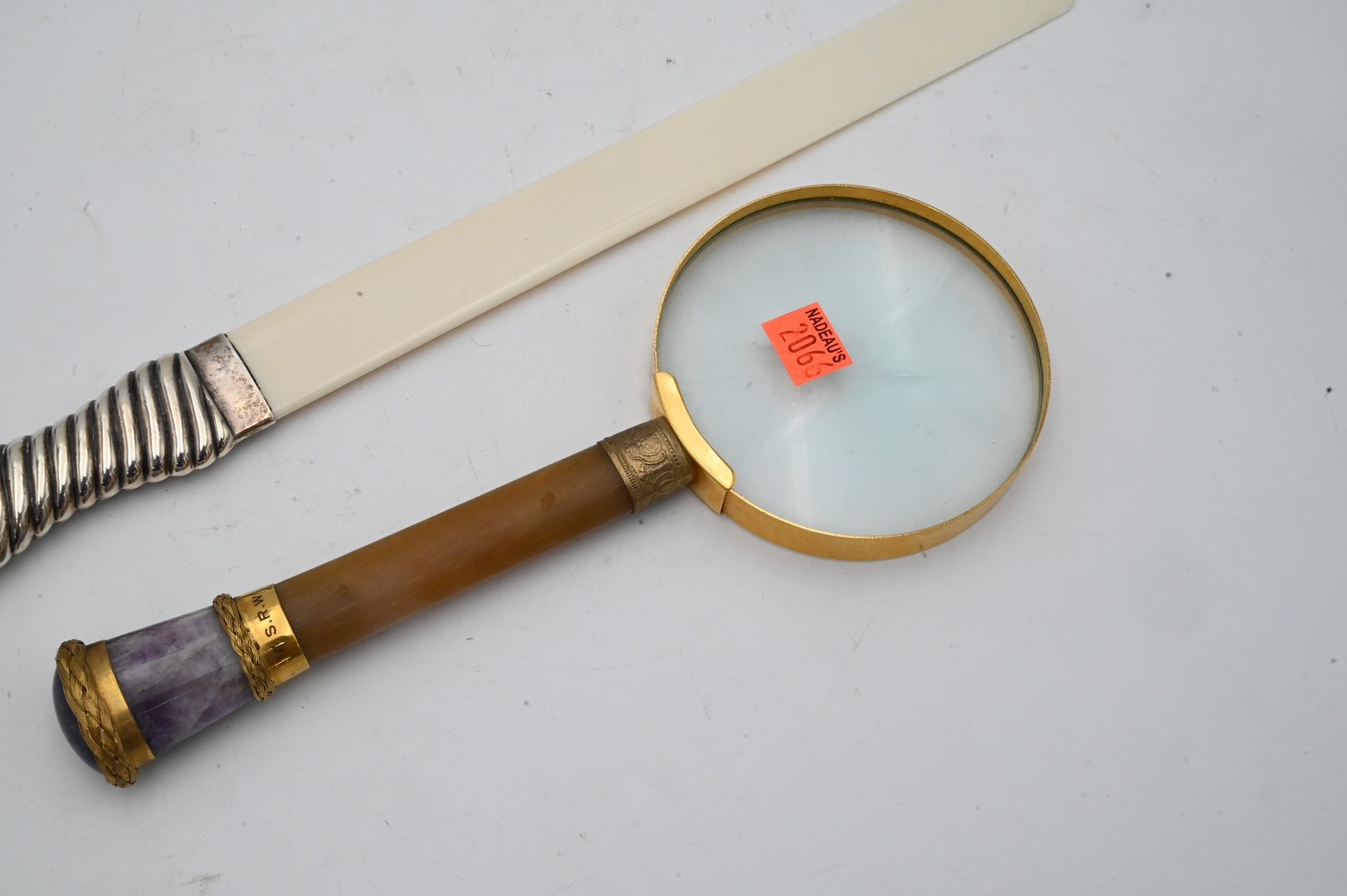 Amethyst and 18 Karat Gilt Handled Magnifying Glass, having horn handle, early 20th century, inscribed “F.S.R.W.”, along with an English sterling and bone page turner hallmarked “E.B.”.
