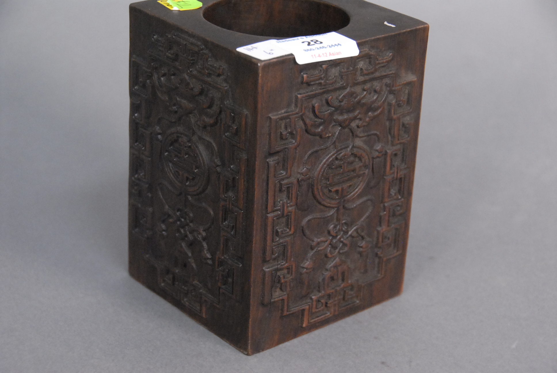 Lot 28: Carved hardwood square brush pot with carved bat and geometric designs on each side, possibly zitan, ht. 6in.