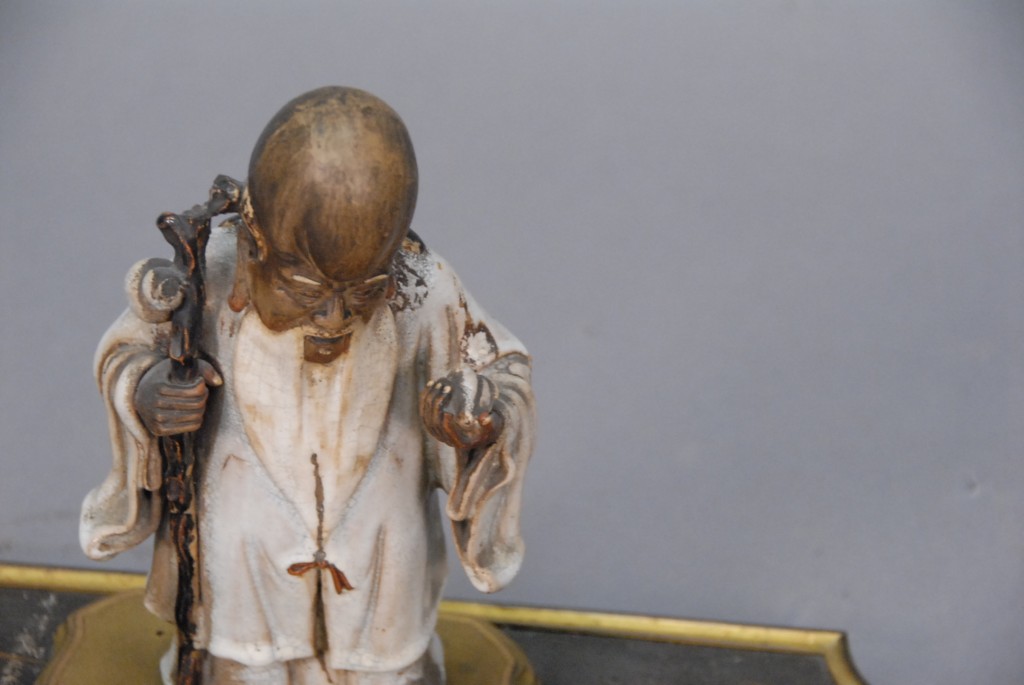 Chinoiserie and brass desk set with porcelain immortal figure, lg. 17in. dp. 10in.