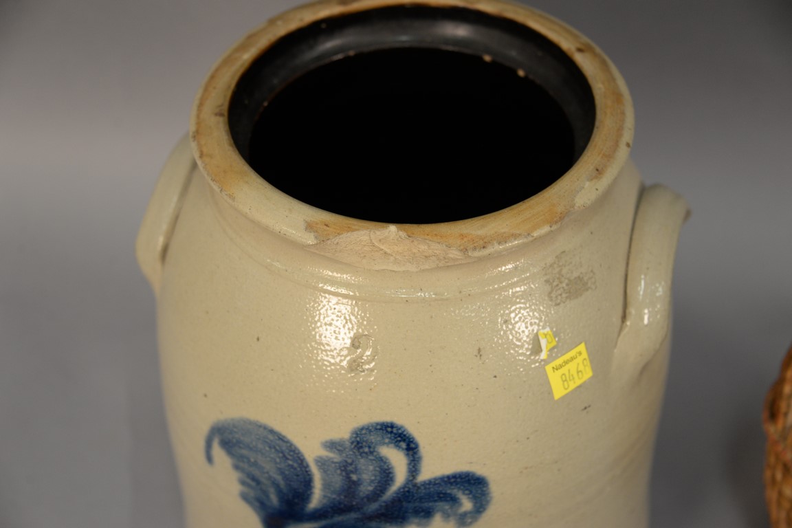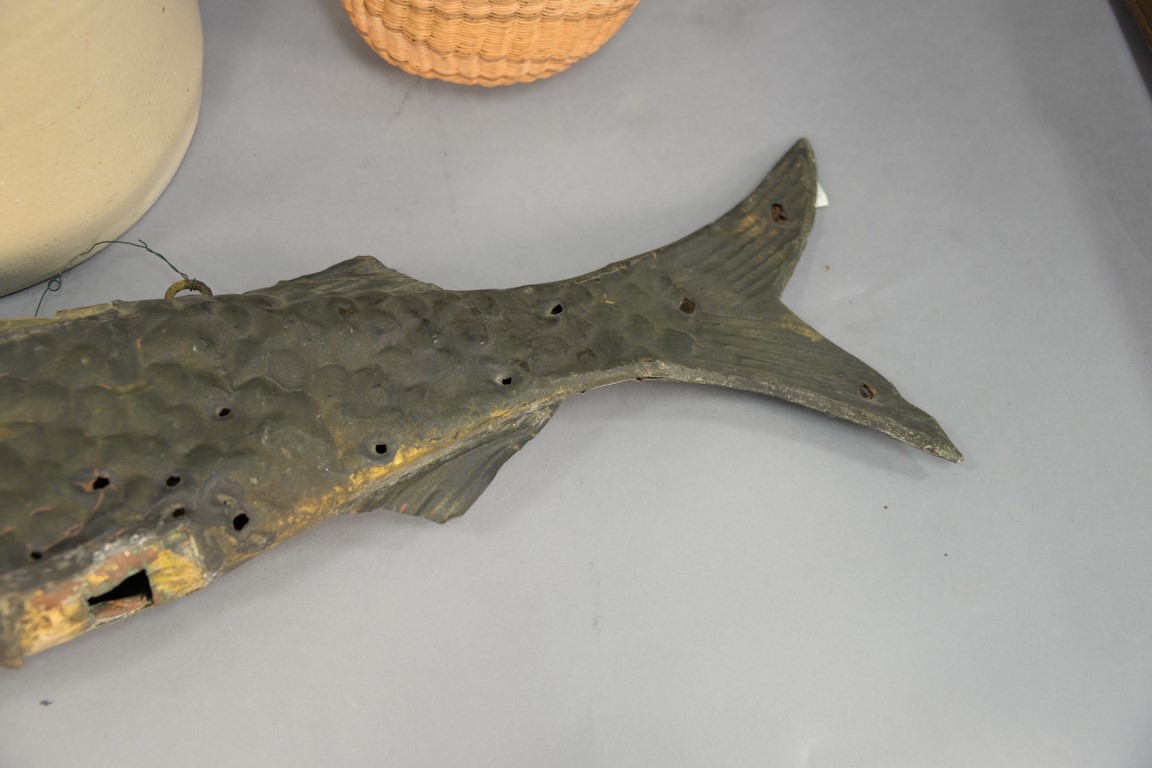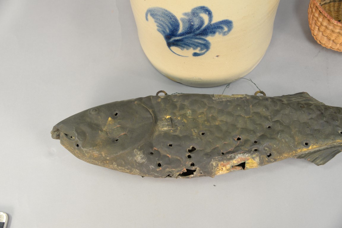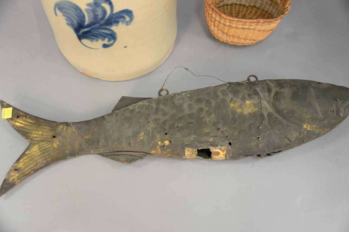 Lot 28: Cod fish weathervane as is with remnant of gilt lg. 24in. and blue decorated crock and basket ht. 11in.