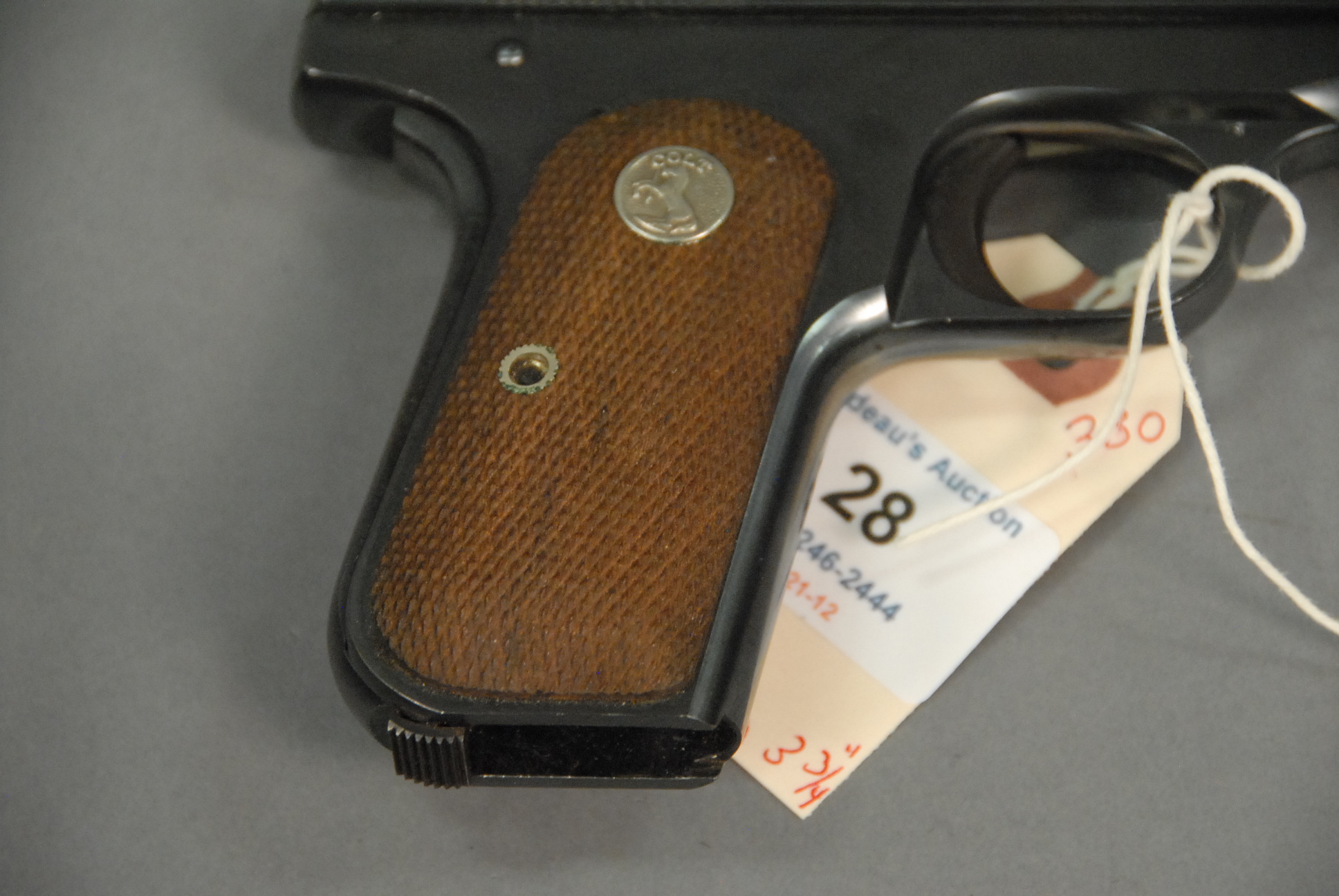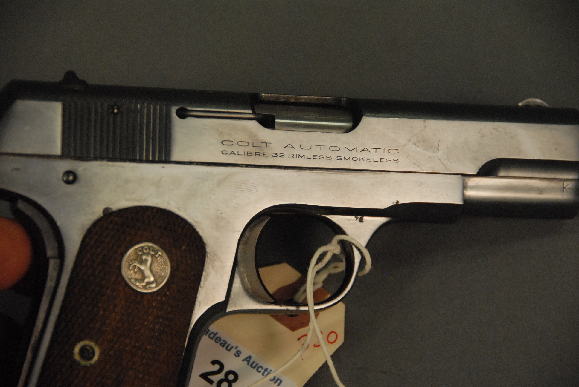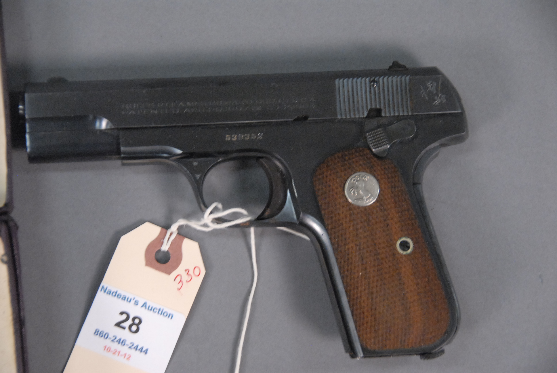 Lot 28: Colt model 1903 sem-automatic pocket pistol, .32 cal with original box, excellent condition, barrel 3 3/4, sn 53852 330.