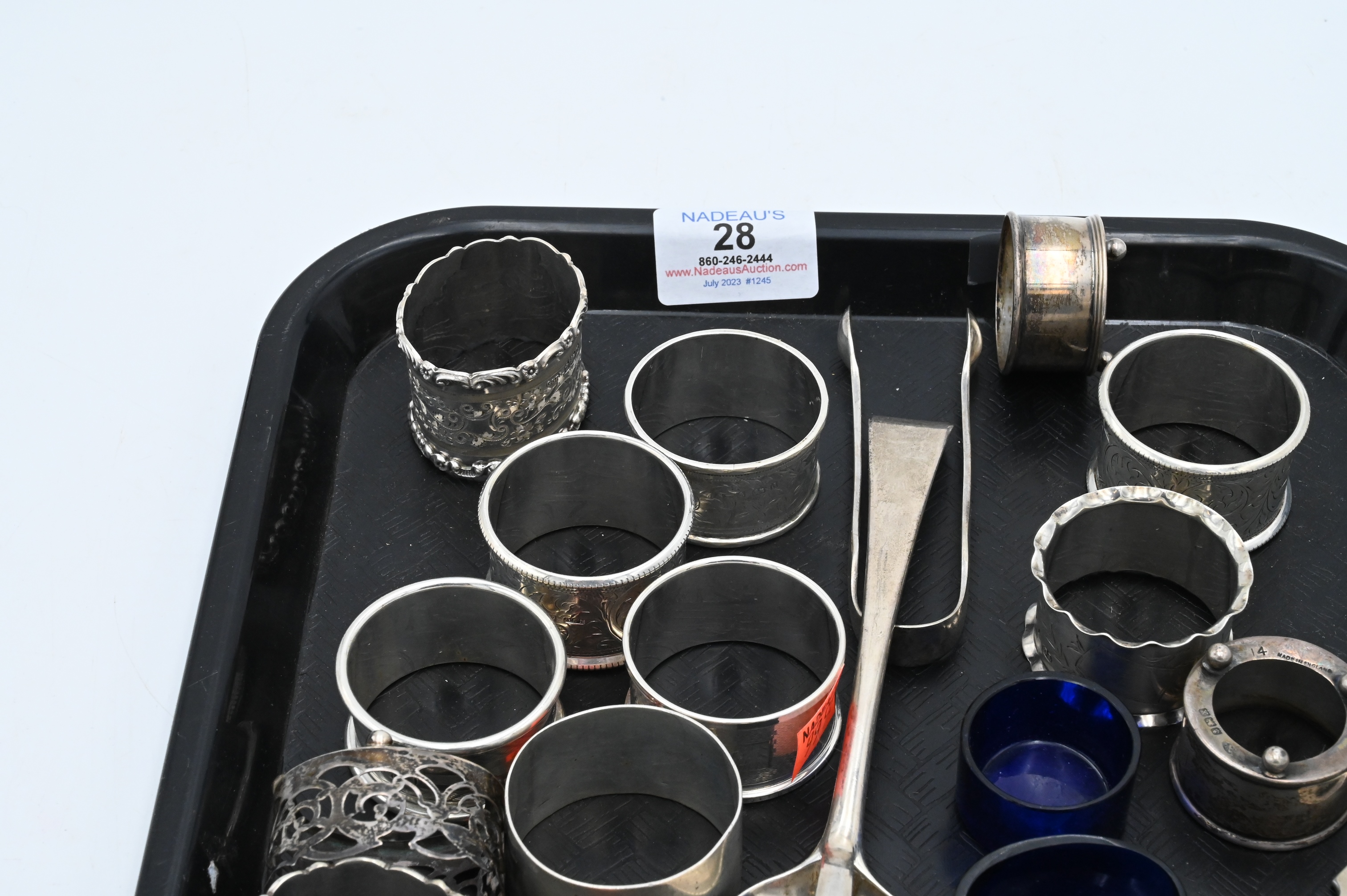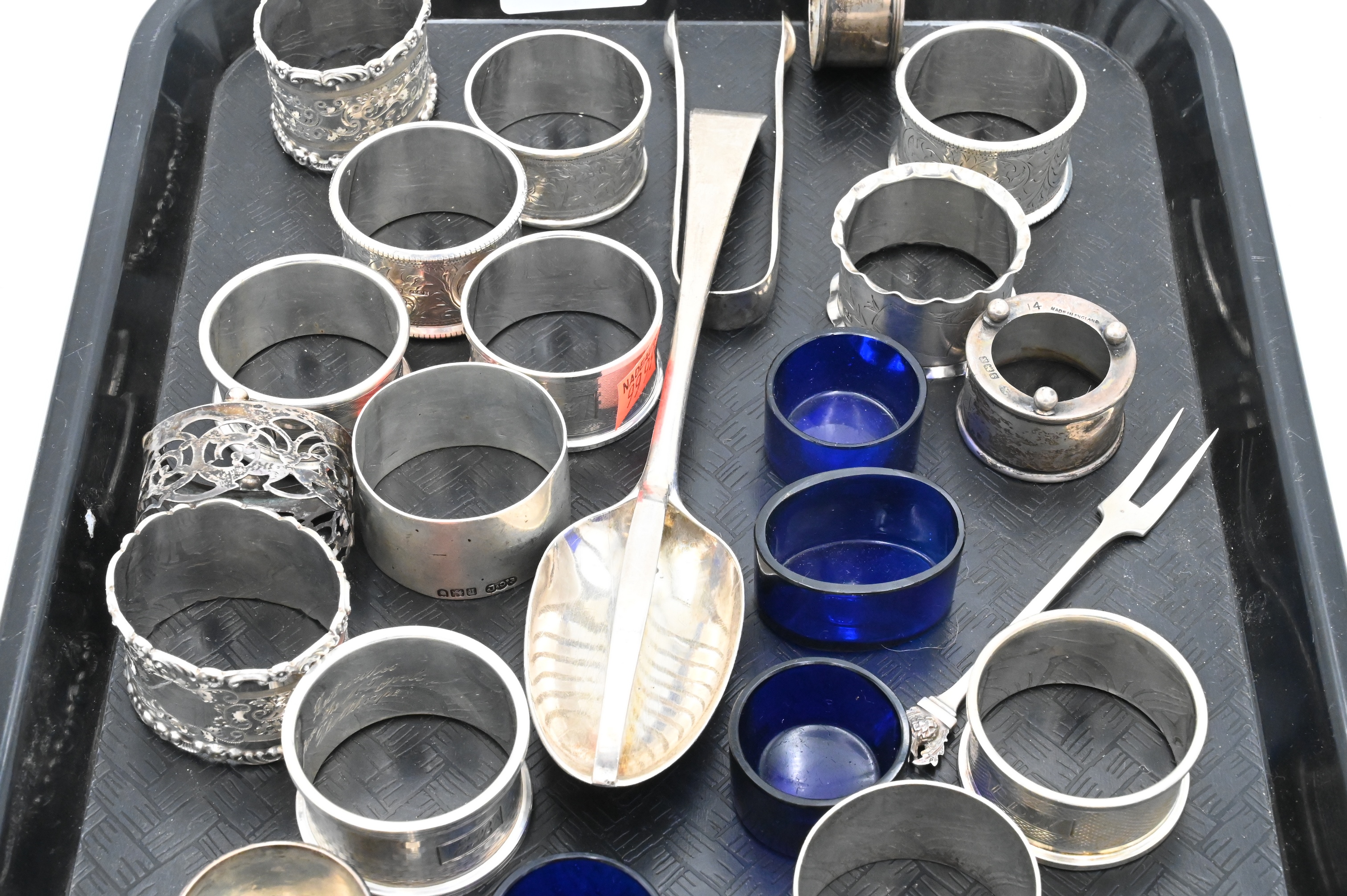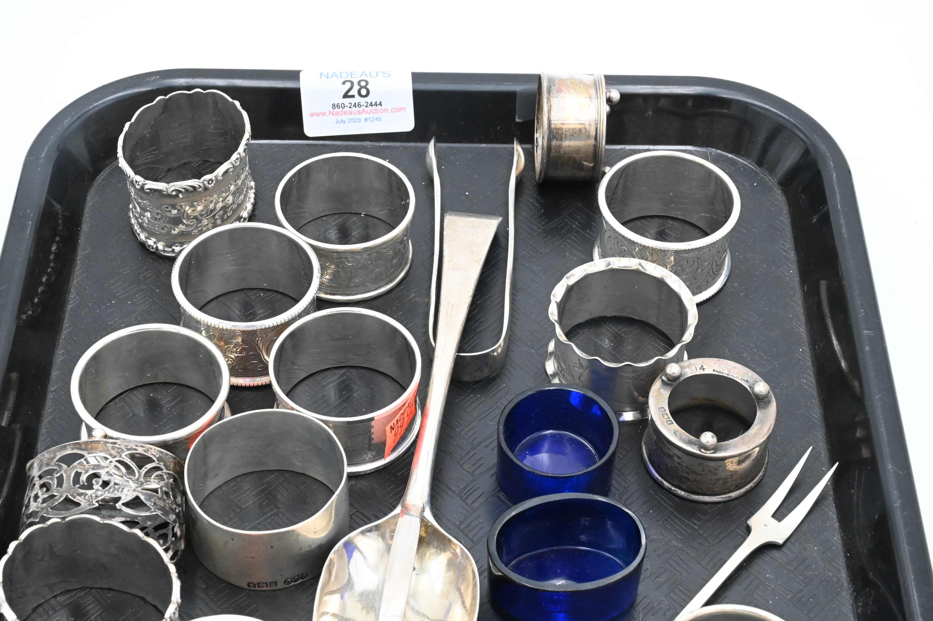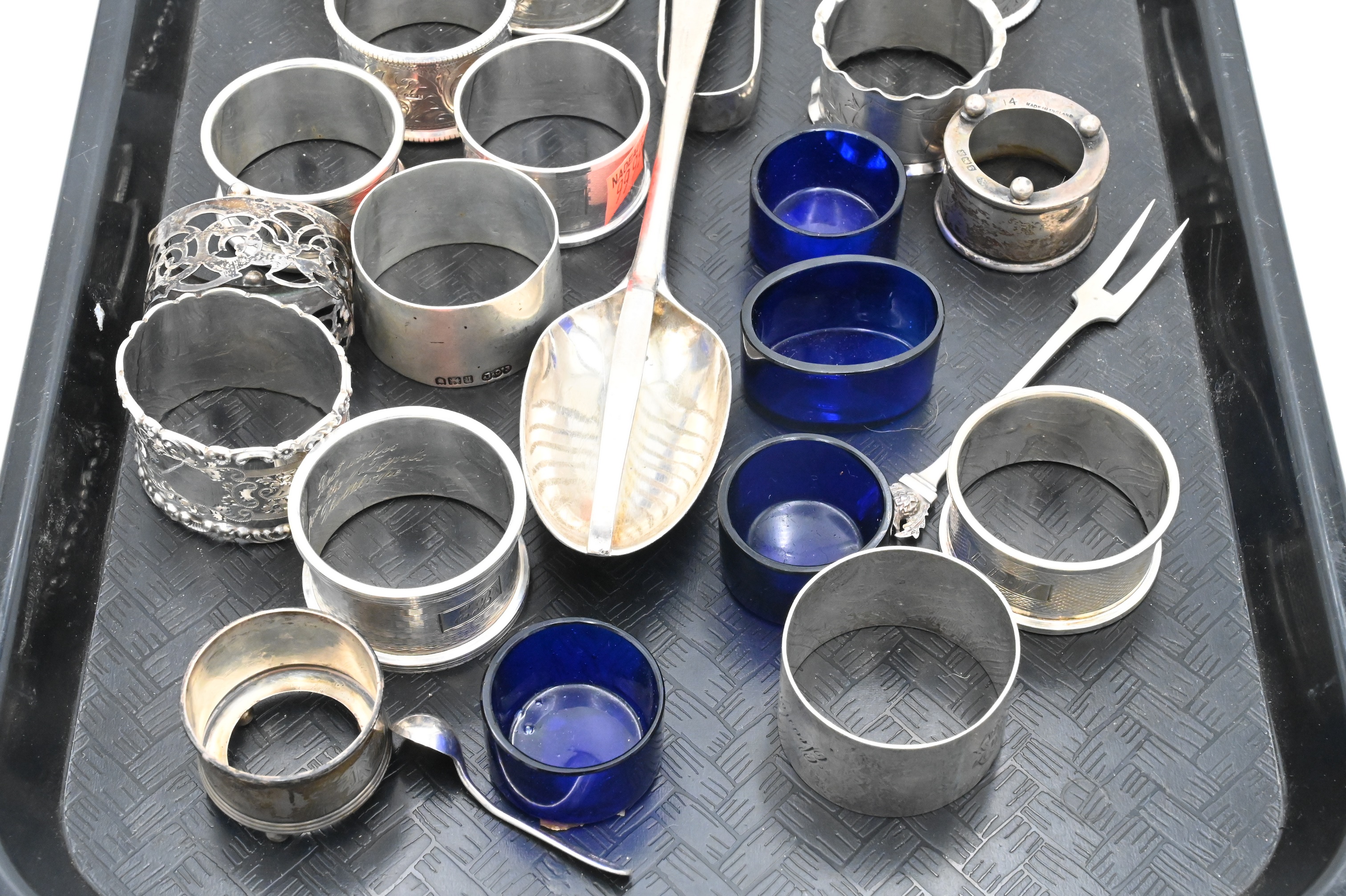 English Sterling Silver Lot, to include salts, napkin rings, fork, tong and spoon, 14 t.oz.