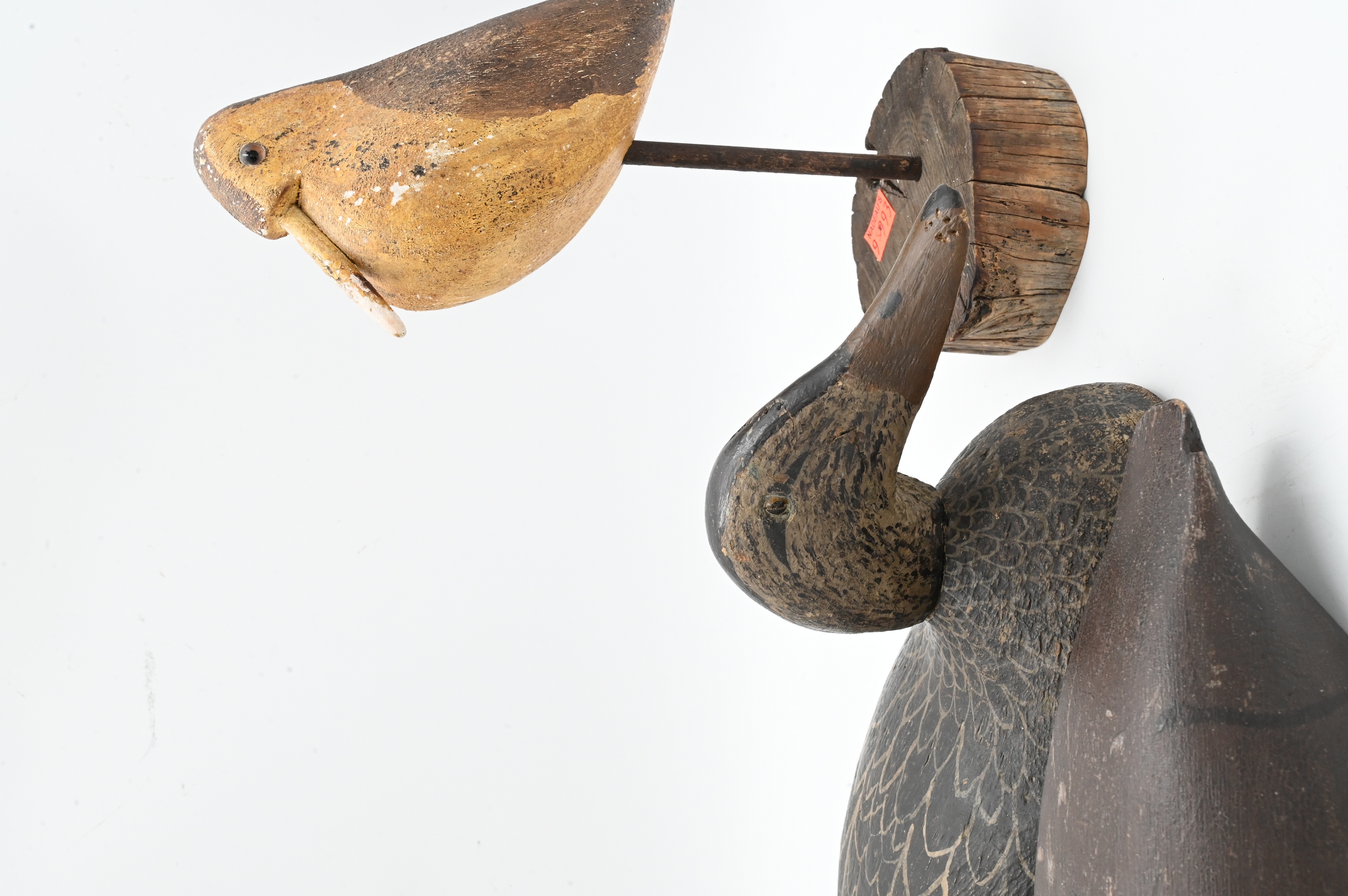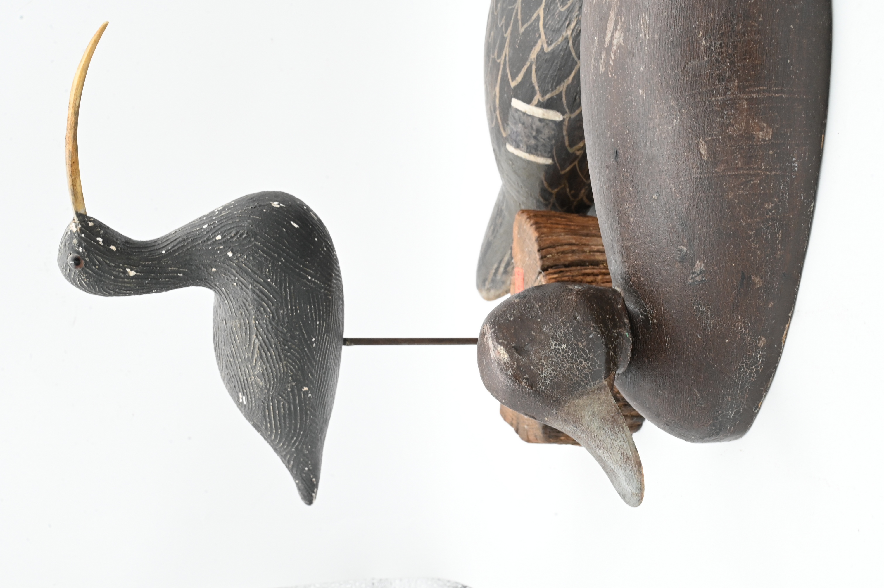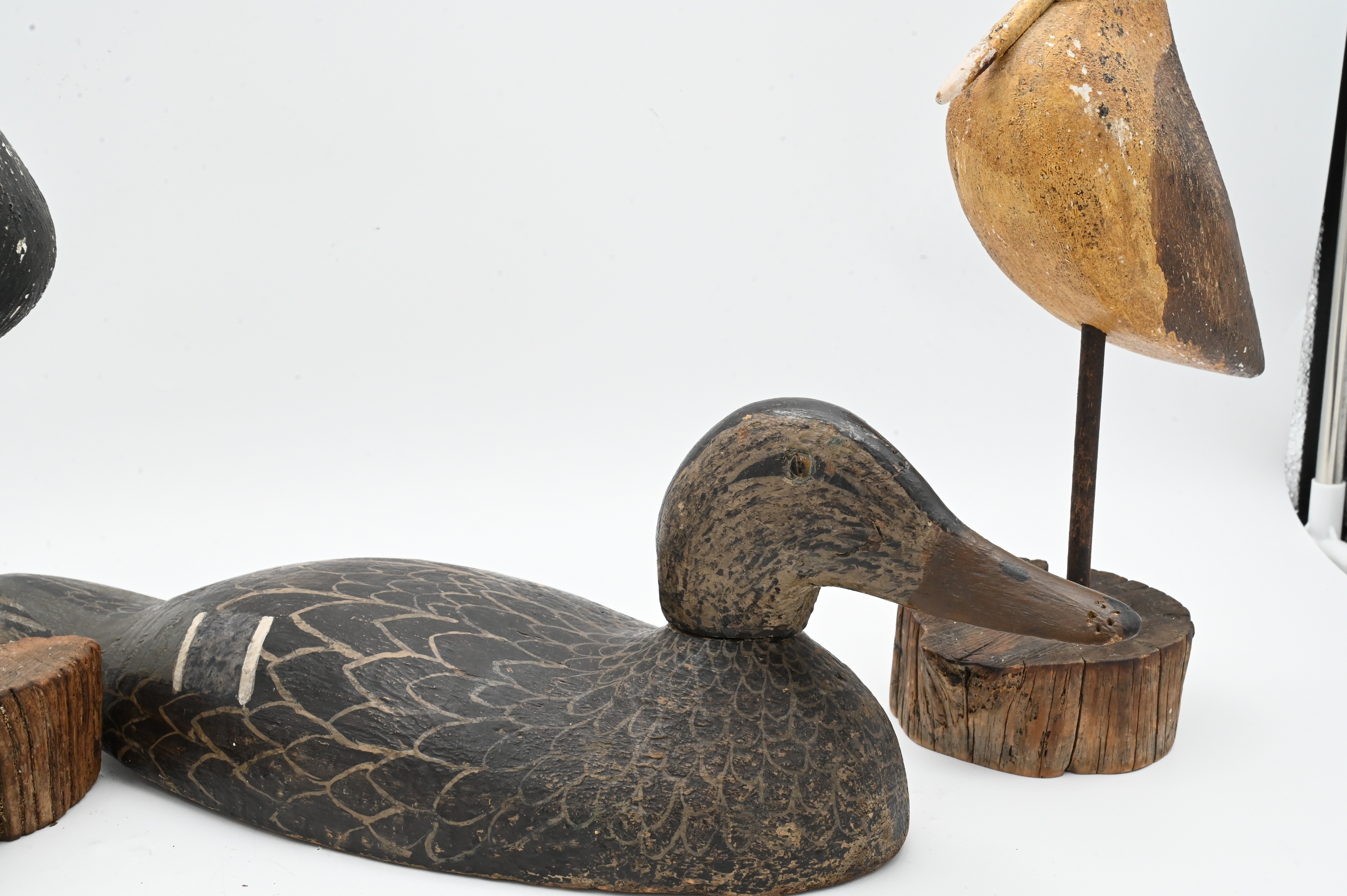to include two shore birds having glass eyes by Richard Morgan, along with two unsigned duck decoys having articulating heads