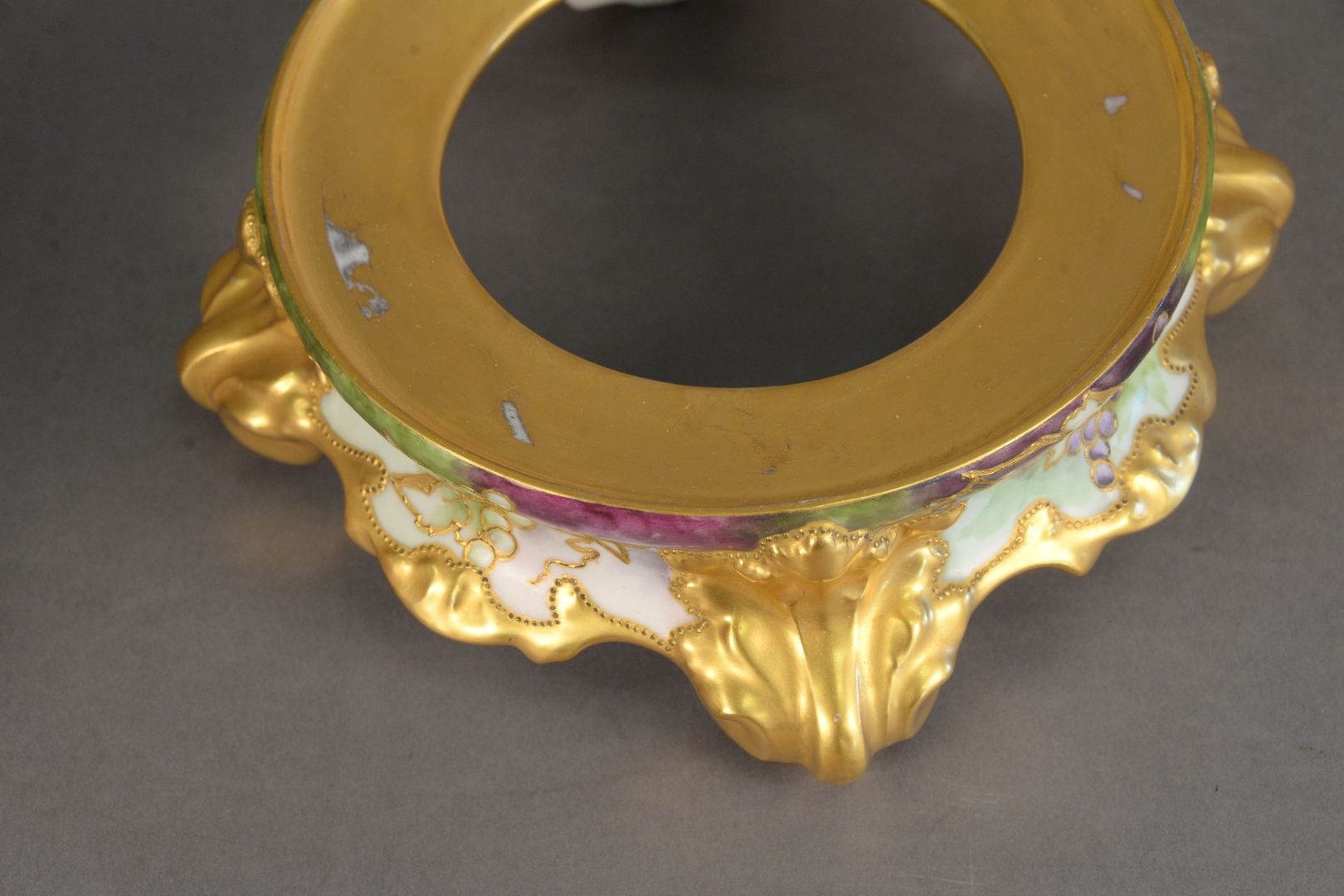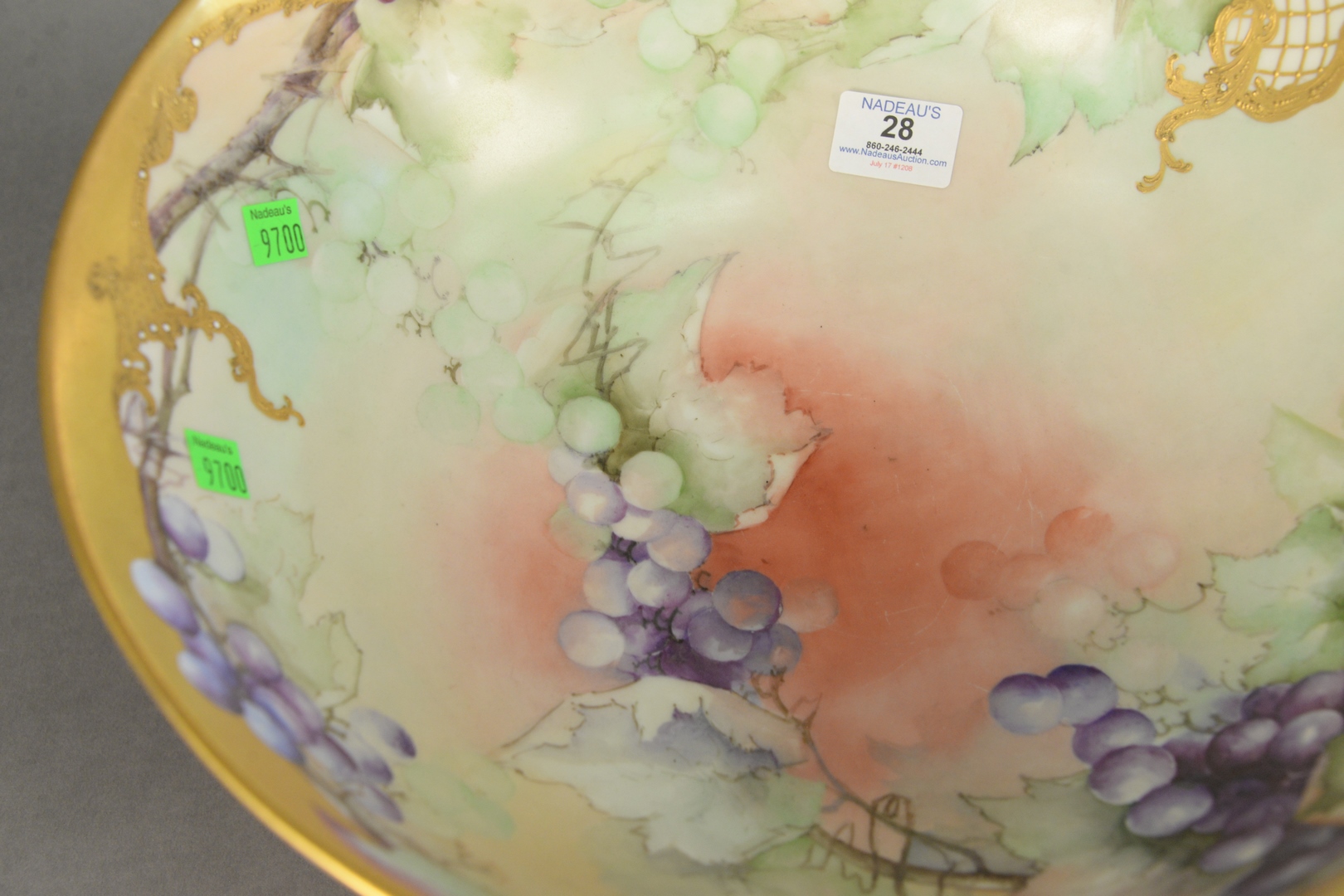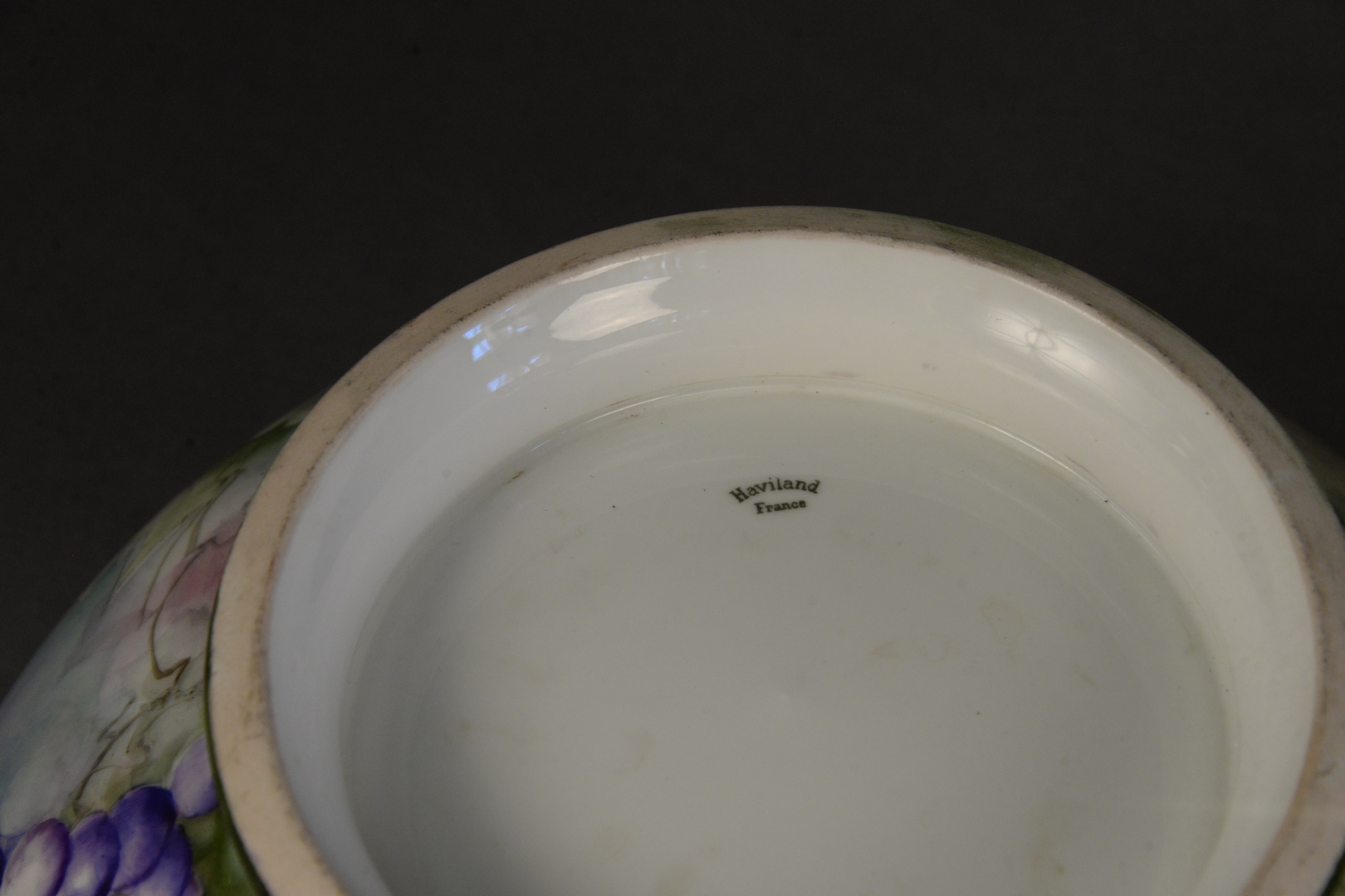 Lot 28: Haviland Porcelain Punch Bowl and Fitted Base, having grape decoration and gilt rim, marked to the underside, diameter 15 inches. Provenance: Estate of James Wadhams.
