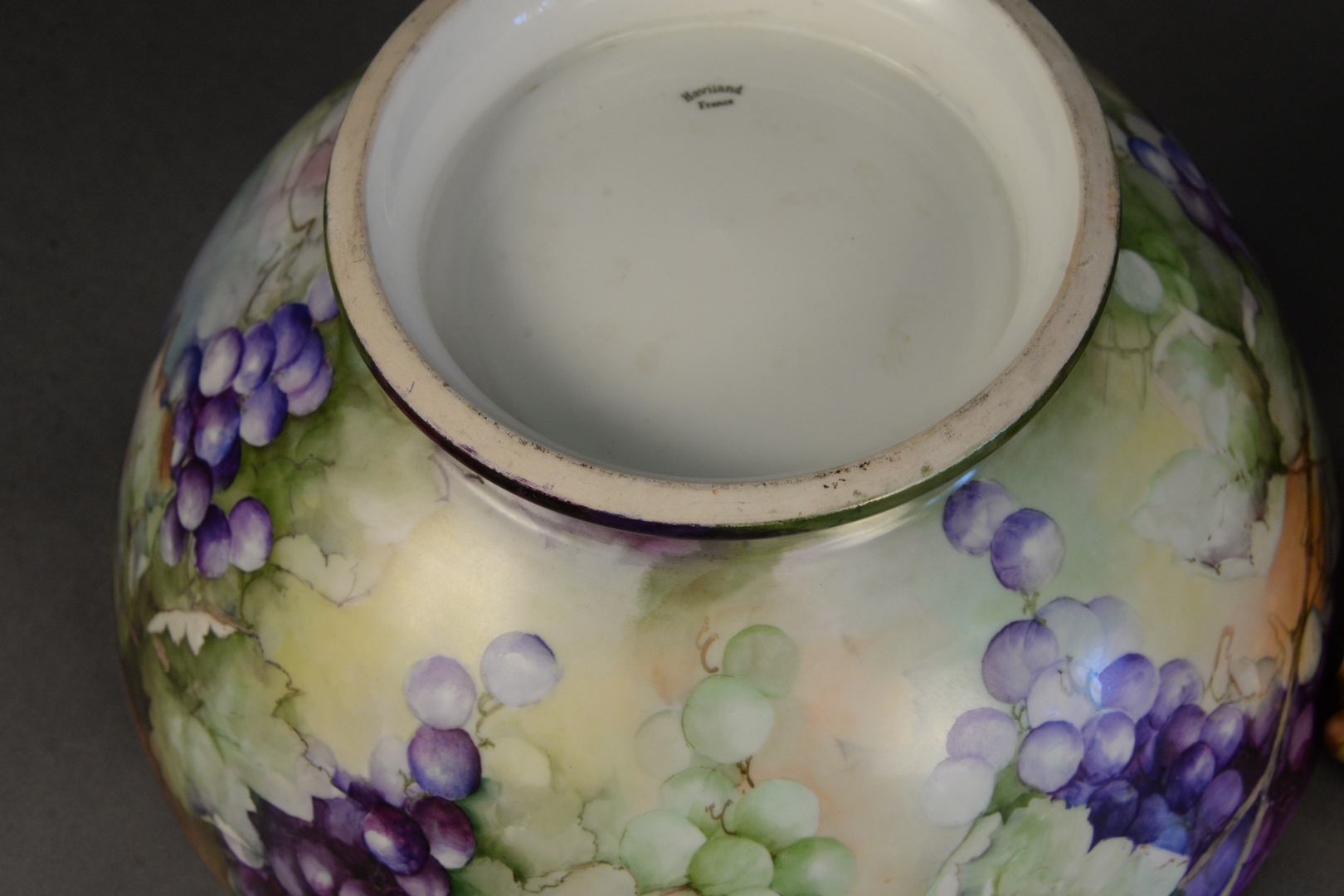 Haviland Porcelain Punch Bowl and Fitted Base, having grape decoration and gilt rim, marked to the underside, diameter 15 inches. Provenance: Estate of James Wadhams.