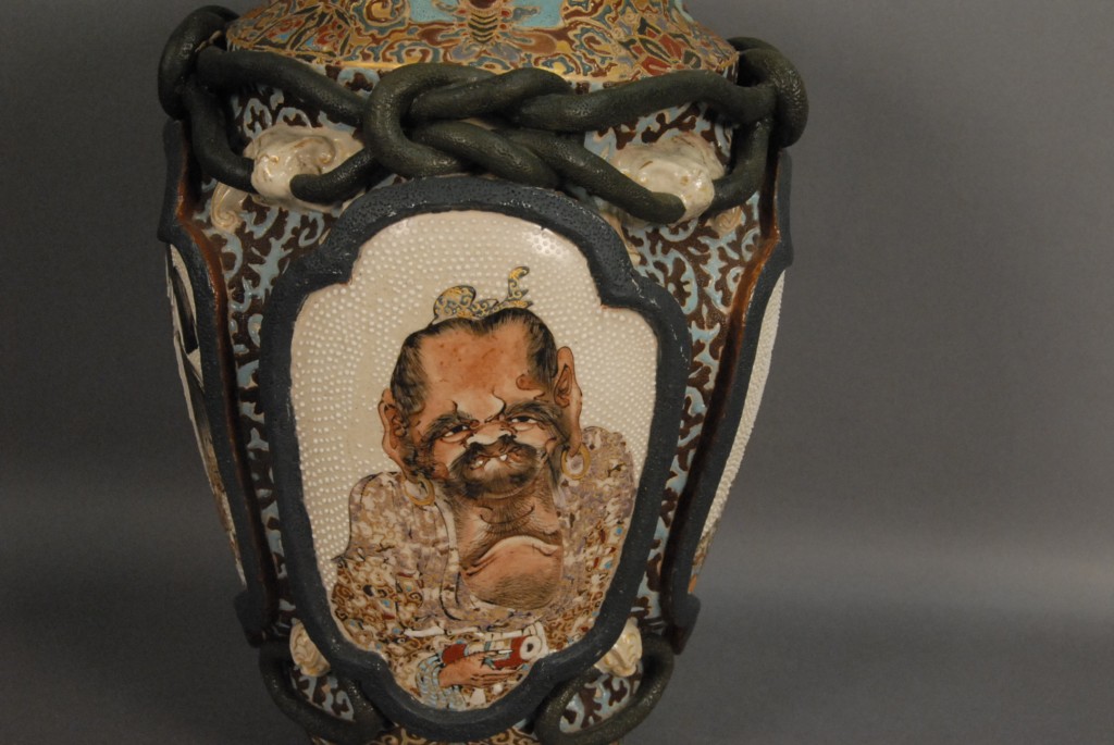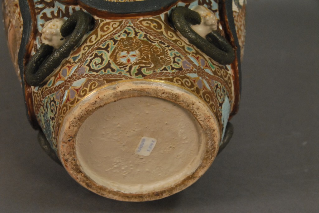 Lot 28: Large Satsuma warrior vase having four molded panels with painted warriors on them, and having molded bats in the corners, ht 13 1/2.