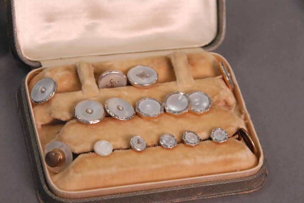 Seventeen piece set of cufflinks and buttons to include two pairs of cufflinks and several buttons 14kt gold backs, total weight 23.7 grams.