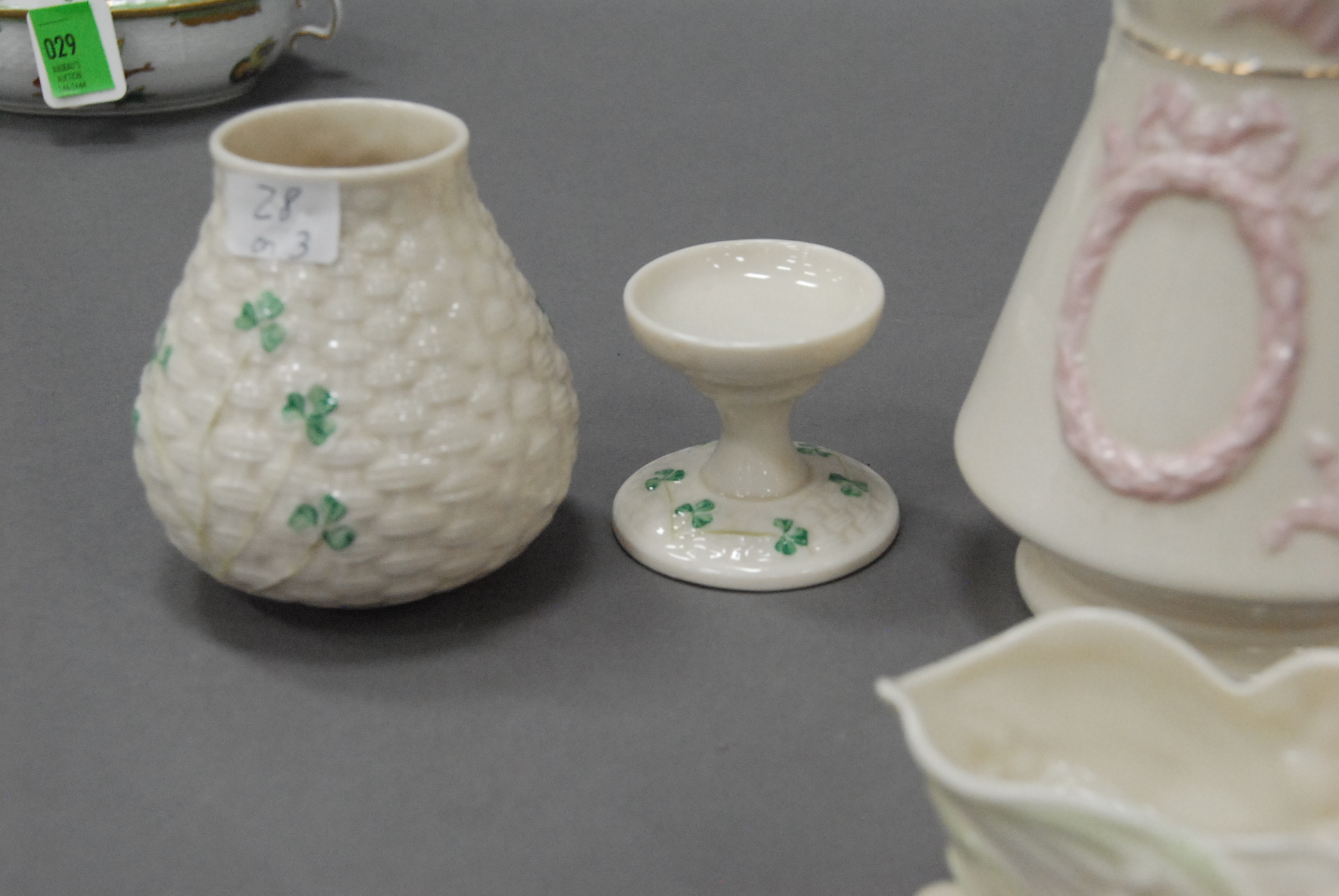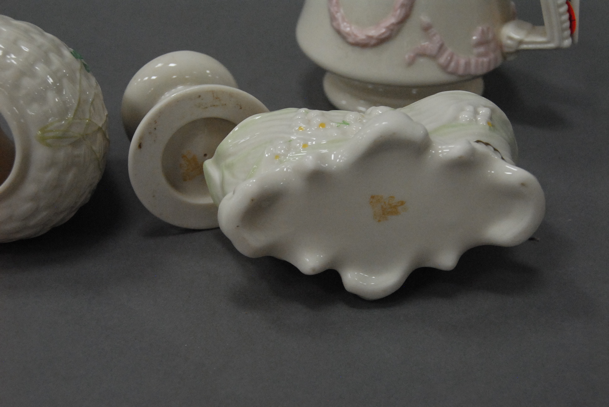 Three piece lot of Irish Belleek with a brown mark to include a pitcher, fairy lamp, and a small dish.