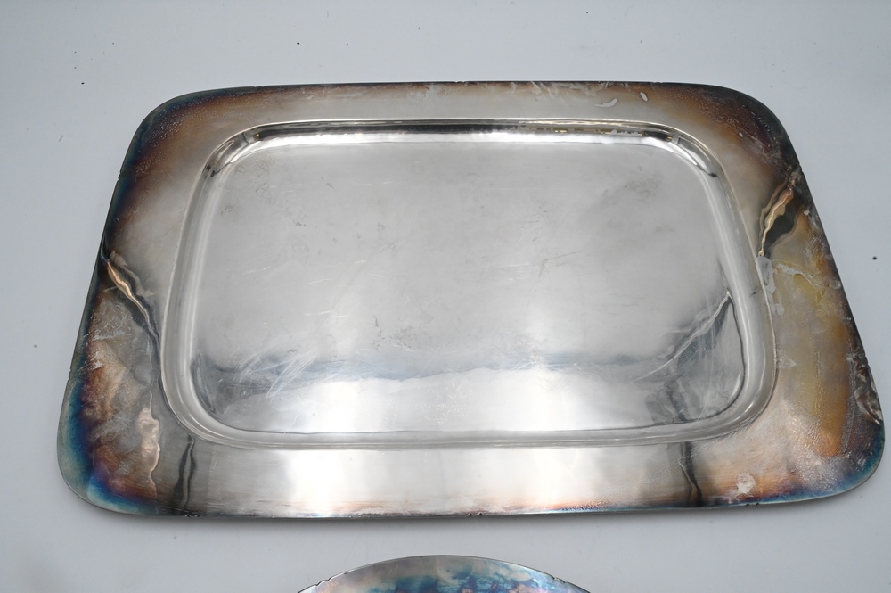 Two Dirk Van Erp Silver Plated Serving Pieces, large tray and large bowl, hand hammered, marked Handwrought Dirk Van Erp, San Francisco, tray length 22 inches.