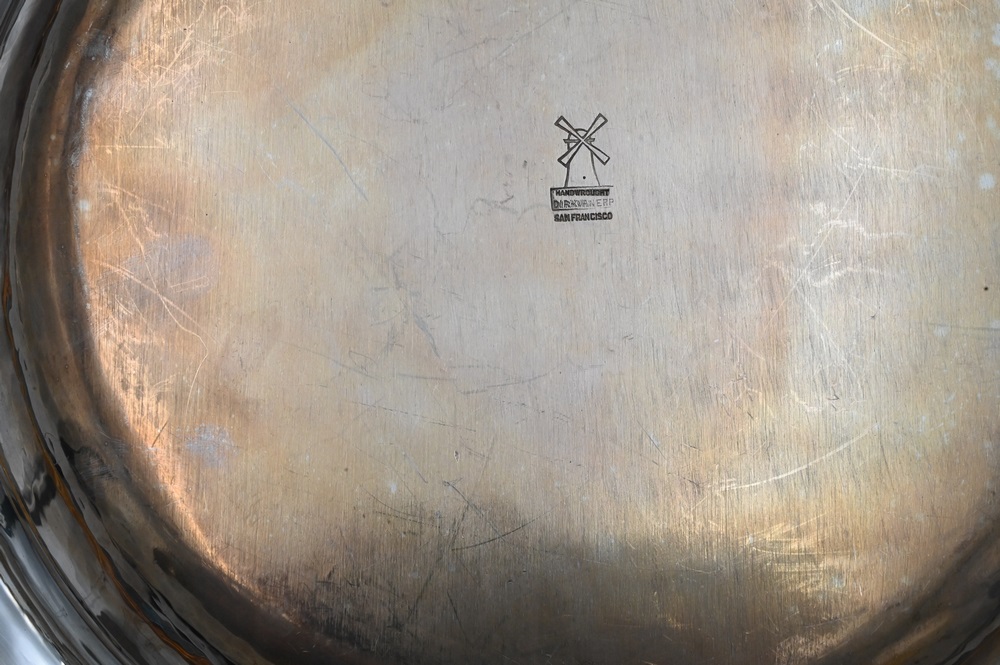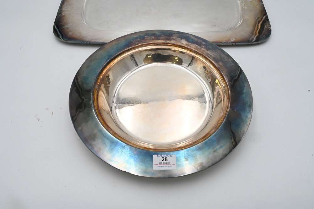 Lot 28: Two Dirk Van Erp Silver Plated Serving Pieces, large tray and large bowl, hand hammered, marked Handwrought Dirk Van Erp, San Francisco, tray length 22 inches.